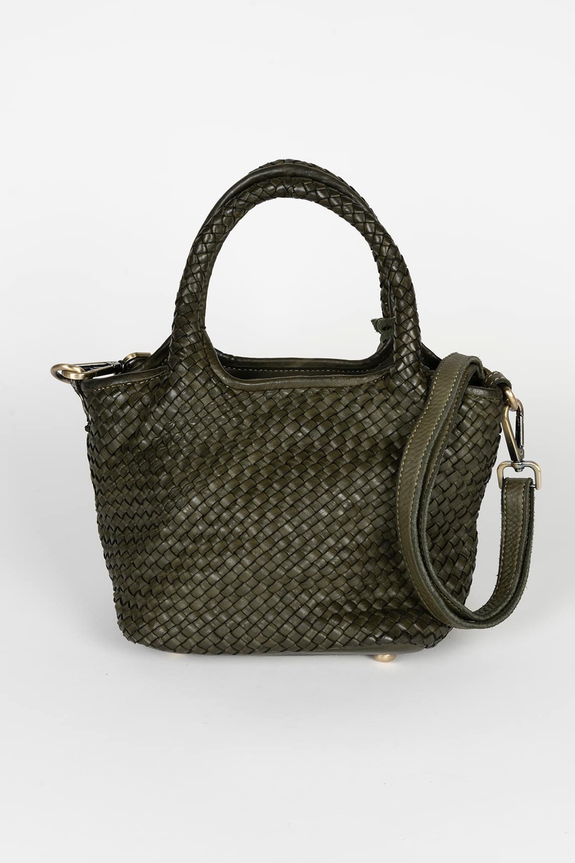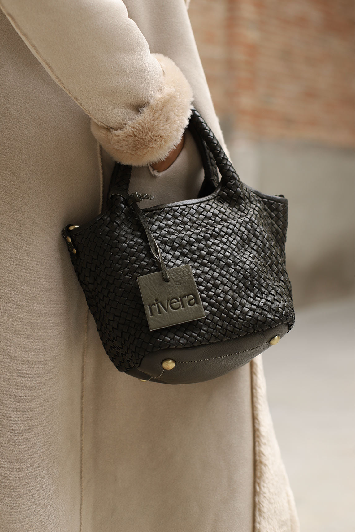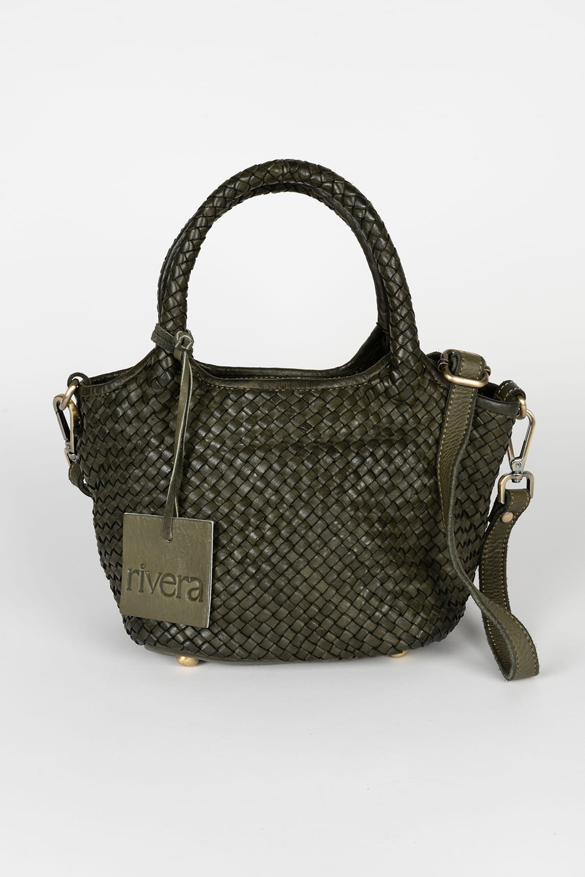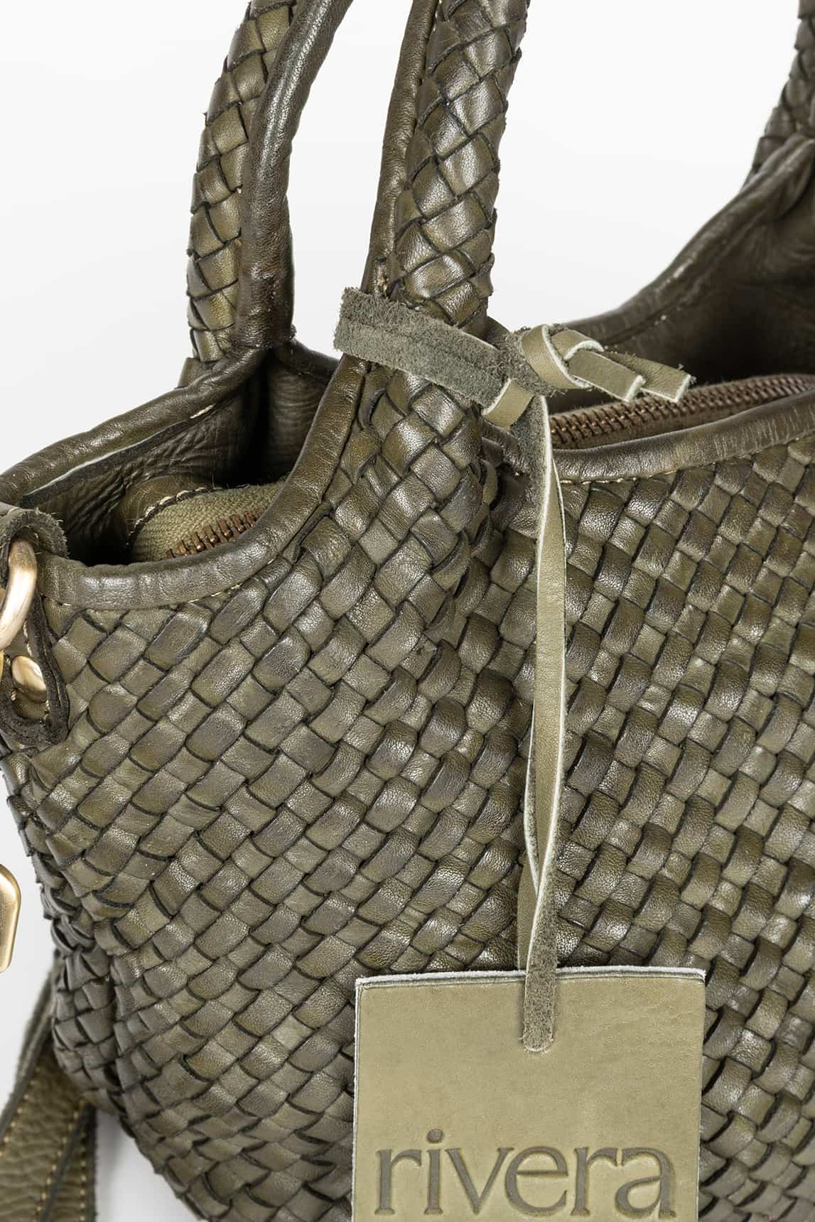 A bag crafted from high-quality braided leather in olive green, ideal for those seeking a balance of sophistication, texture, and functionality. The interlaced design enhances the visual richness of the material, adding depth and character.