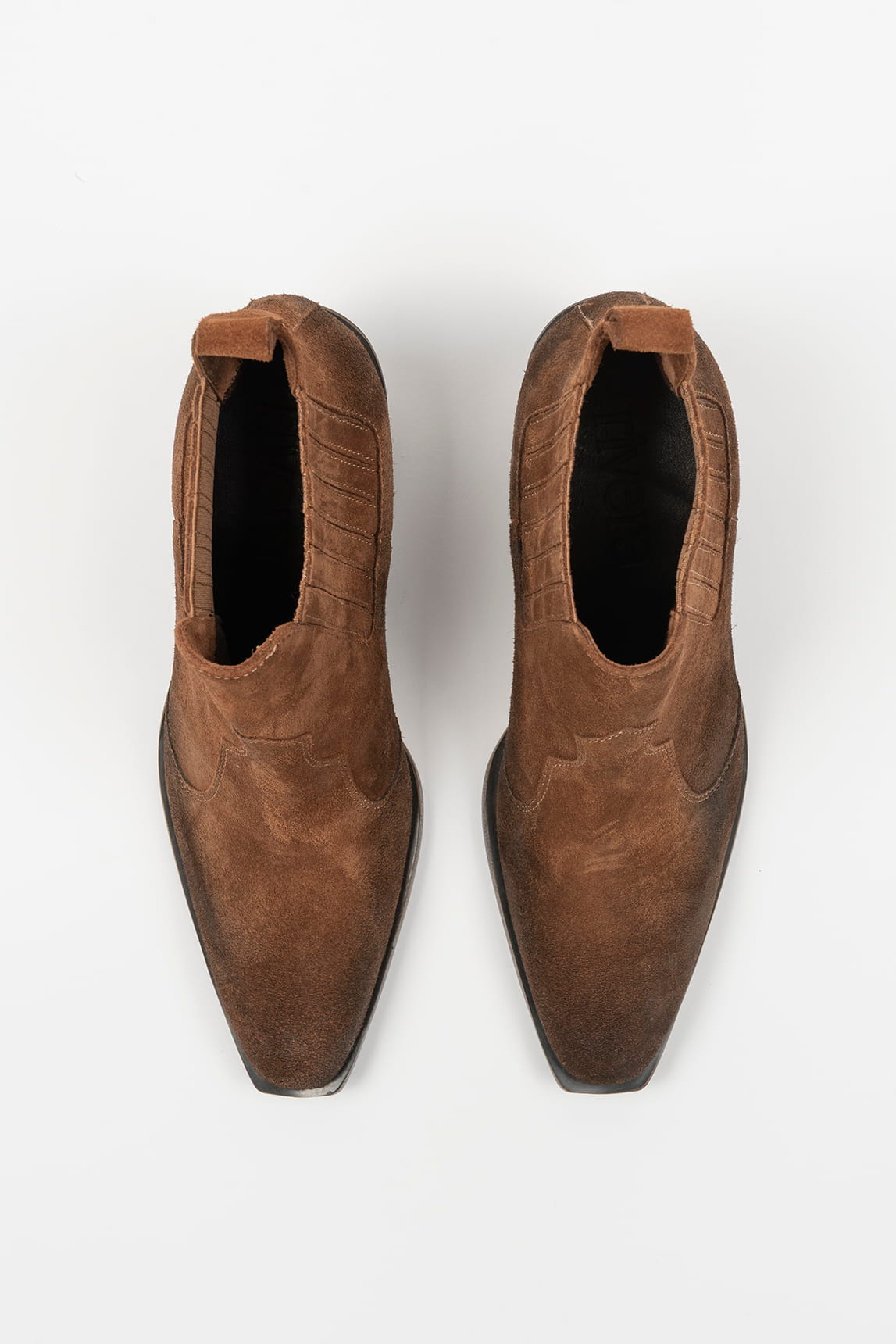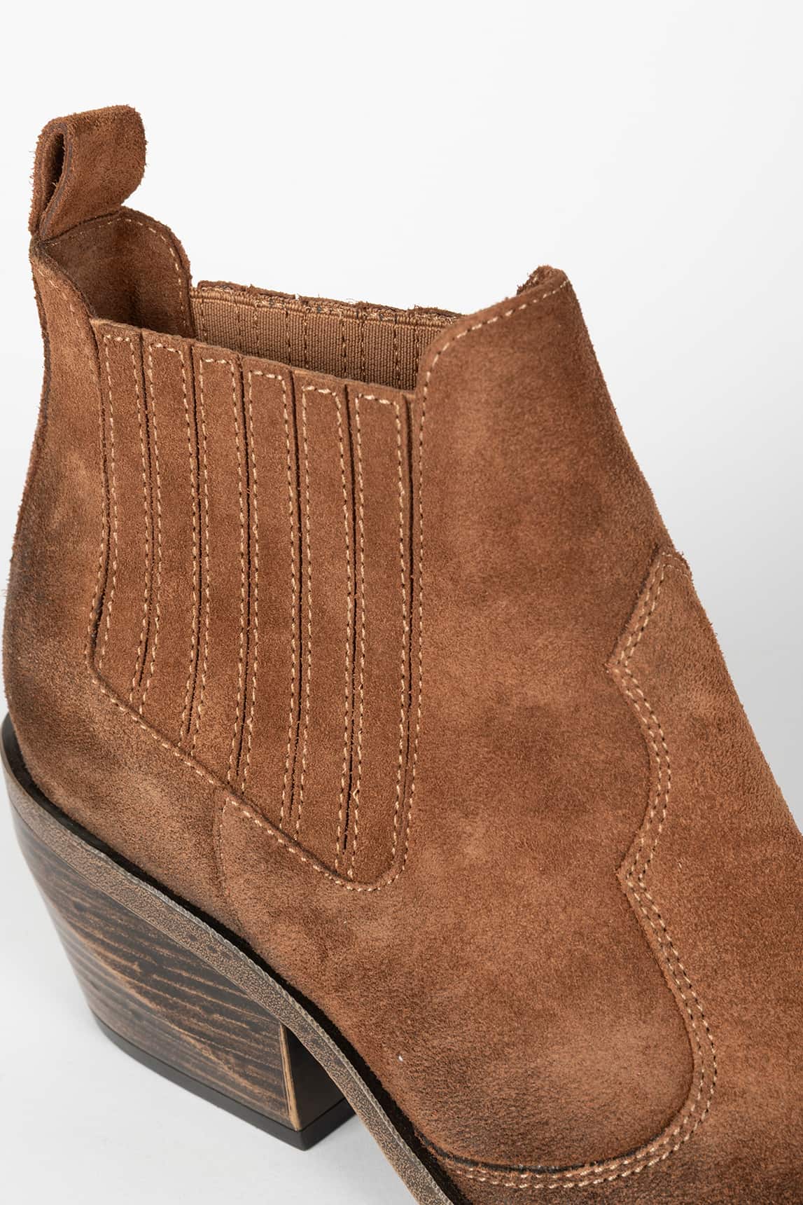 The Rivera cowboy-style boots in brown suede are the perfect balance between trend and tradition. Their Western-inspired design with bold stitching and a wooden heel lends a casual, authentic feel. The elastic side panels make them easy to slip on, while the slim toe adds elegance. Ideal for pairing with jeans, boho dresses, or midi skirts for a look with personality.