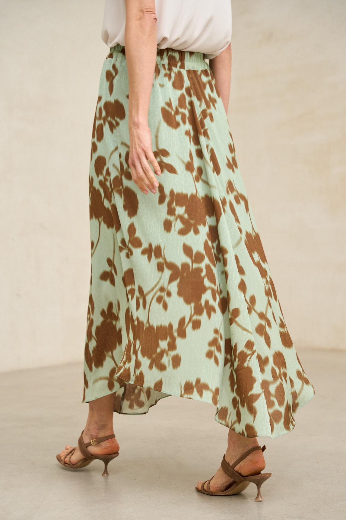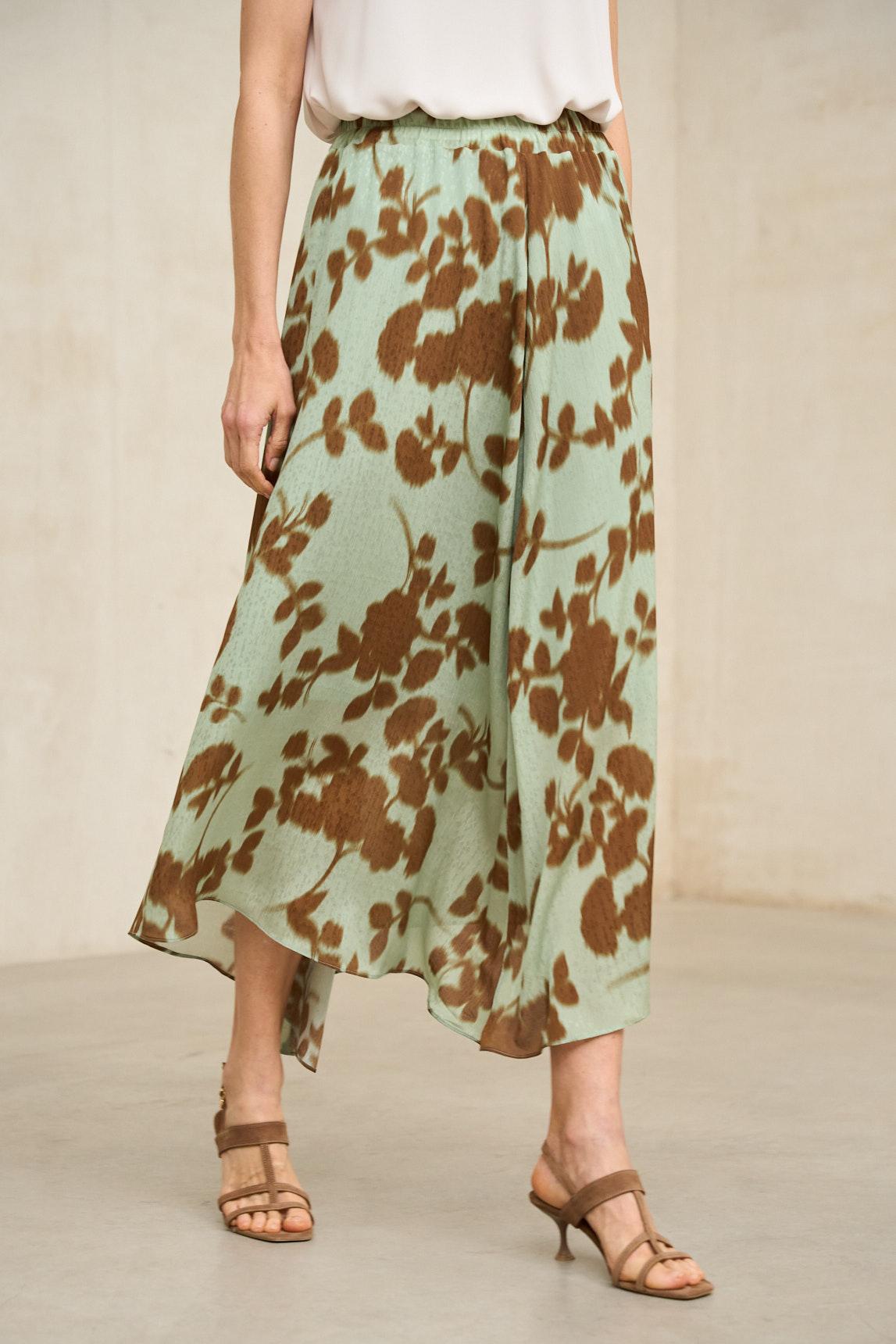 La Falda Ailén estampado verde salvia y marrón transmite naturalidad y serenidad. La combinación cromática la convierte en una opción ideal para estilismos luminosos, combinada con blusas en blanco roto, beige o verde oliva.