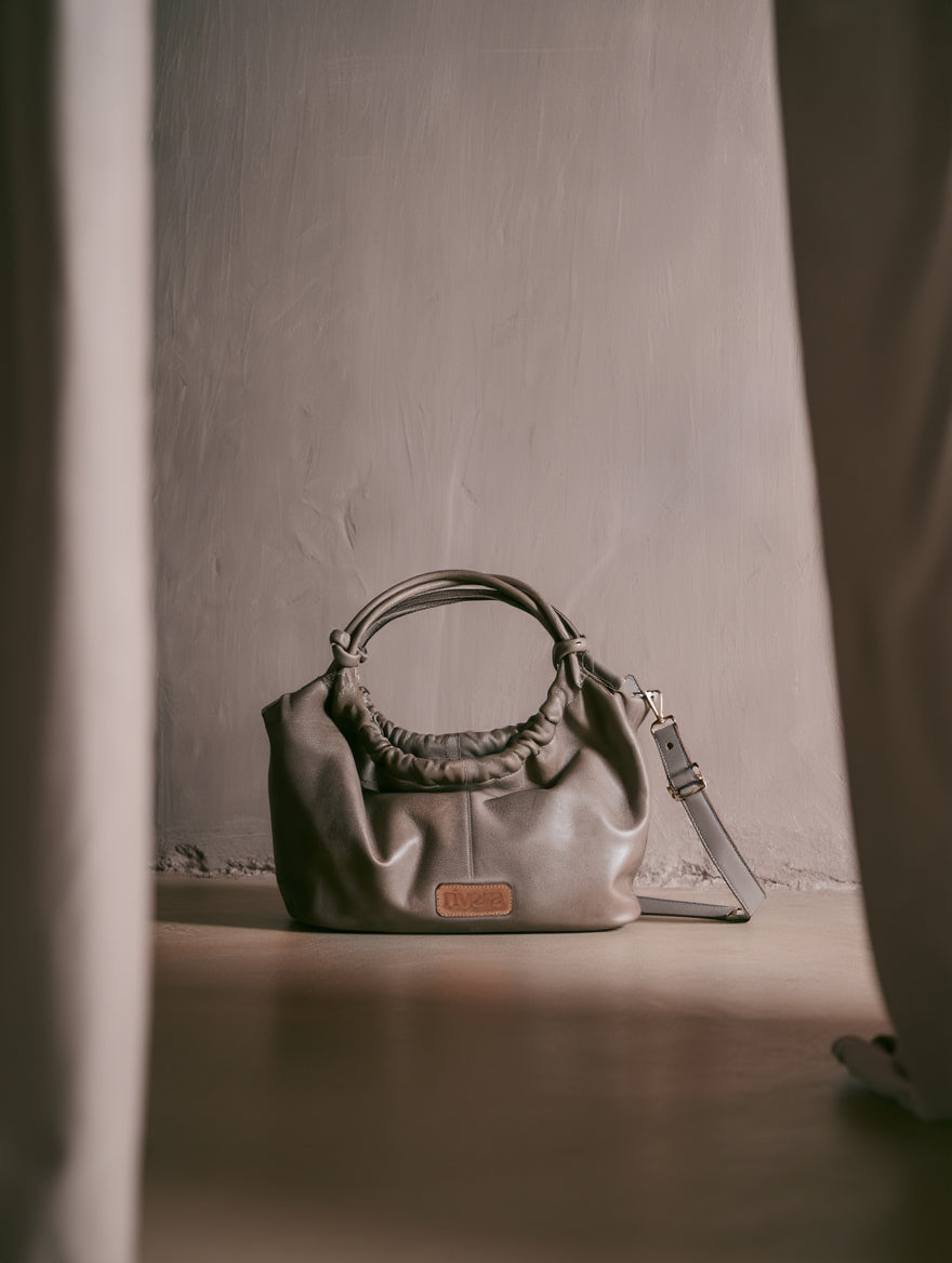 - Taupe leather handbag with a soft finish and a slightly aged look.