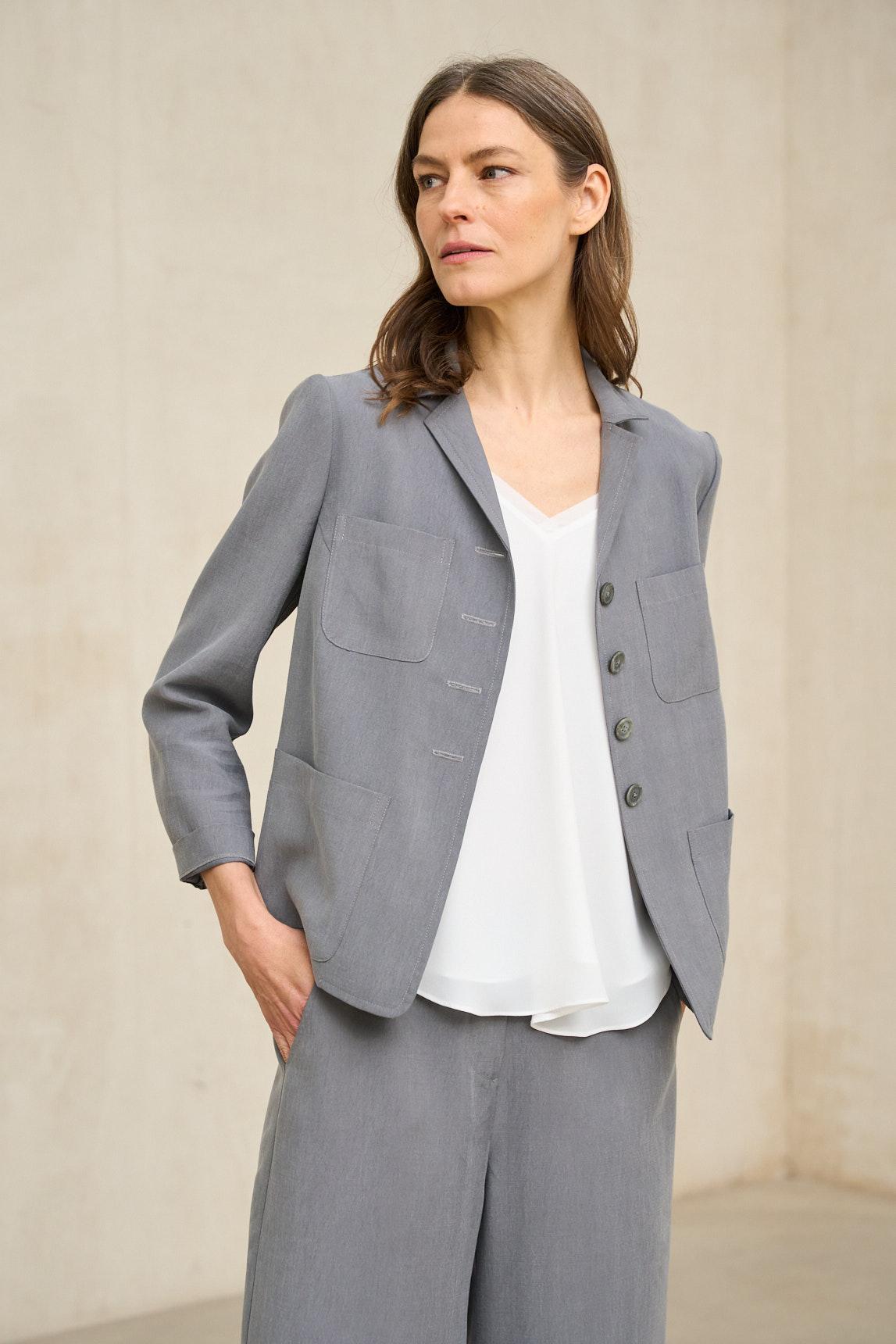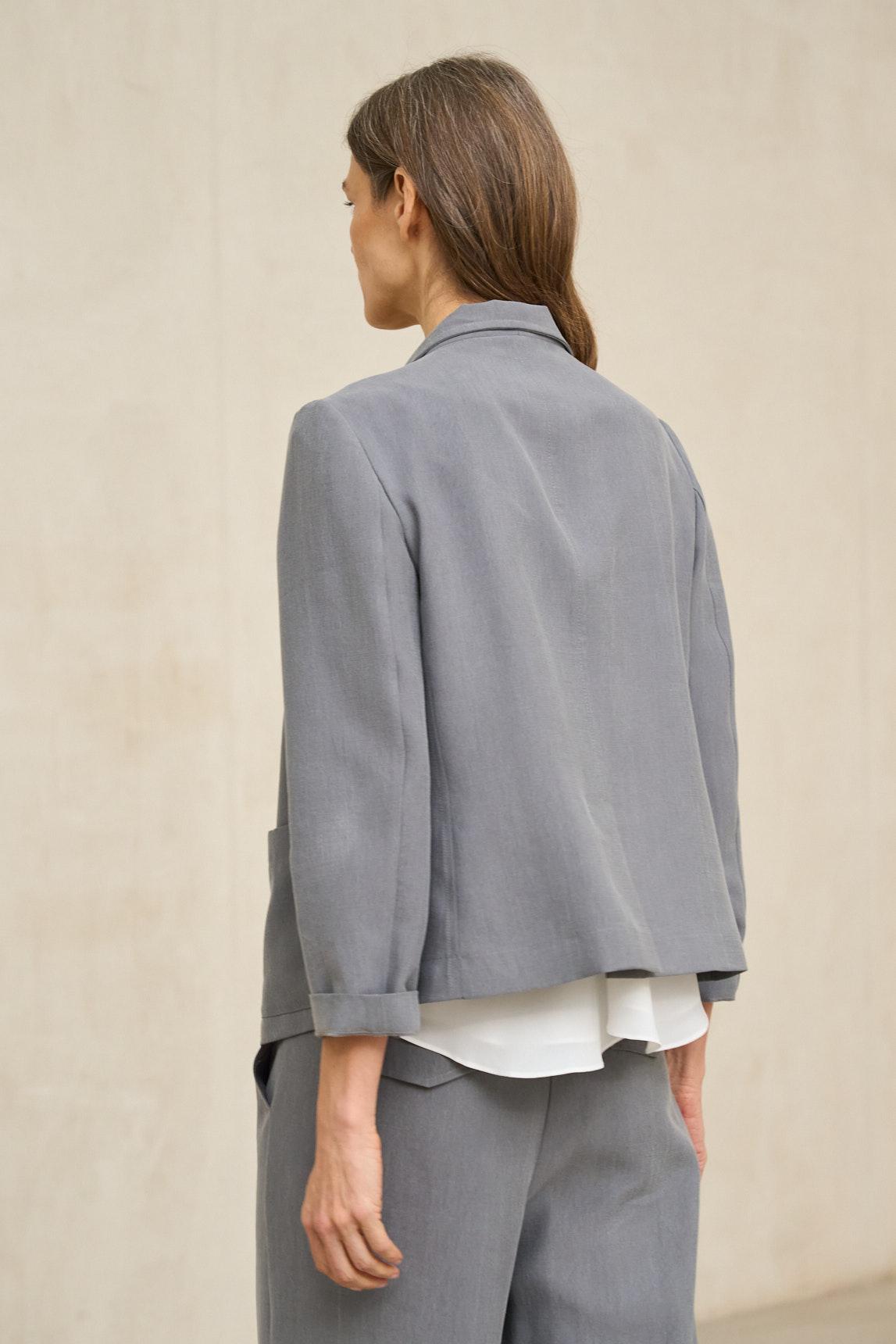 Chaqueta de mujer confeccionada en tejido con textura arrugada de aspecto natural. Cuello con solapa y cierre frontal con botones al tono. Dispone de bolsillos delanteros de plastrón que aportan equilibrio visual y funcionalidad. Su manga larga y su estructura ligera permiten un movimiento cómodo y fluido.