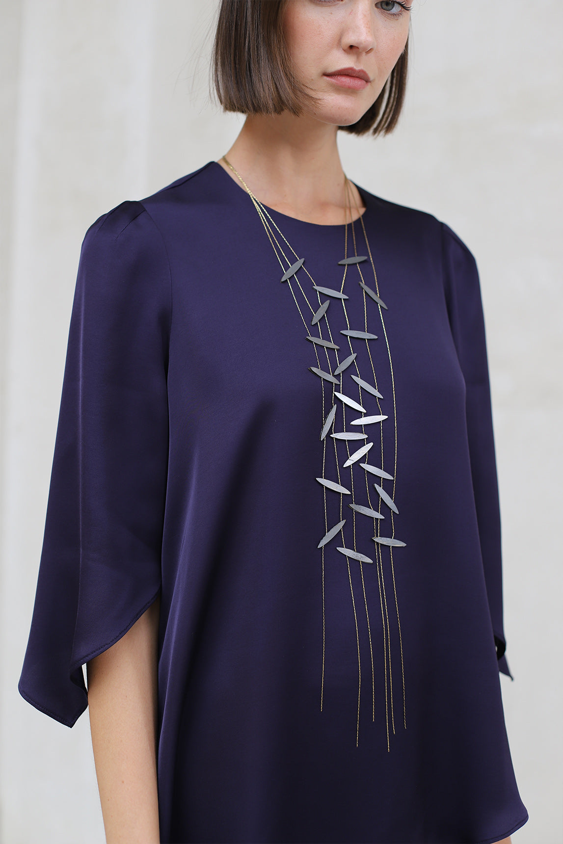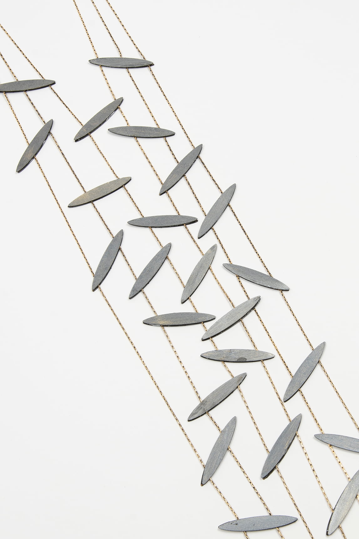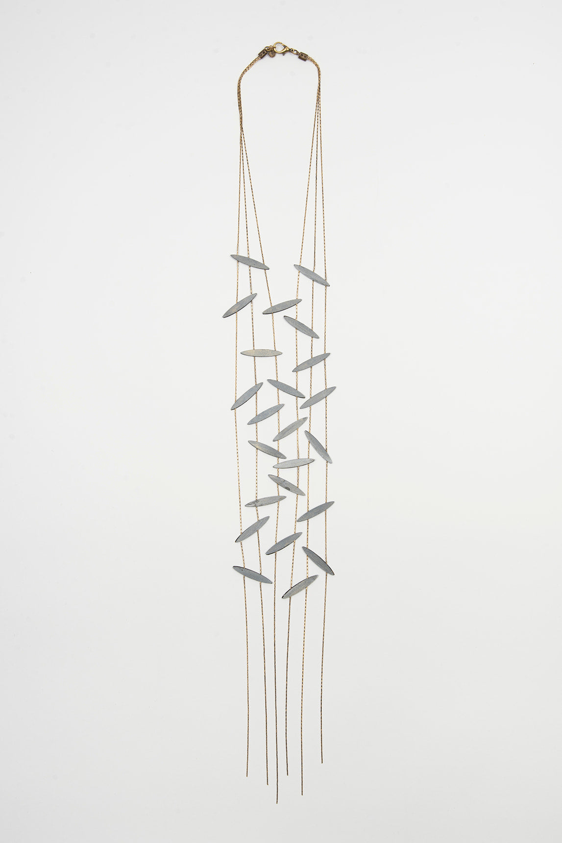 This long necklace stands out for its structure of multiple cascading golden threads, decorated with capsule-shaped silver hardware. Its ethereal and sophisticated design adds movement and subtle shine to any outfit, making it the ideal complement to monochrome styles, loose shirts, or flowing dresses. A versatile piece that provides an artistic and modern feel with a handcrafted touch.