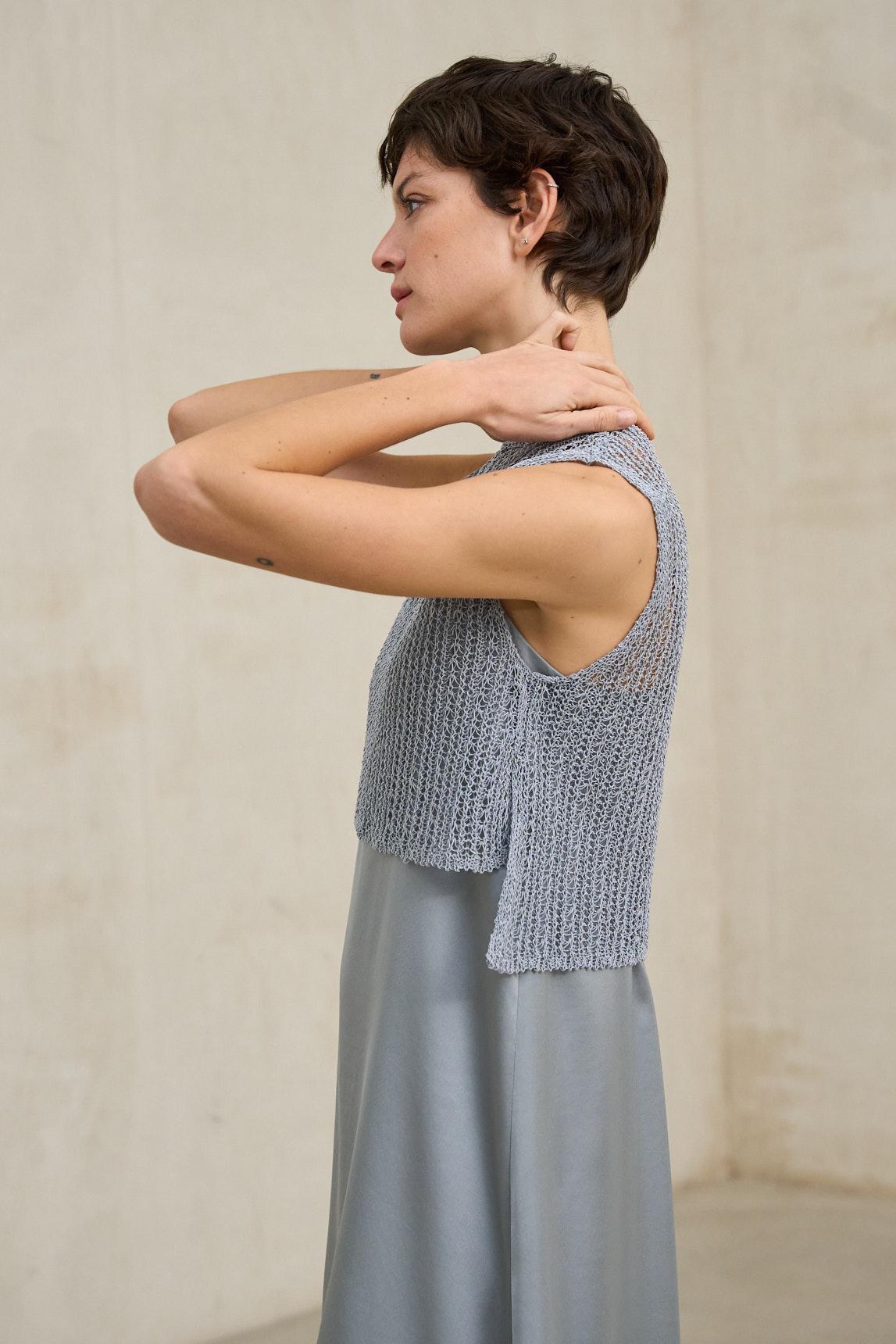 El chaleco Erya azul acero es una prenda ligera confeccionada en punto de textura abierta que aporta un efecto delicado y etéreo al diseño. Su trama semiabierta crea un sutil juego de capas, dejando entrever ligeramente la prenda interior, por lo que se recomienda combinarlo con un top base o camiseta lisa (no incluido).