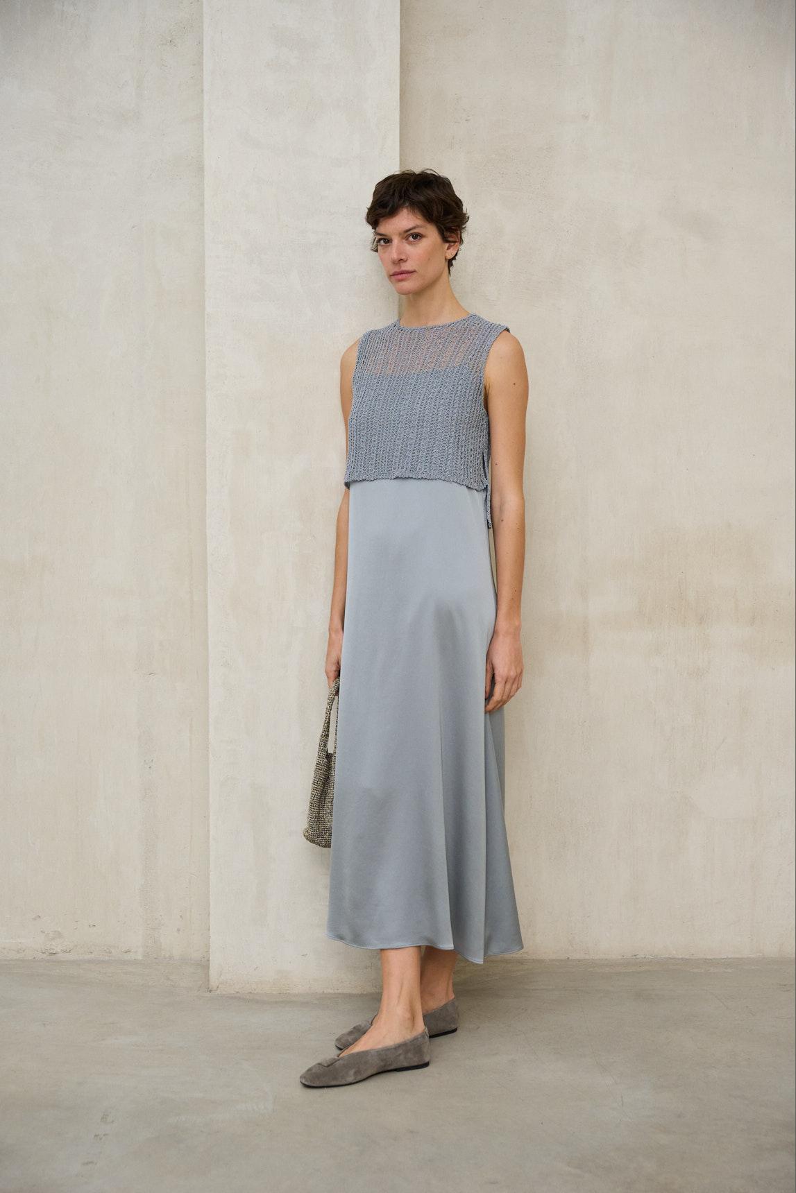 Presenta cuello redondo y diseño sin mangas, con una silueta recta y limpia que equilibra la textura del tejido. Su estructura ligera lo convierte en una pieza ideal para superposición, aportando profundidad visual sin añadir peso al conjunto.