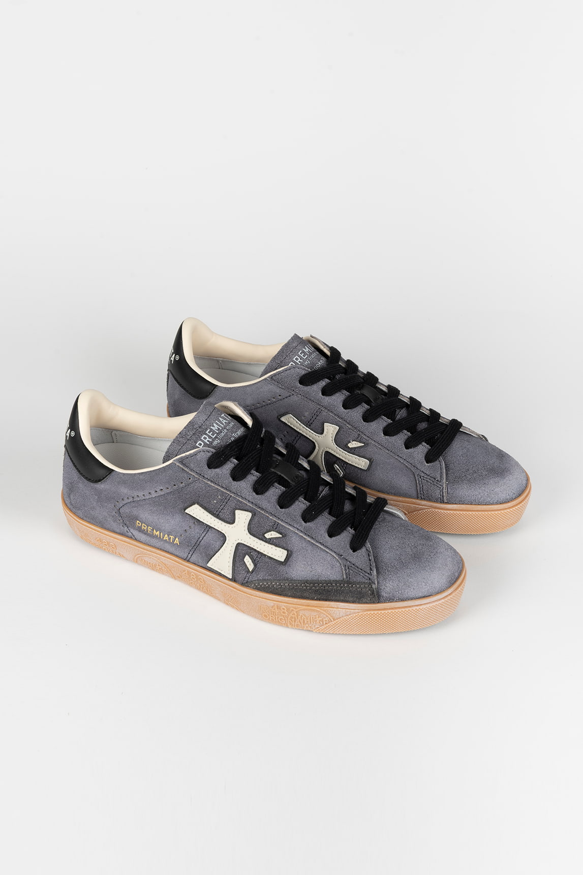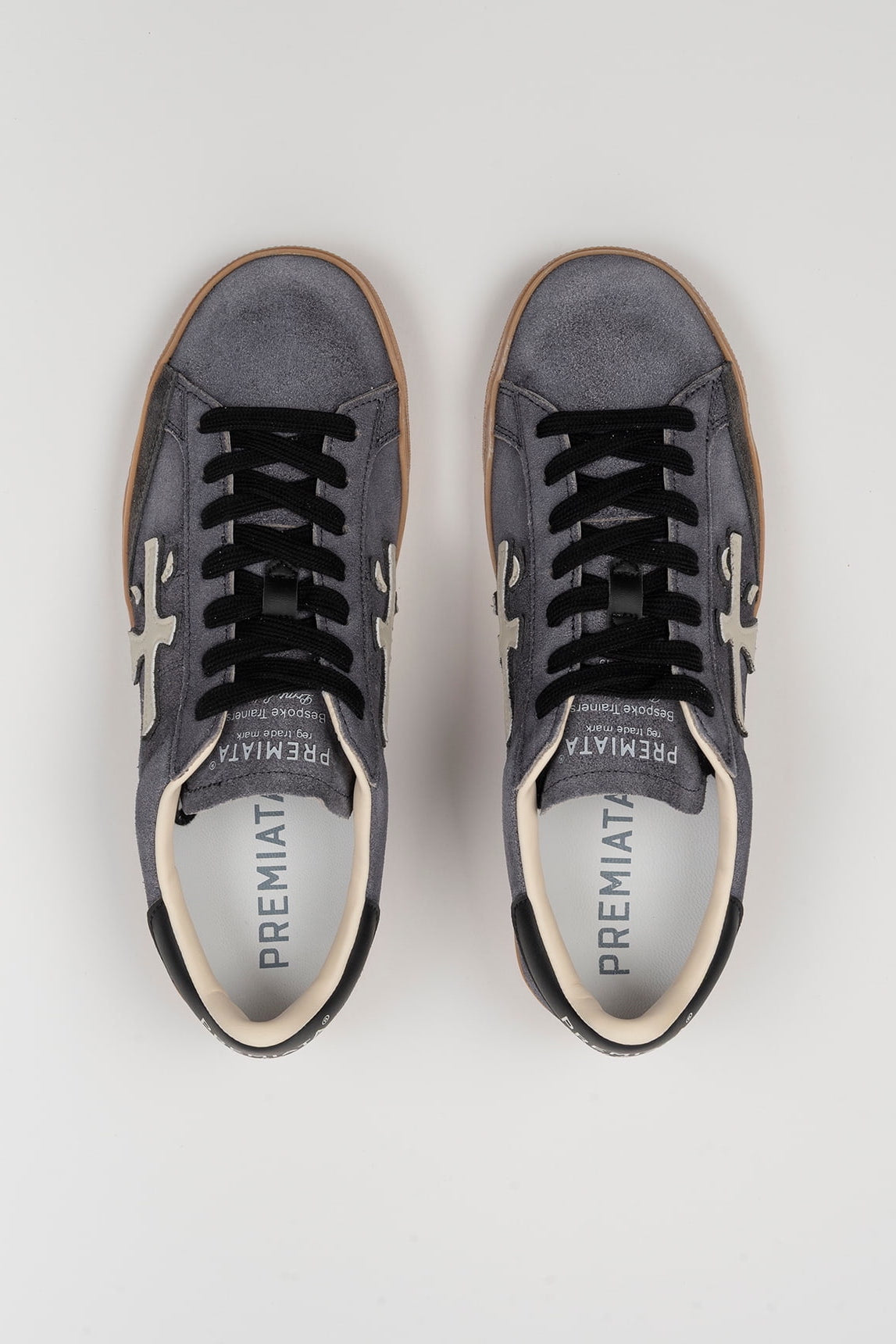Las Steven 6974 de Premiata apuestan por la sencillez premium: ante azul, logo blanco y suela caramelo que combinan con todo. Perfectas para looks casual de diario con vaqueros, chinos o sastrería relajada.