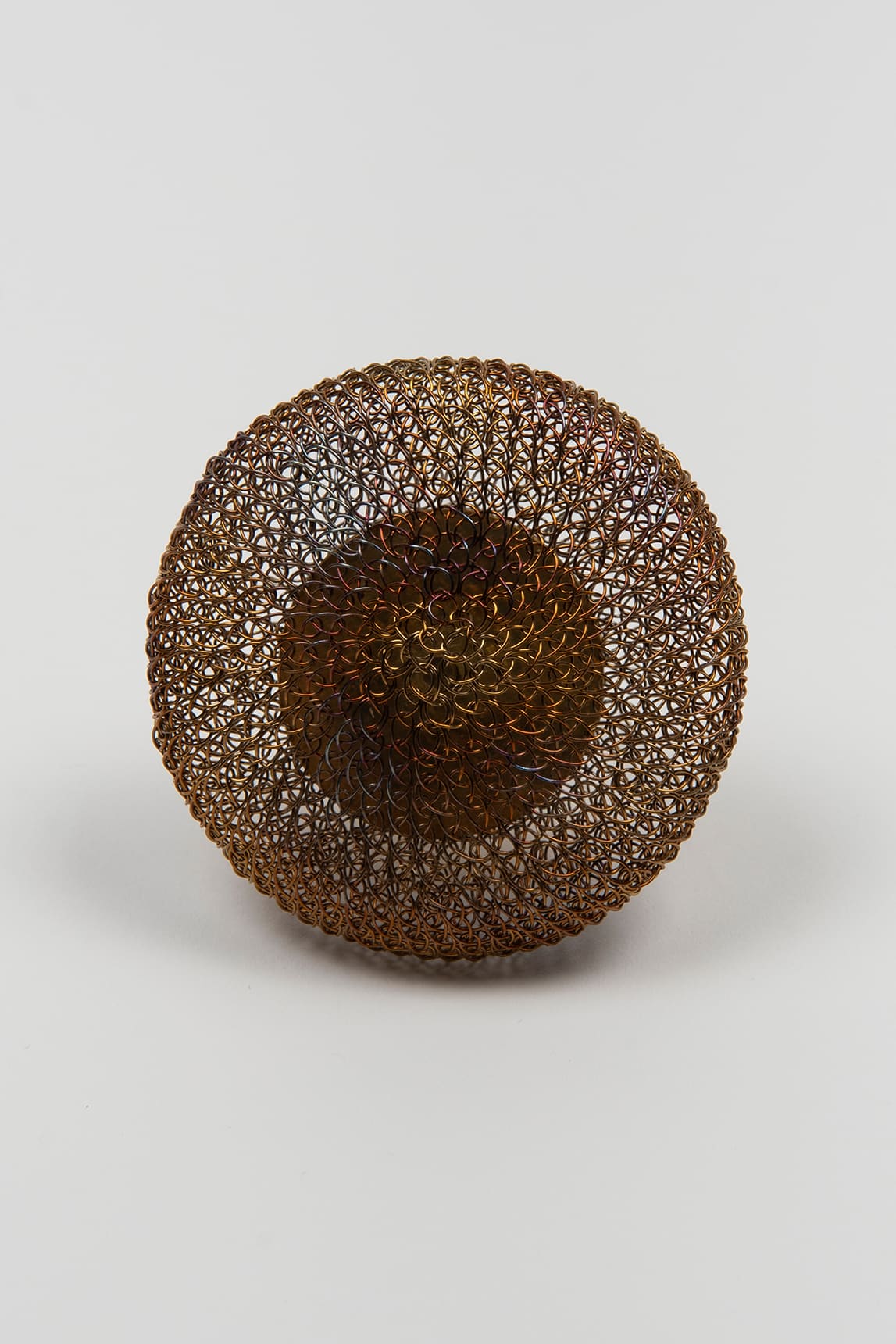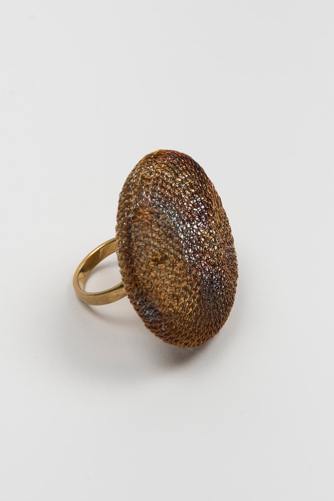 The Ginevra de Rivera ring features a unique structure with a large circular woven metal ornament in warm tones such as copper, bronze, and antique gold. The center of the ring is slightly convex, highlighting the intertwined texture that gives it a bohemian and vintage style. The base and ring are made of gold-plated metal, perfectly complementing the central design. Ideal for those seeking a striking piece of jewelry with character and a touch of artisanal originality.