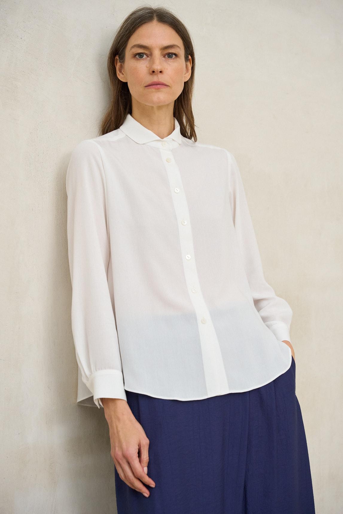 It features a classic shirt collar with a slightly open neckline and a discreet front closure. The long sleeves incorporate a contrasting turned-up cuff, providing a subtle detail that enriches the design without losing sobriety. The rounded shirt-style hem softens the silhouette and allows it to be worn both tucked in and untucked.