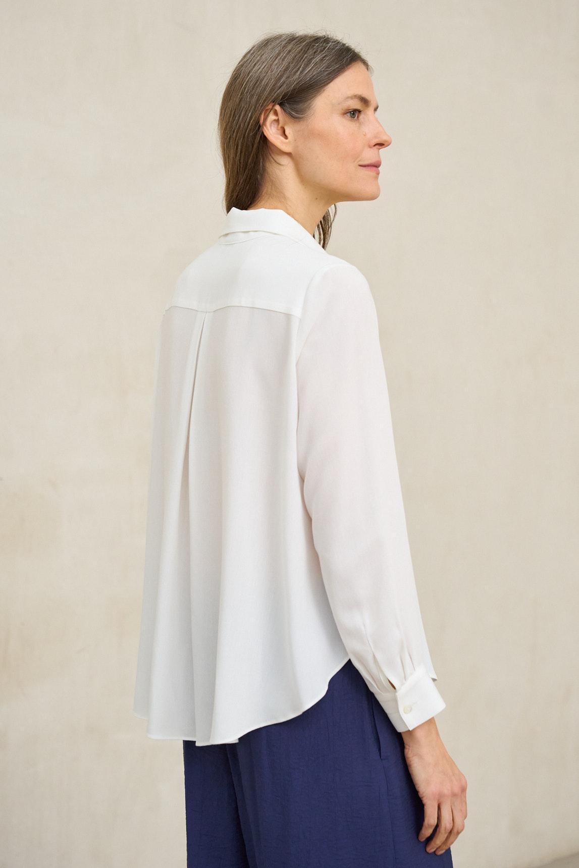The Elira white blouse is an elegant and minimalist garment, made from a lightweight, flowing fabric that adds movement and sophistication to any outfit. Its clean and structured design makes it a versatile and timeless piece.