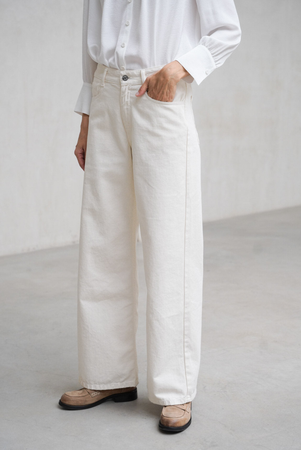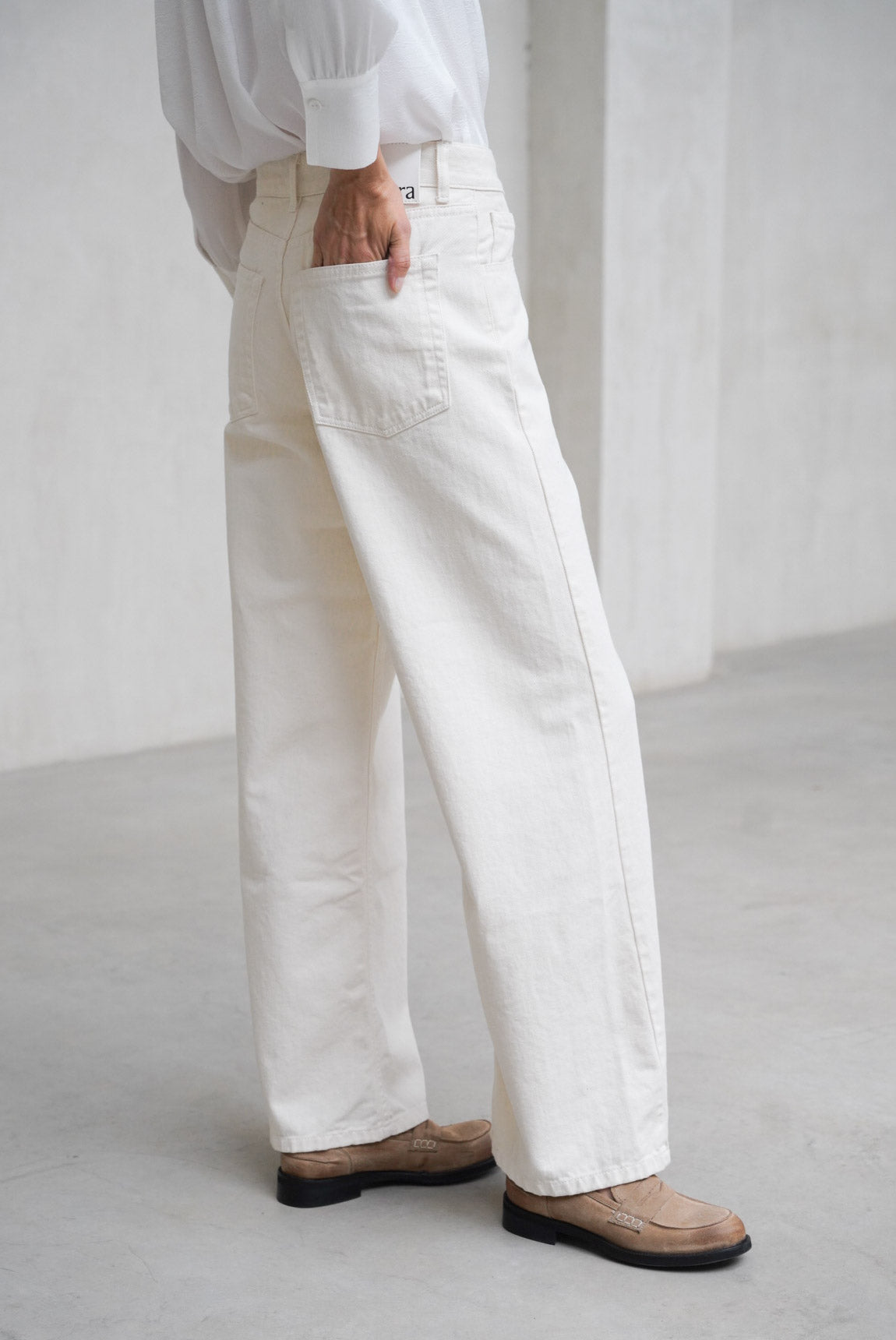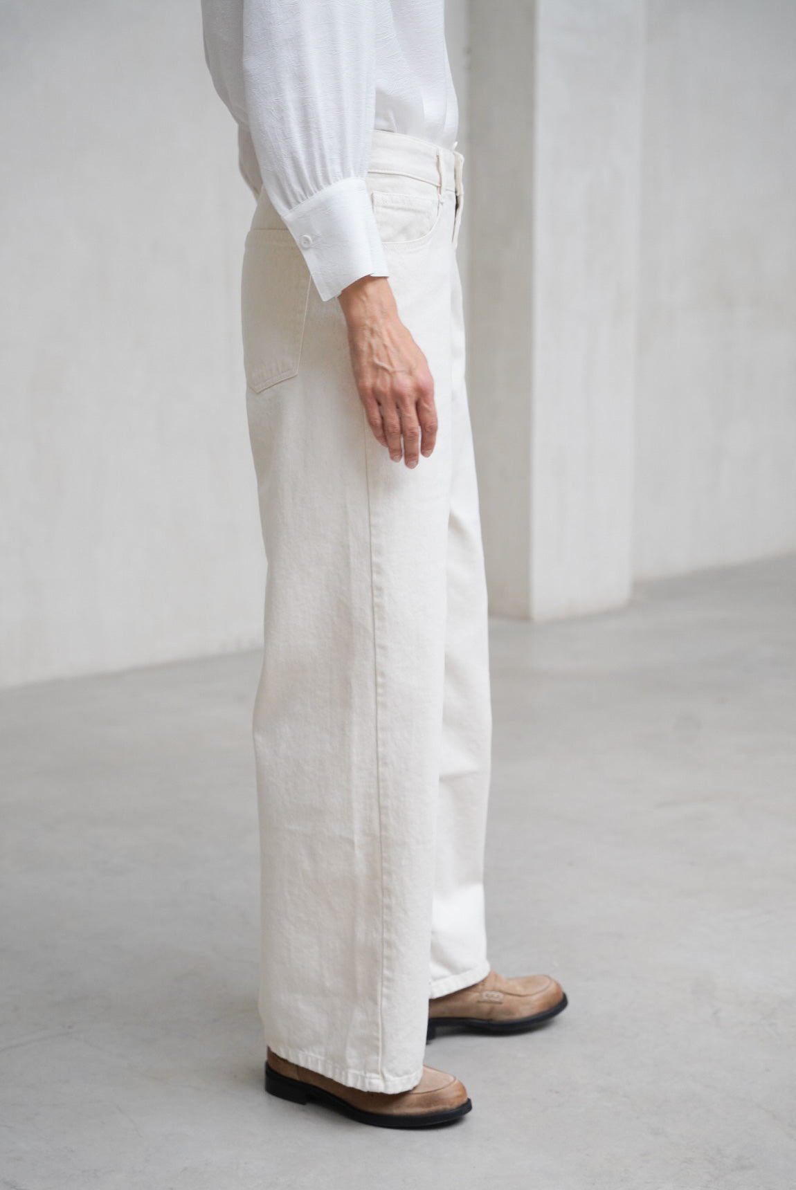 - Straight leg jeans in ecru.