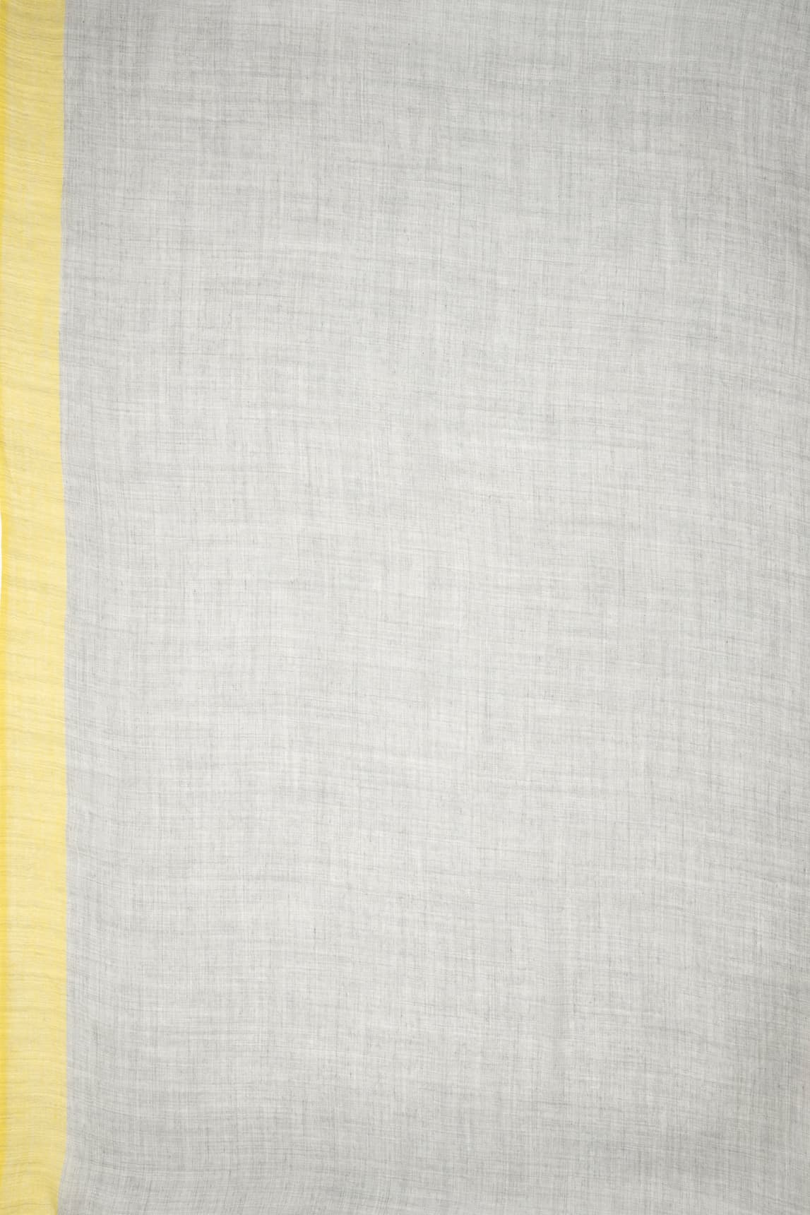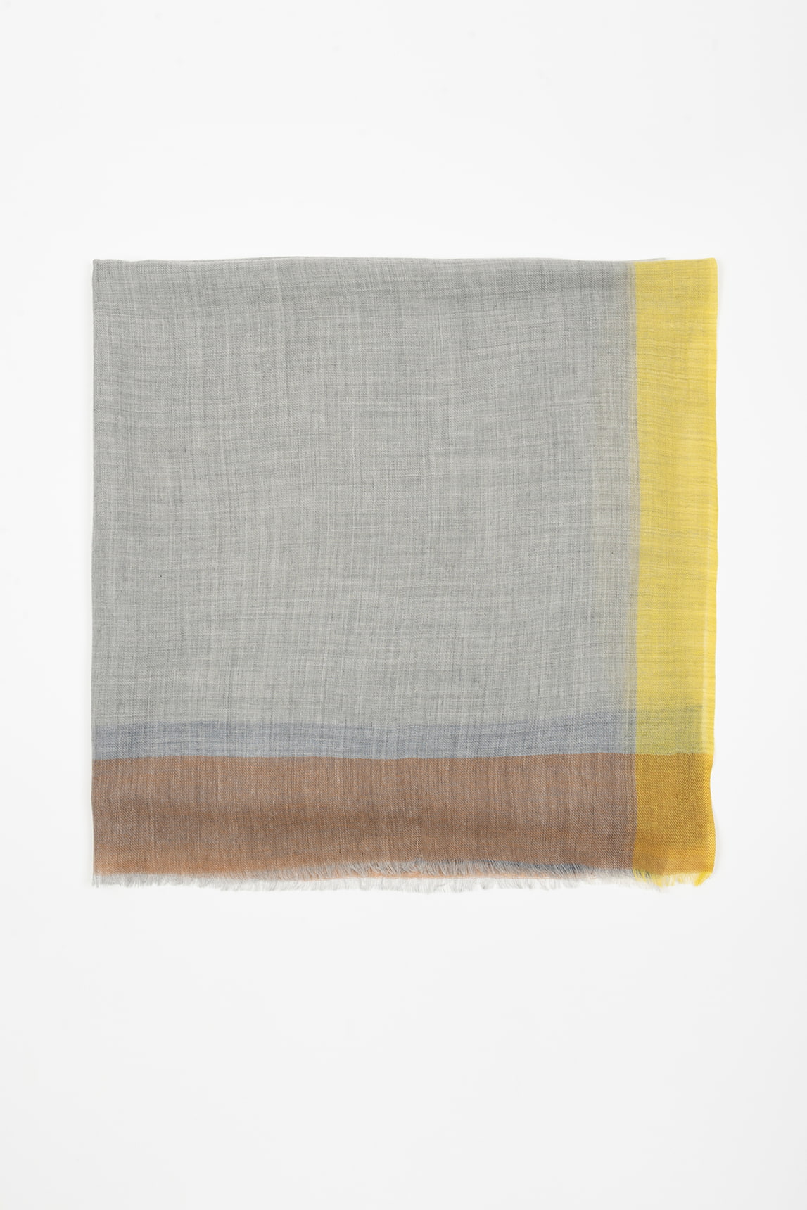 - Tricolor scarf in light gray, washed blue and soft yellow.