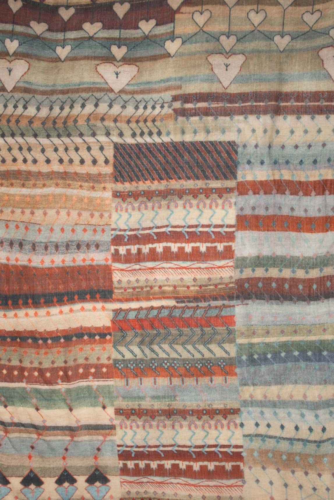 Explore bohemian style with the Rivera scarf, featuring an ethnic and abstract print. Its visual composition, rich in graphic details and organic lines, combines warm tones like tile and sand with deep hues like petrol blue and olive green. Ideal for adding texture and color to neutral-toned looks, its enveloping weave makes it a functional piece for fall and winter. Frayed fringes enhance its handcrafted finish.