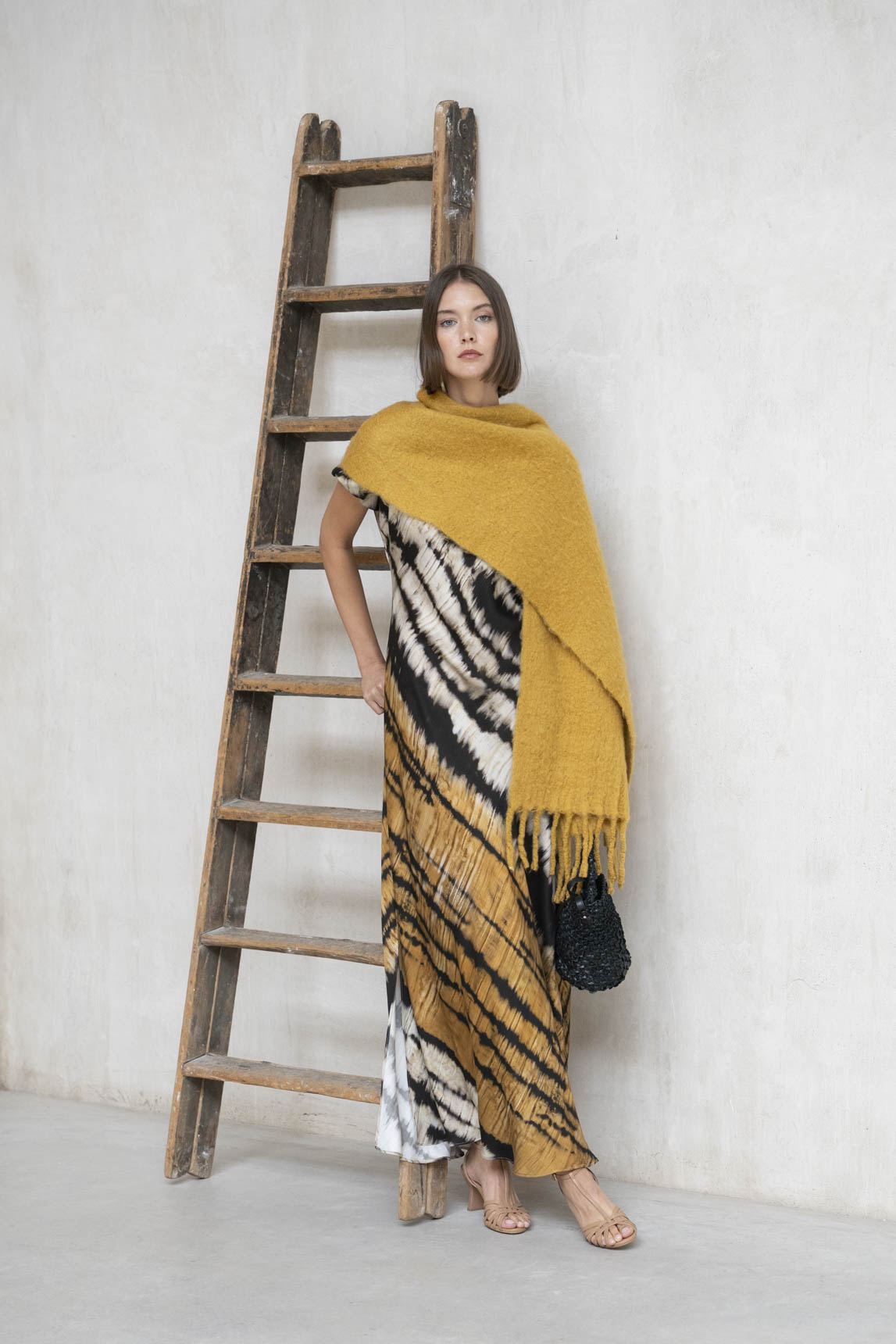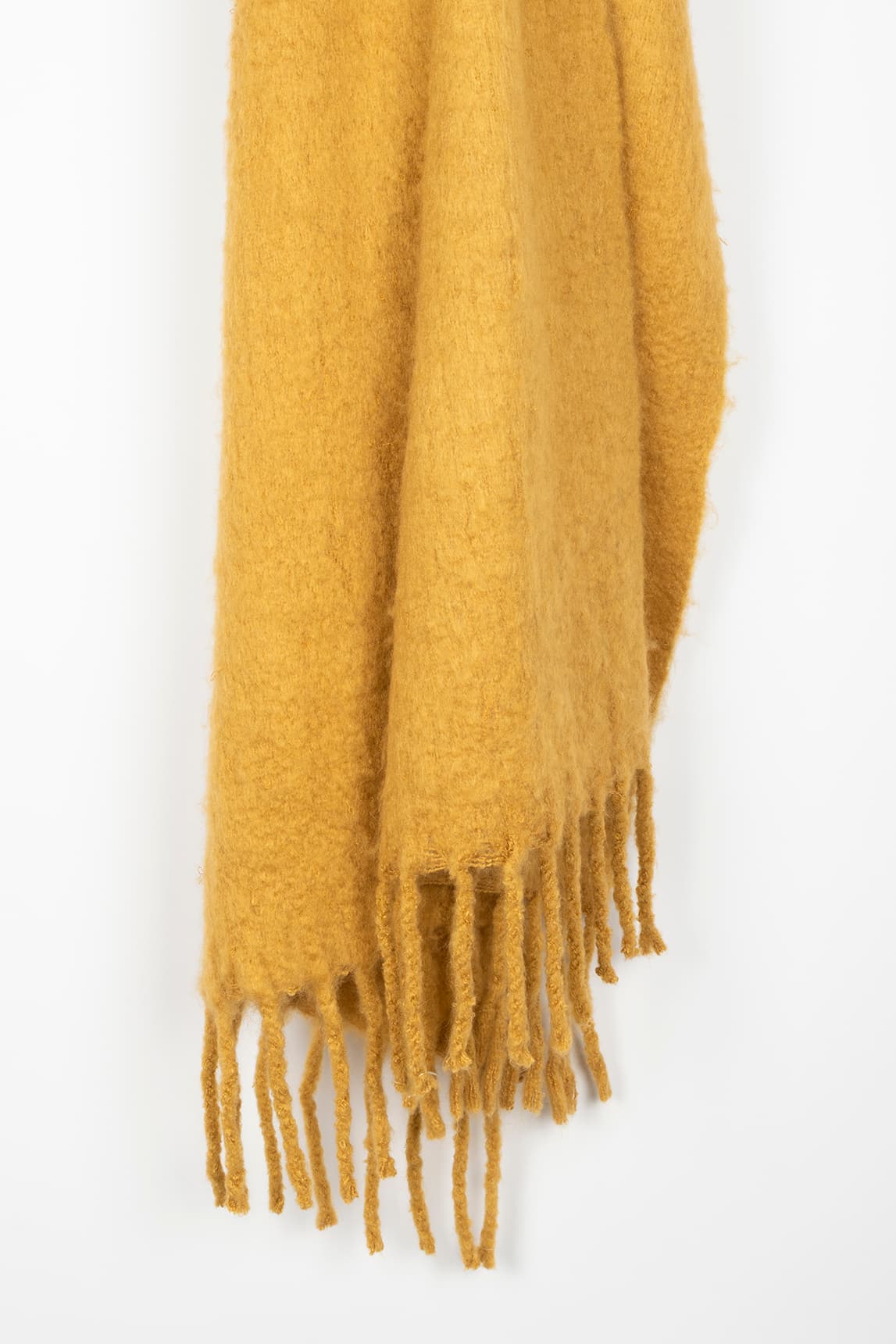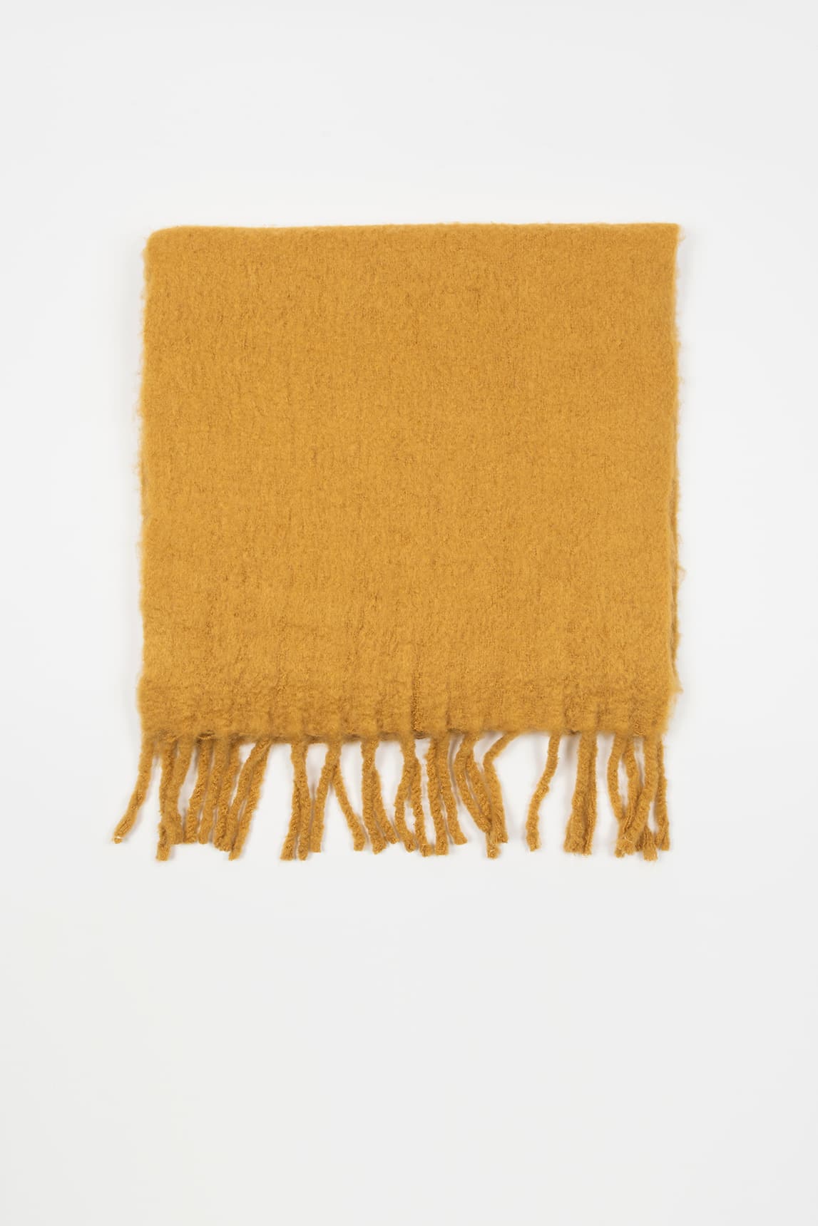 A cozy scarf that adds warmth and color to any winter look. Its mustard hue brings light on cold days and pairs easily with coats in neutral tones, grays, or navy blue. Thanks to its enveloping fabric and fluffy texture, it's ideal for the colder months of the year. The fringed trim adds a classic and timeless detail.