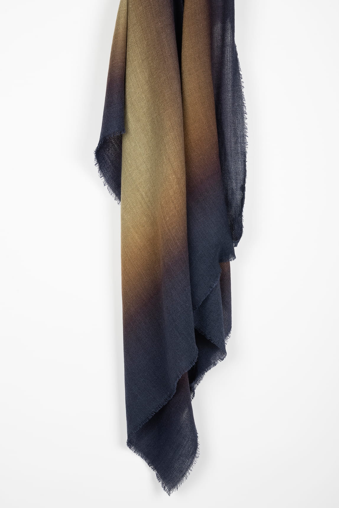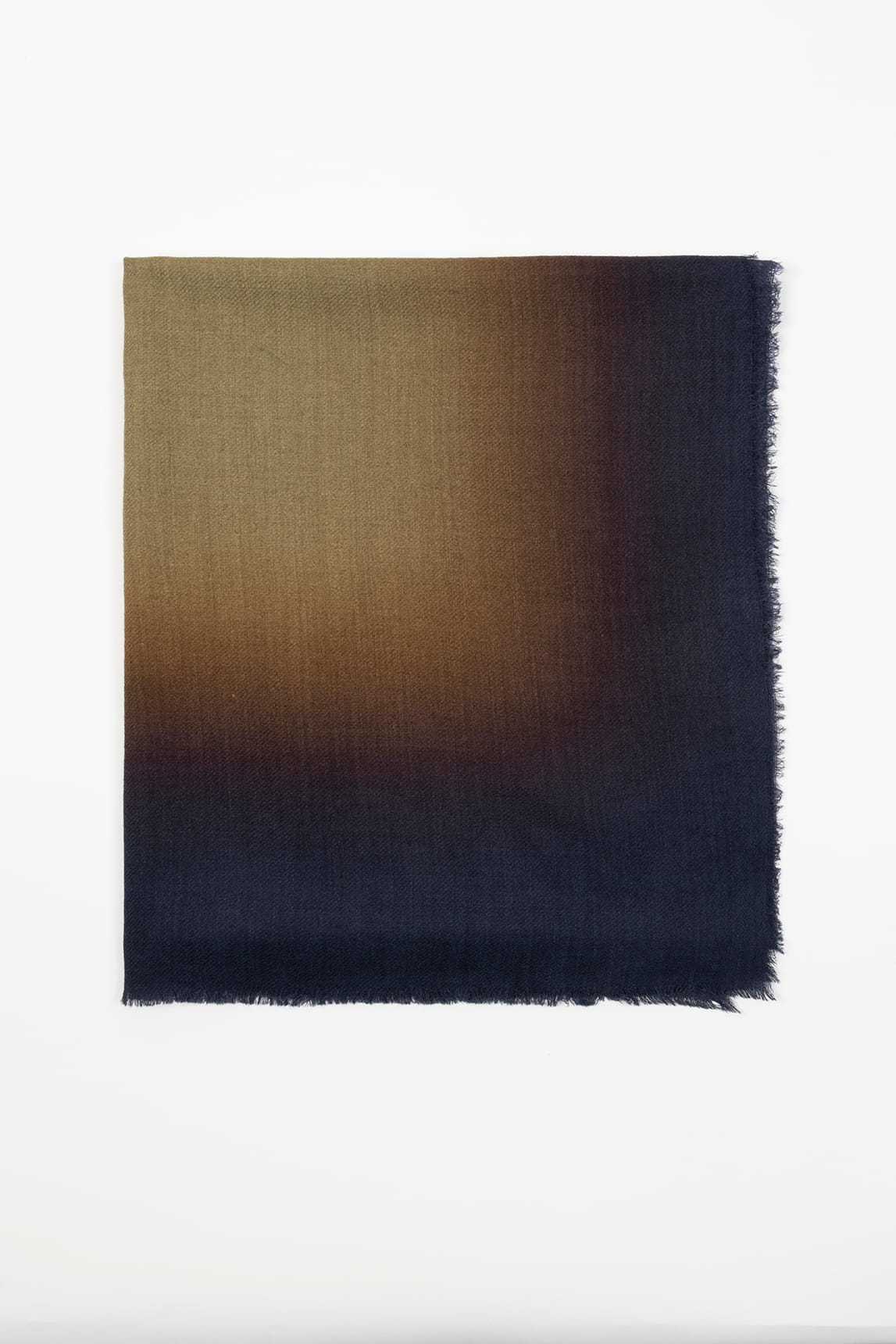 Rivera's blue and green gradient scarf is the perfect choice for those looking for a warm, contemporary accessory with personality. Its design plays with an autumnal color palette of olive green, navy blue, and earthy hues, which blend smoothly together to create an elegant and contemporary effect. Made with wool, this scarf is ideal for the colder days of fall and winter. The subtle fringed finish adds a casual touch without losing its sophisticated feel. Perfect for elevating any everyday look with ease.