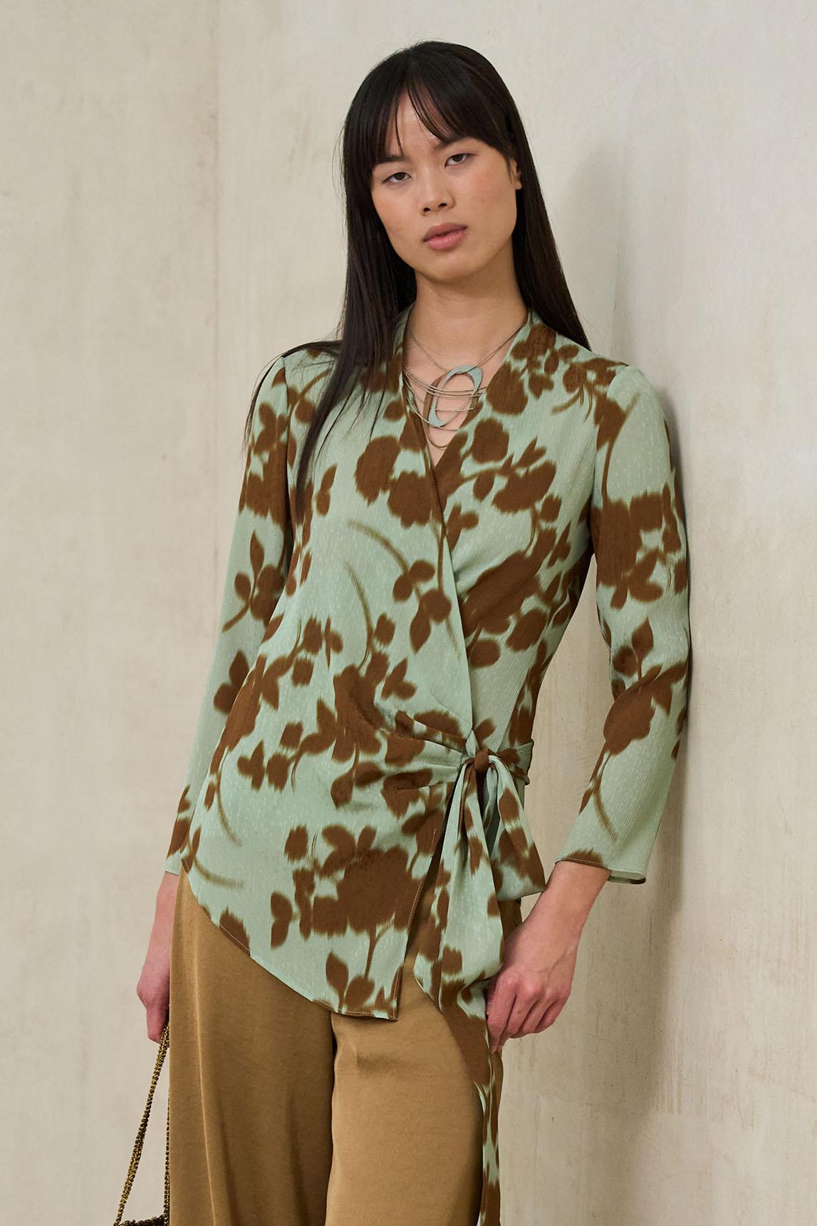 The Lioris Printed Blouse is a flowing, nature-inspired garment that combines a relaxed design with an organic print in sage green, ecru, and earthy tones. Its artistic pattern adds personality without being over the top, maintaining an elegant and timeless balance. It features a V-neck and slightly wide short sleeves with a soft drape that moves with you and flatters your figure without being too tight. The lightweight fabric enhances its cool and breezy feel, making it ideal for spring and summer. It can be worn with neutral trousers for a more refined look or combined with the matching skirt to create a coordinated outfit with a dress effect, perfect for daytime celebrations, informal meetings or carefully curated outfits with a natural feel. A versatile blouse that adds visual texture and chromatic coherence to the seasonal wardrobe. We strive to display colors as accurately as possible, but they may vary slightly from reality.