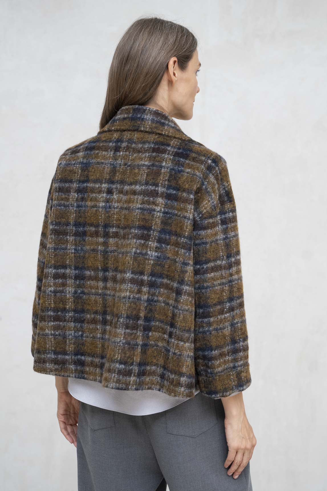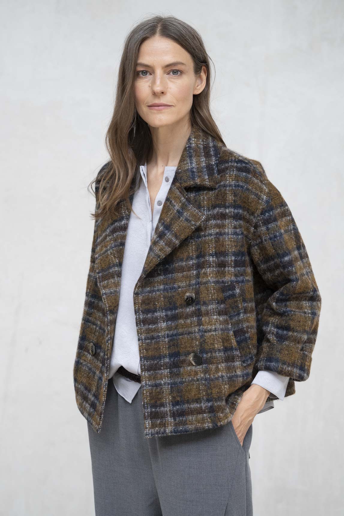 - Chaquetón corto de lana con estampado de cuadros en tonos kaki, azul y marrón.