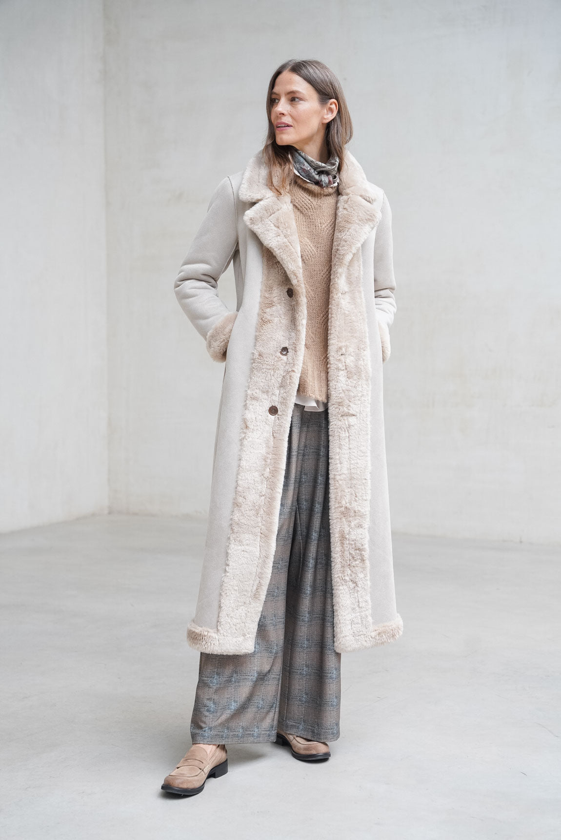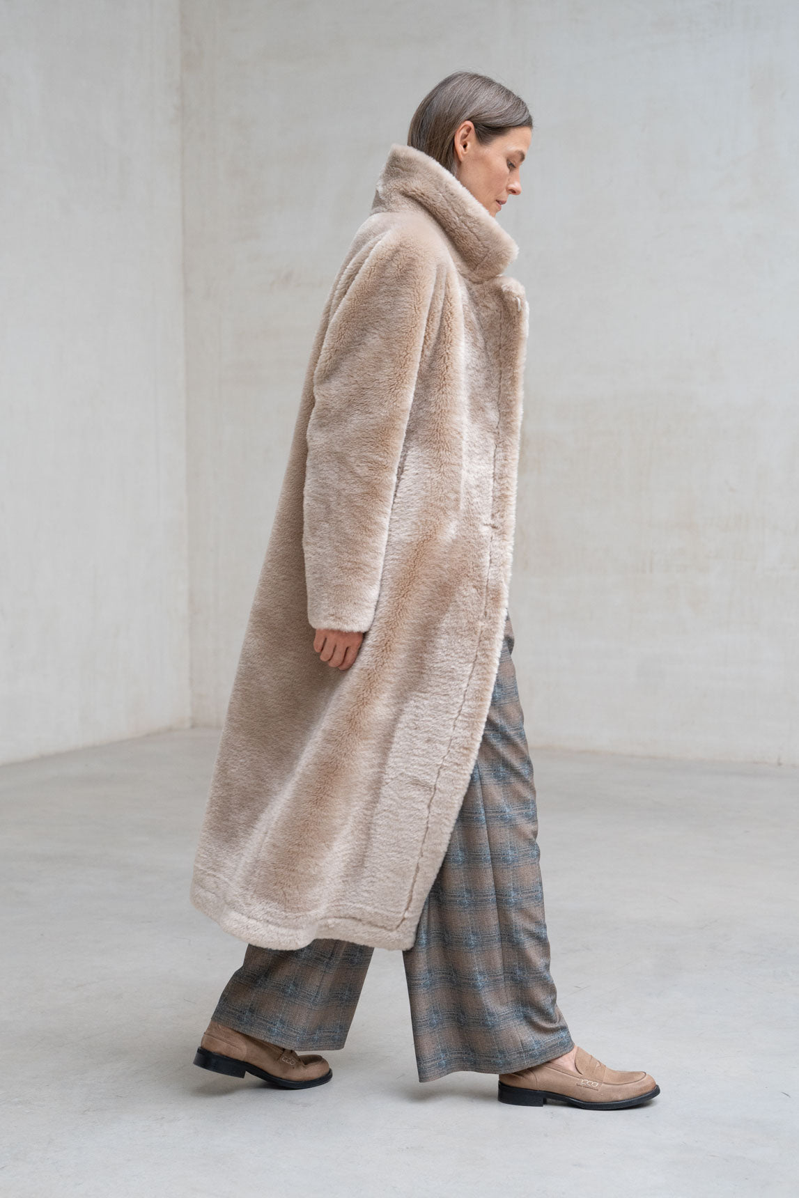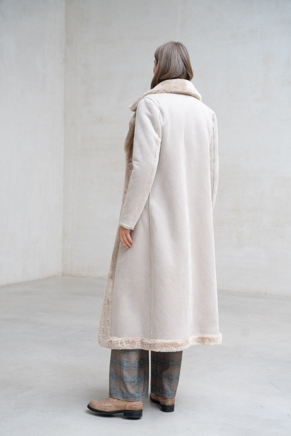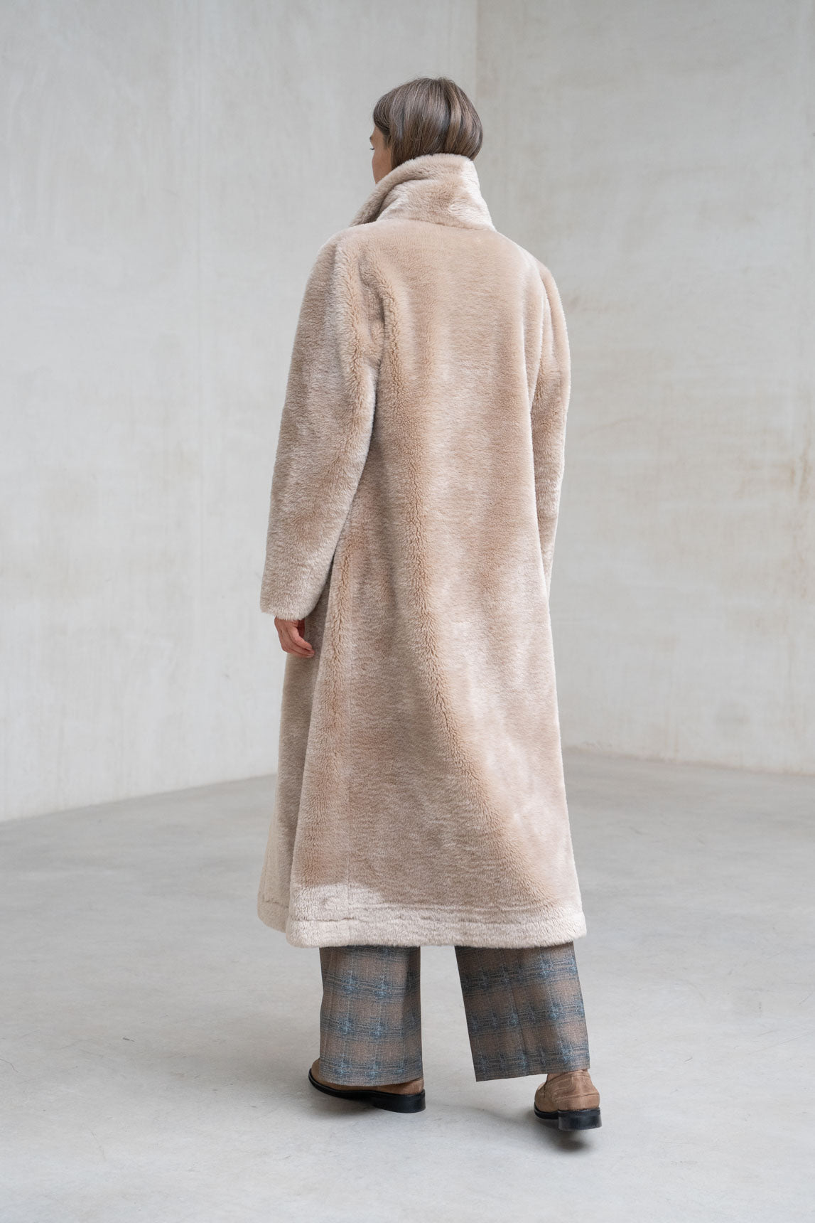 - Abrigo largo reversible de pelo sintético efecto arena, con cierre frontal de botones y cuello solapa.