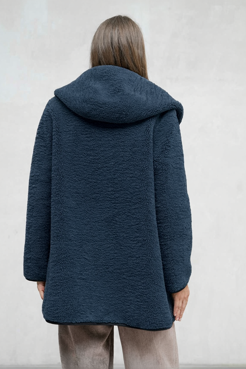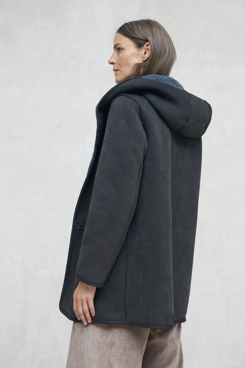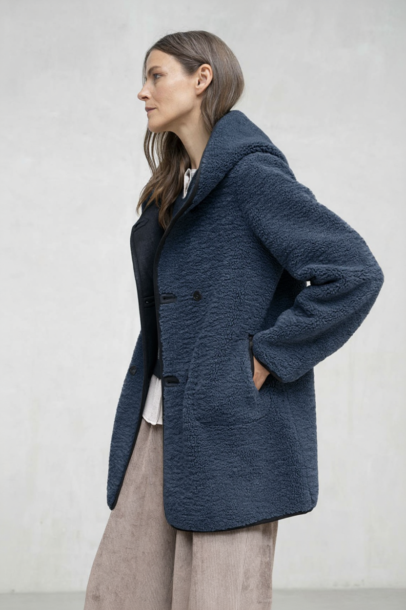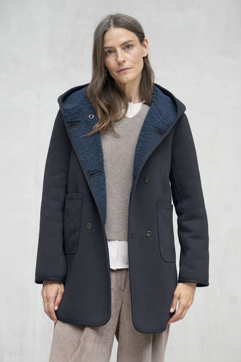 El abrigo Sirmione reversible en azul marino aporta sobriedad y elegancia atemporal a la versatilidad de un diseño 2 en 1. Su doble cara te permite elegir entre la calidez del borreguito visible o la sofisticación del efecto ante, adaptándose a diferentes ocasiones y estilos. Con capucha amplia, corte recto y cierre de botones, es la prenda imprescindible para afrontar los días fríos con comodidad y distinción.