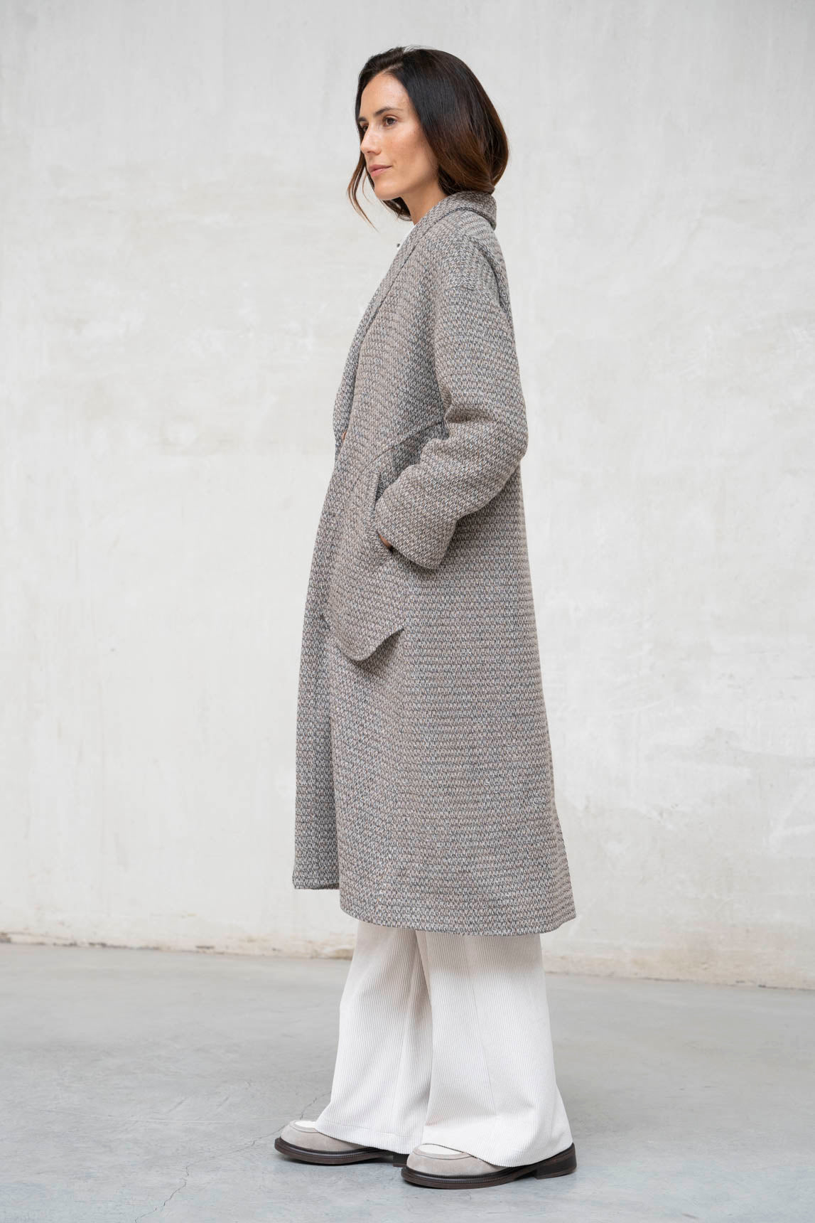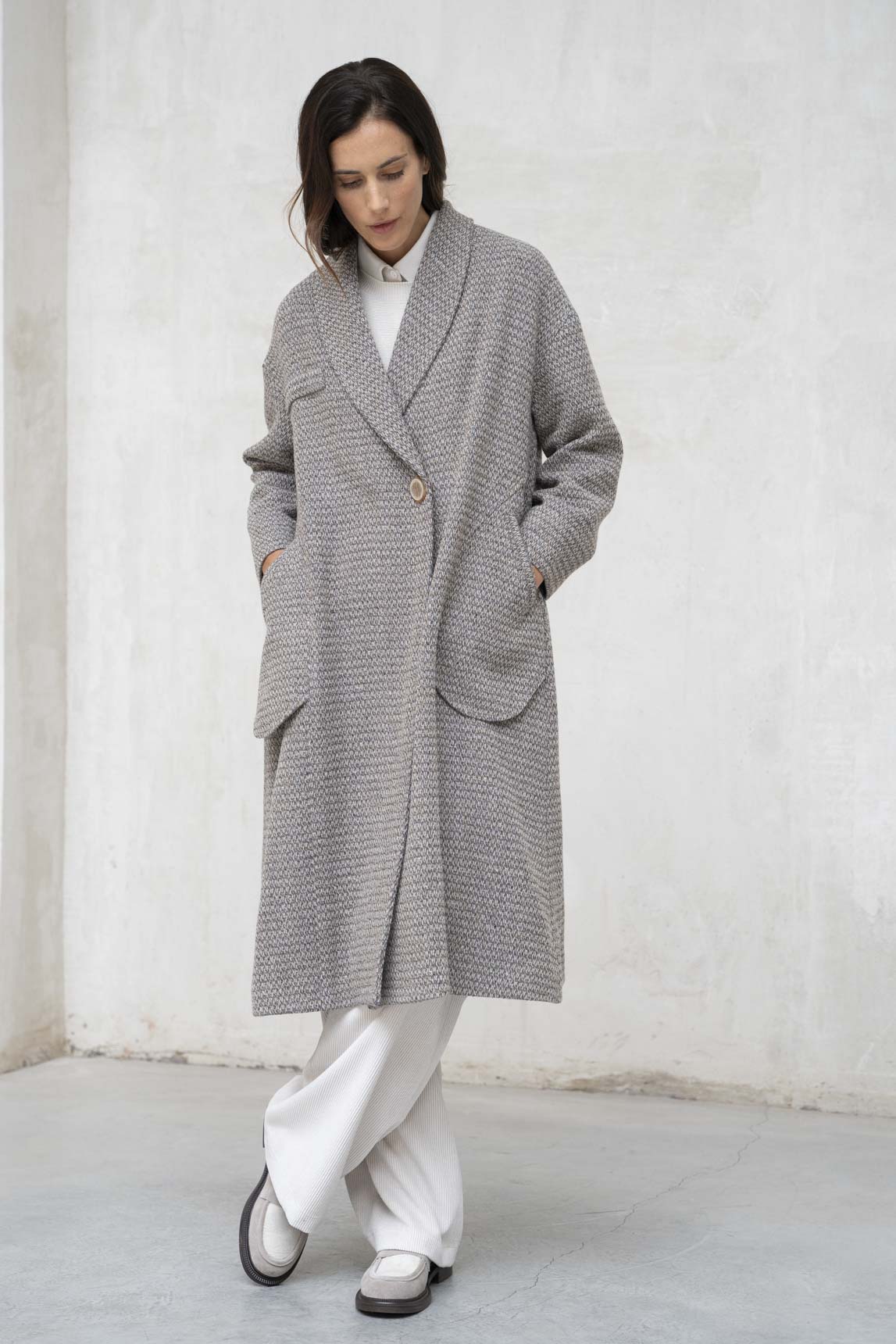 El abrigo Tivoli gris jaspeado combina la calidez del punto con un diseño sofisticado y actual. Su estructura ligera lo hace ideal para entretiempo o para superponer sobre prendas más abrigadas en invierno. Perfecto para un look casual-chic, se adapta tanto a conjuntos de oficina como a estilismos más relajados para el día a día.