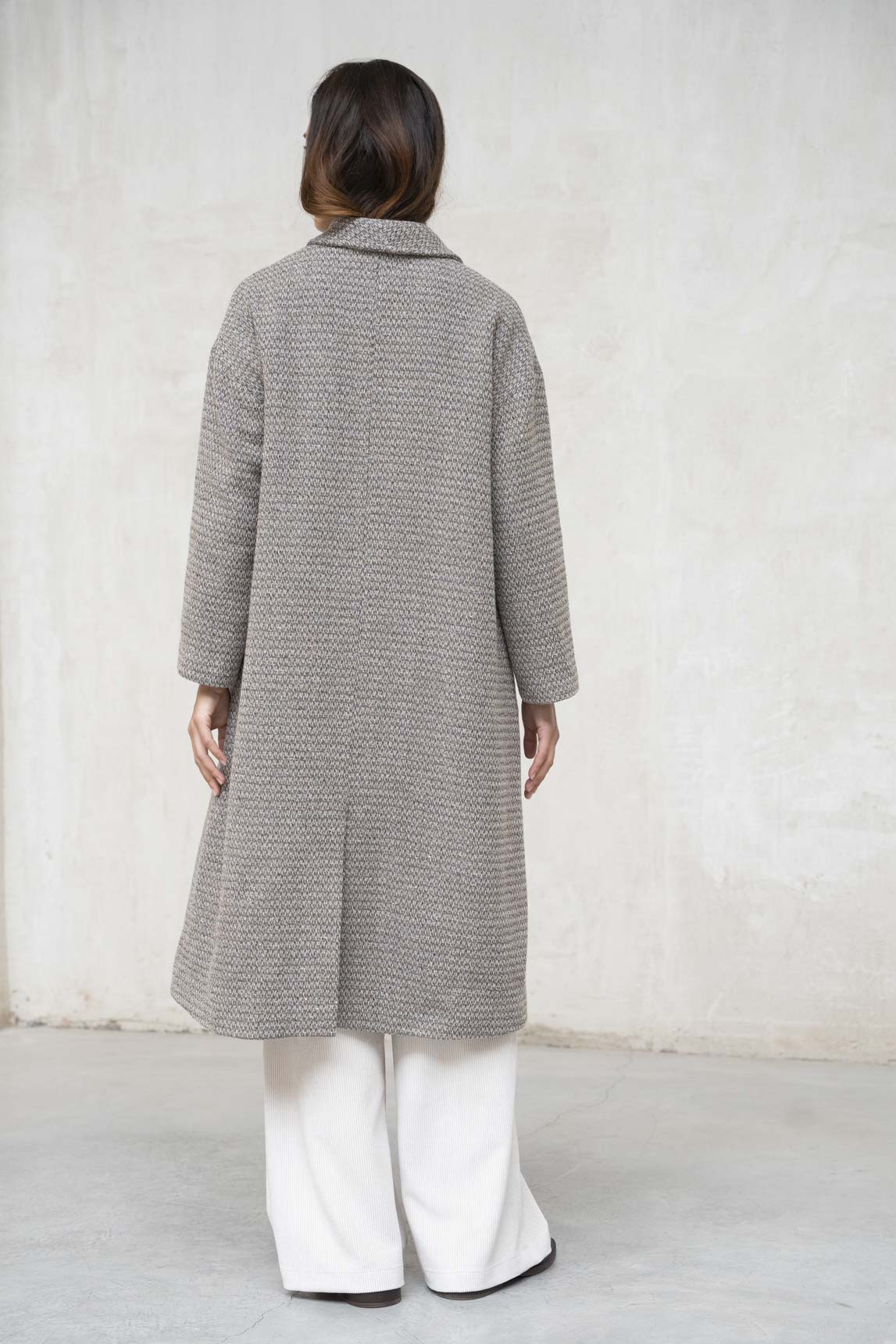 - Corte recto y cuello solapa para un estilo relajado pero elegante.