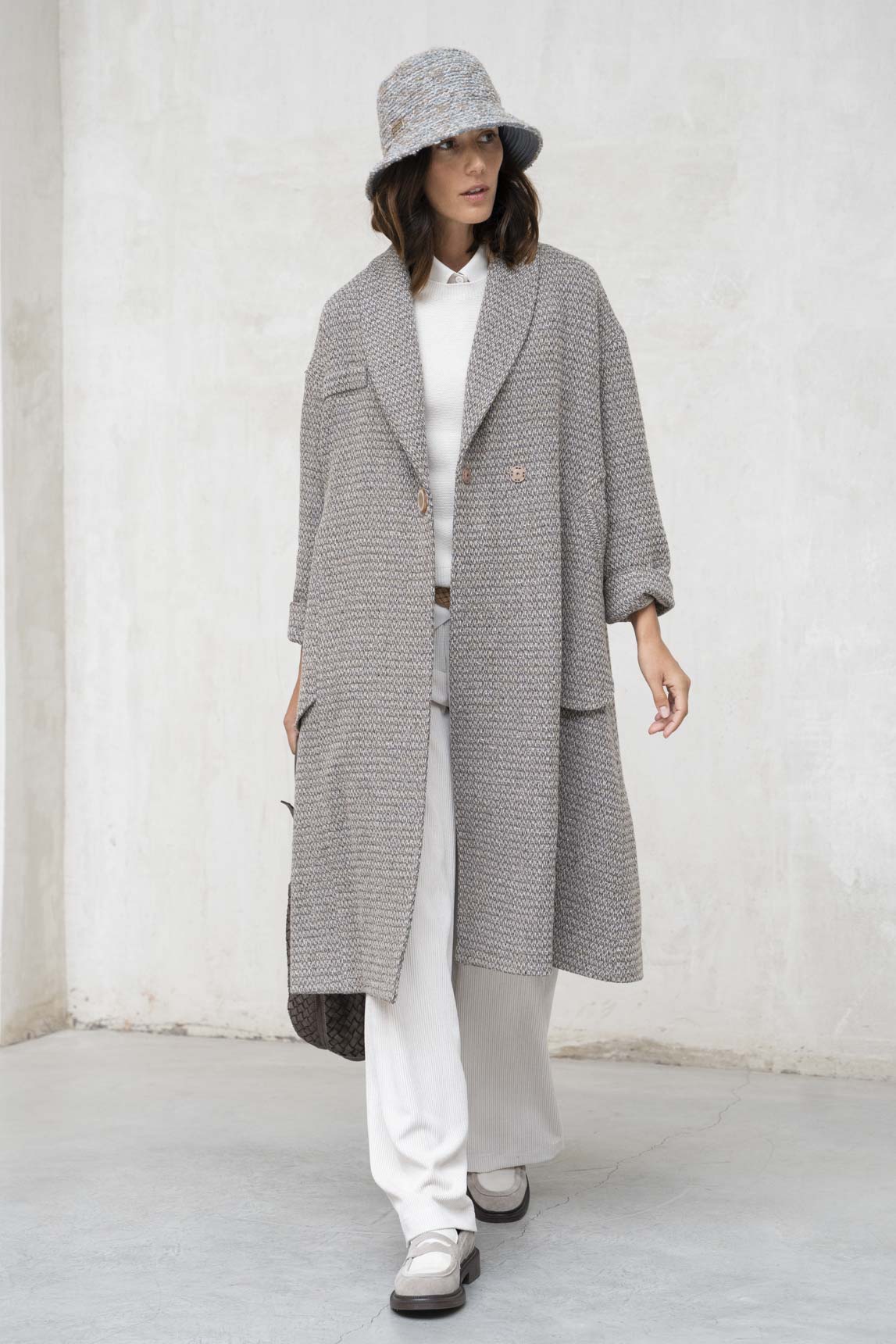 - Abrigo estilo oversize de punto con cierre de un solo botón.