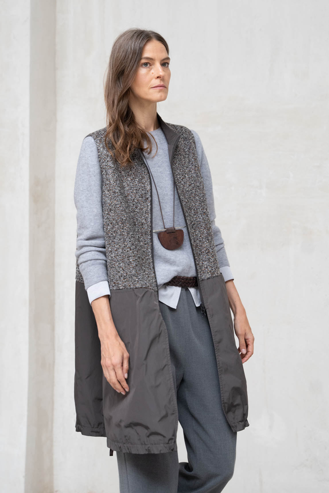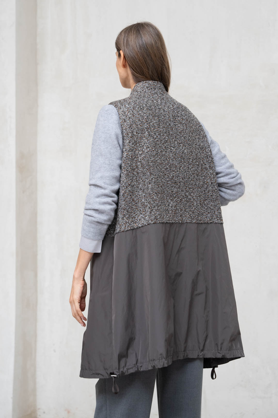El chaleco Mantova combinado gris es una pieza versátil que aporta calidez y estilo a tus looks de temporada. Su diseño mixto une la textura clásica del tweed con un toque funcional gracias al tejido técnico, creando un equilibrio perfecto entre elegancia y practicidad. Perfecto para combinar con jerséis, camisas o camisetas en estilismos tanto urbanos como casuales.