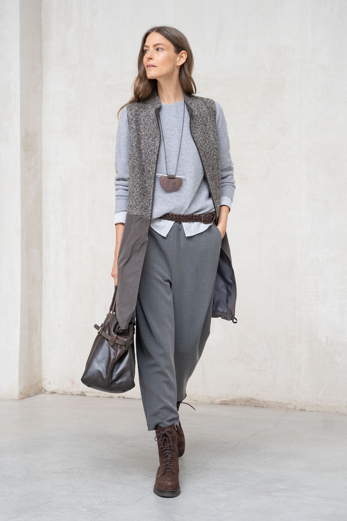 - Combinación de tejido de lana efecto tweed en la parte superior y tejido técnico liso en la parte inferior.