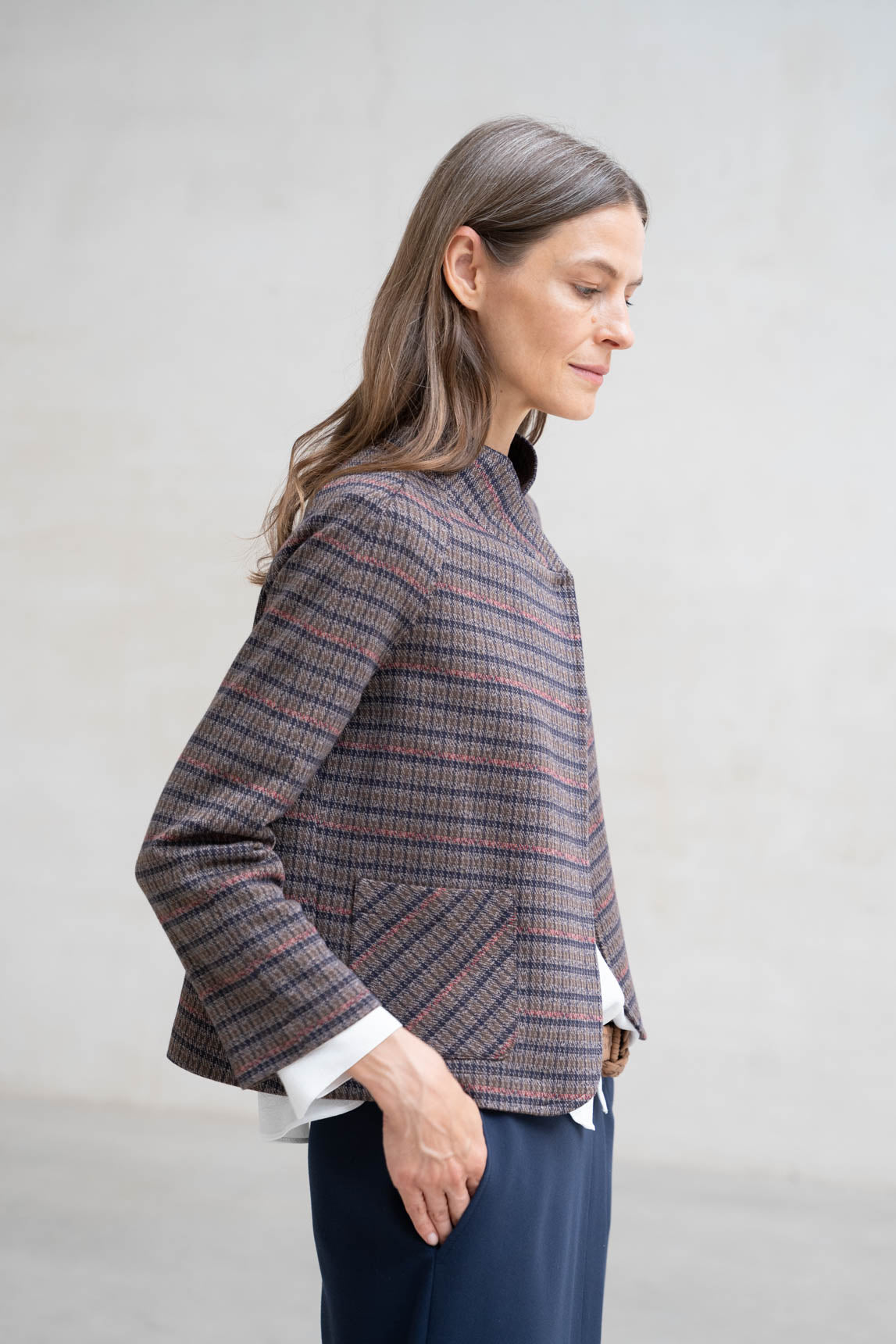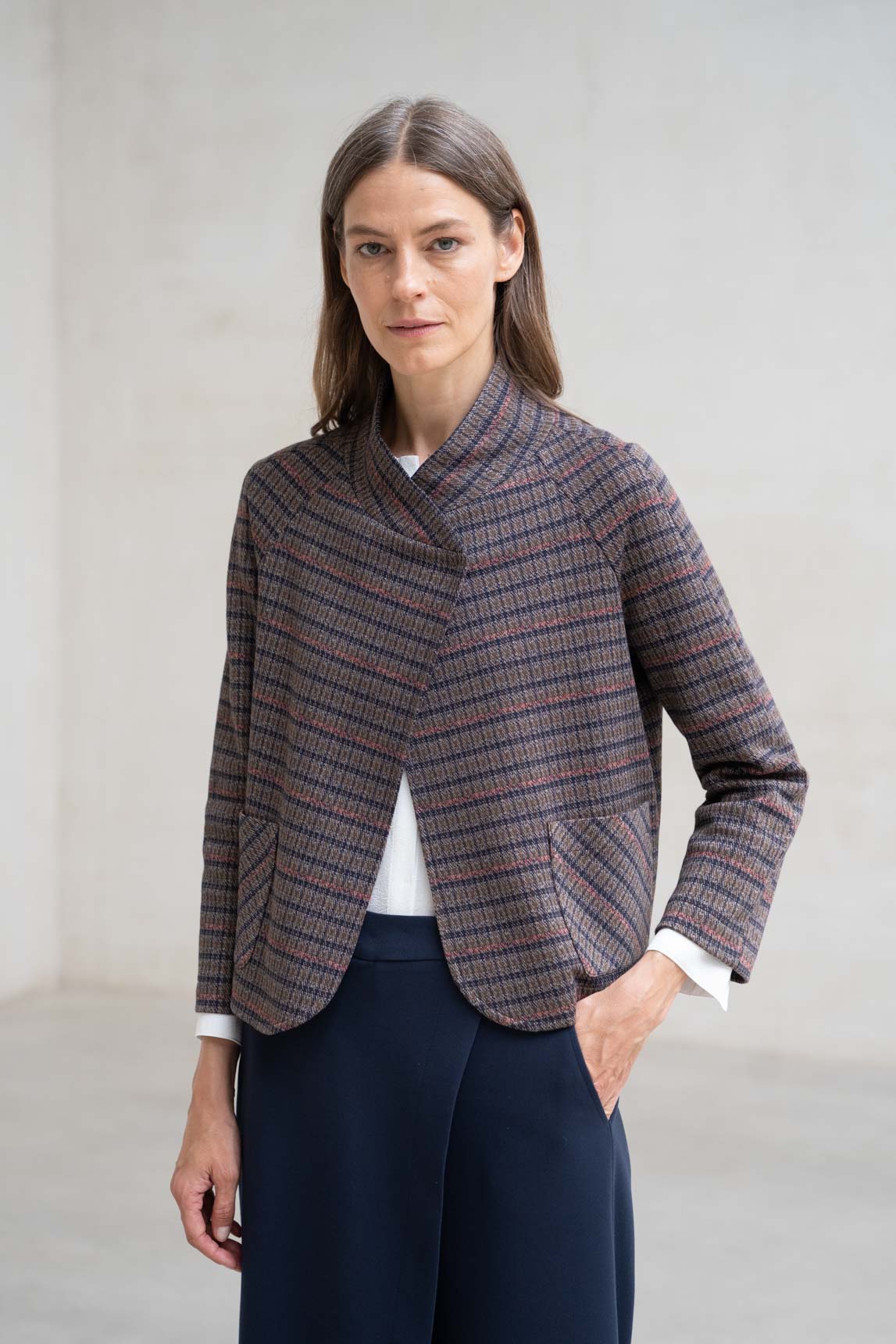 La chaqueta Tarento cuadros burdeos combina un patrón clásico con una silueta contemporánea. Su cuello chimenea y cierre cruzado aportan un aire moderno y minimalista, mientras que el tejido de cuadros en tonos cálidos y fríos la convierte en una prenda versátil para otoño e invierno. Ideal para elevar un look de oficina o completar conjuntos casual chic.