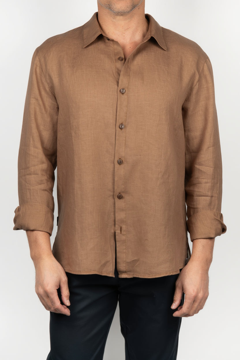 Camisa de hombre de manga larga en tono marrón, con diseño liso y silueta recta de inspiración relajada. Presenta cuello clásico, cierre frontal de botones en contraste suave y puño abotonado, creando una imagen equilibrada con un punto de carácter. La superficie deja ver una textura natural que aporta profundidad al color y enriquece el conjunto, mientras la caída ligera favorece una sensación cómoda y fluida.