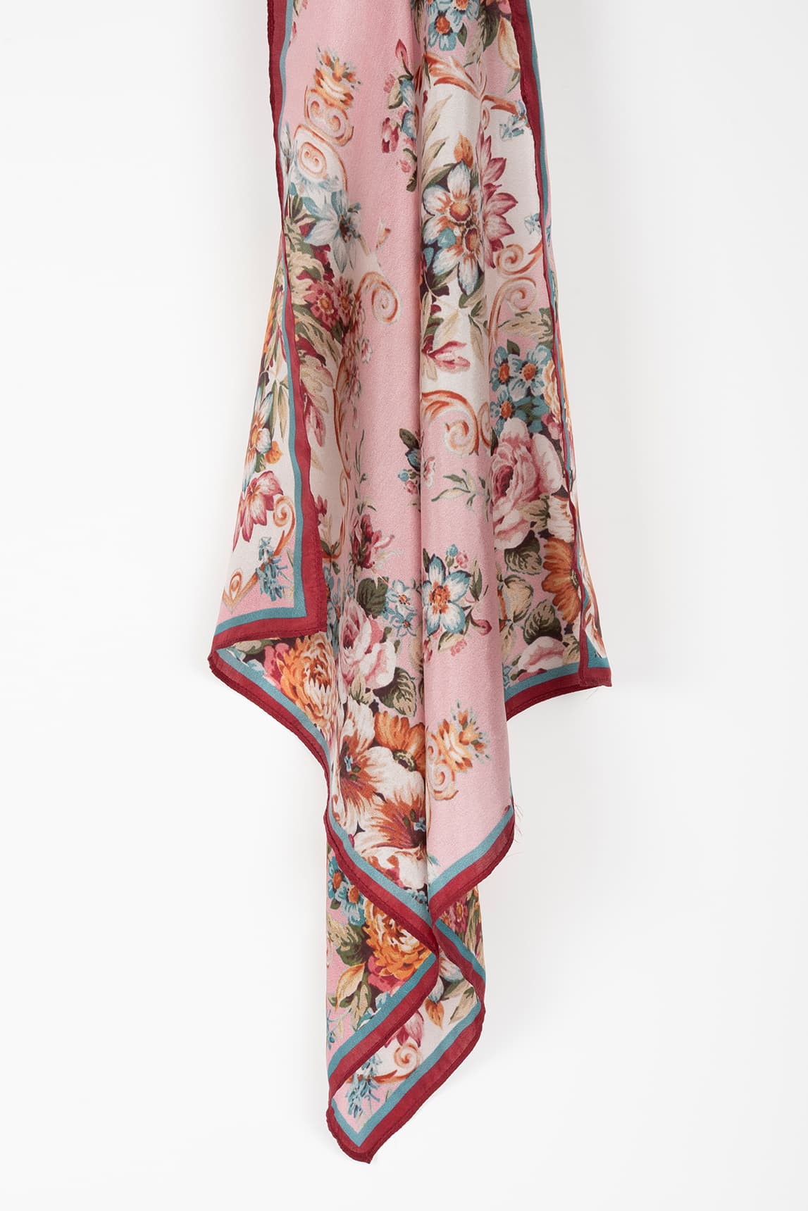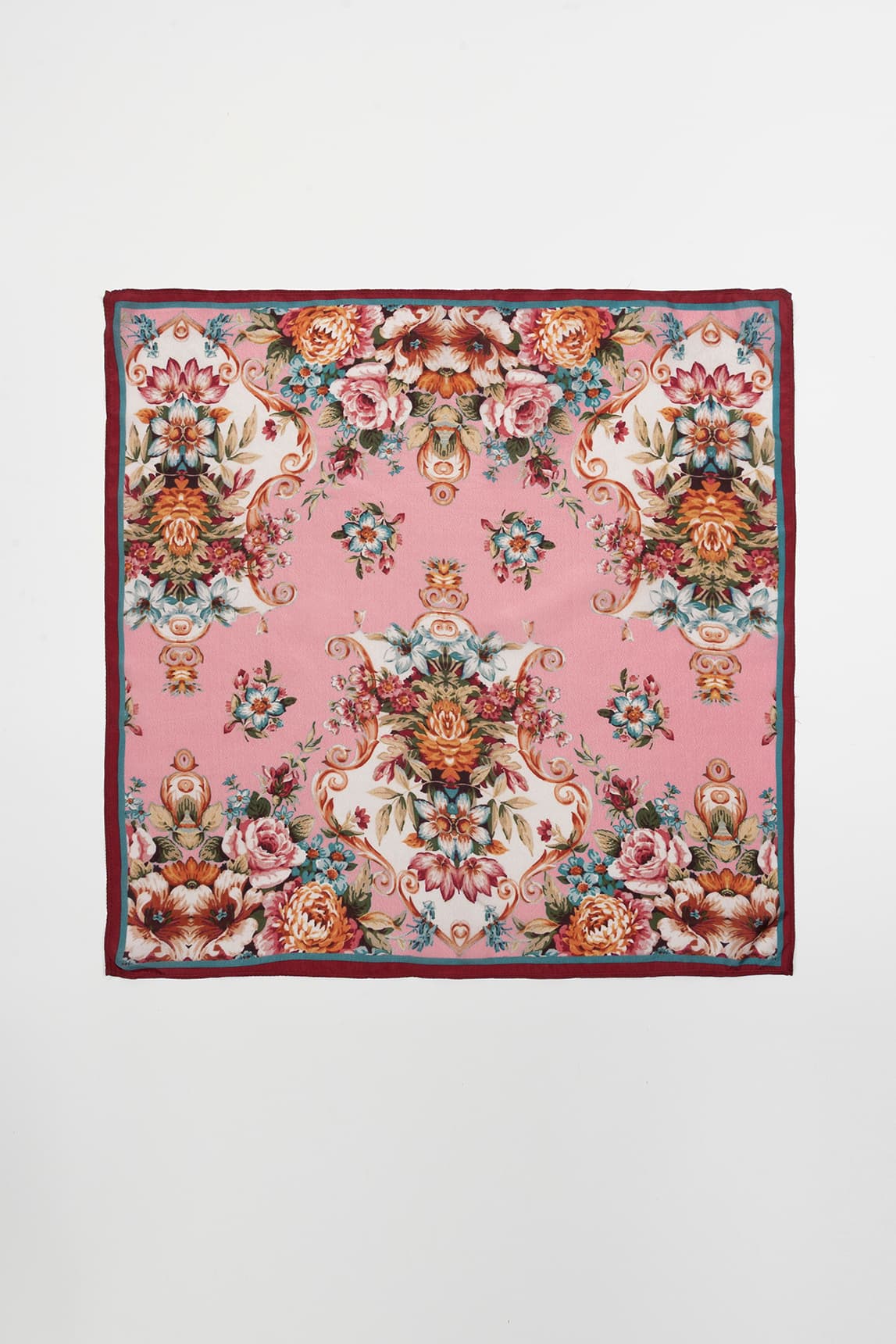 Este pañuelo de inspiración clásica destaca por su paleta armónica y femenina, ideal para dar un toque de romanticismo a cualquier look. El diseño floral en contraste con el fondo rosa lo hace perfecto para combinar con prendas neutras o para elevar un estilismo monocromático. Llévalo al cuello, en la muñeca o sobre el bolso como detalle especial.
