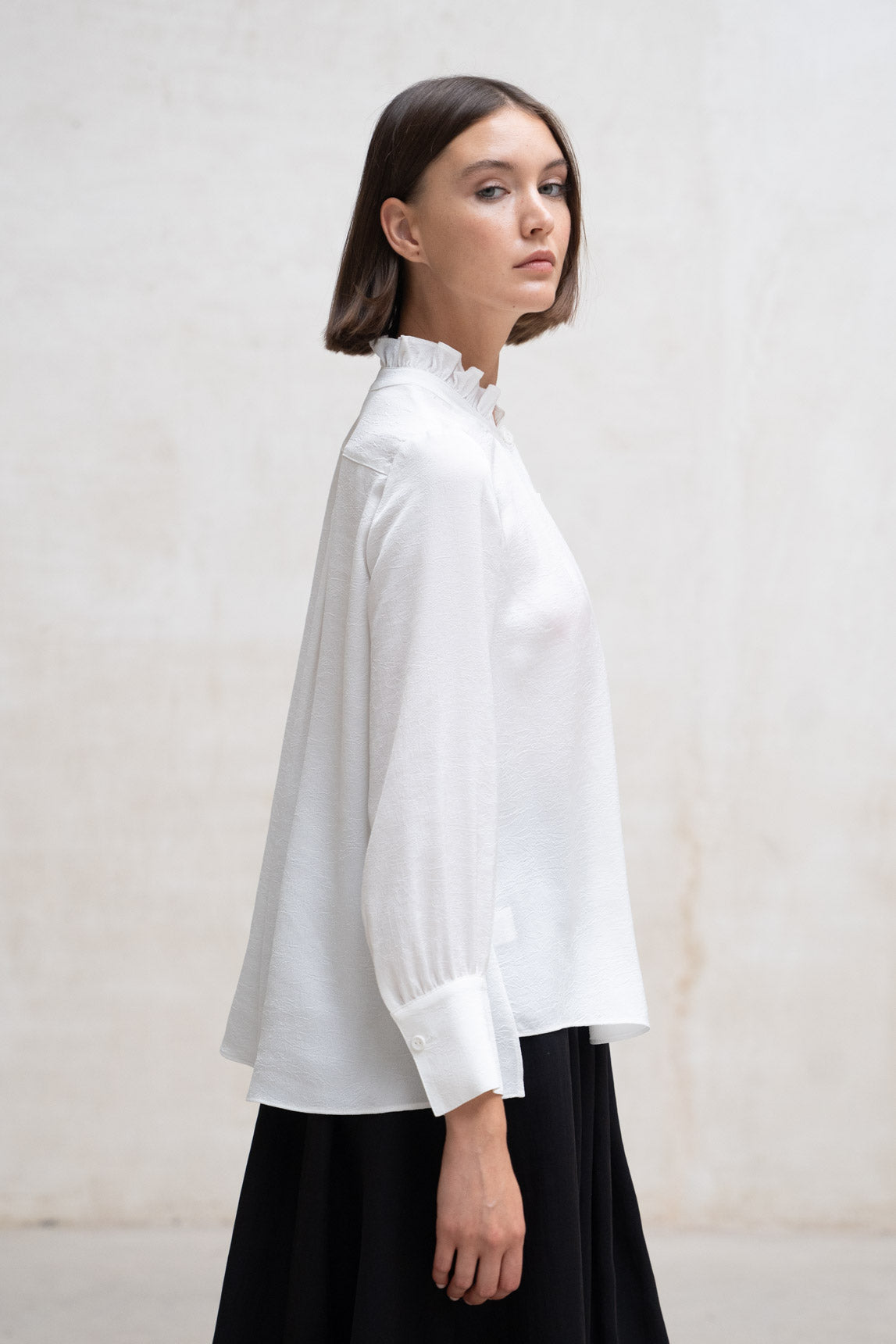 - Cuello subido con delicado volante fruncido para un toque femenino.