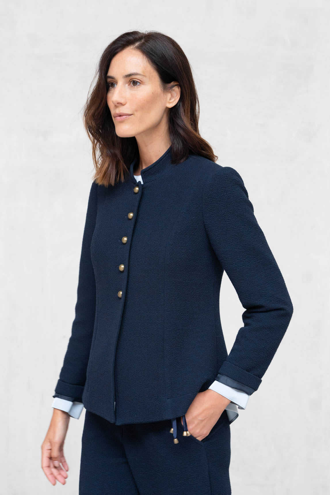 La chaqueta Vietri azul marino es un básico sofisticado que eleva cualquier conjunto. Su cuello mao y la botonadura dorada aportan un toque distinguido, mientras que el tejido texturizado añade profundidad y carácter. Perfecta para combinar con su pantalón a juego para un look coordinado, o con vaqueros y blusas para un estilo más relajado pero igualmente chic. Ideal para la temporada de entretiempo y los meses más fríos.