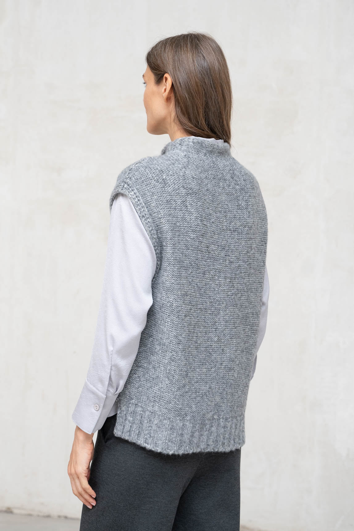 El chaleco Orio gris es una prenda perfecta para crear looks en capas con estilo. Su punto grueso y el diseño trenzado central le aportan textura y personalidad, mientras que el cuello vuelto añade un toque acogedor. Versátil y fácil de combinar, es ideal para llevar sobre camisas o blusas en días frescos, aportando calidez sin renunciar a la movilidad.