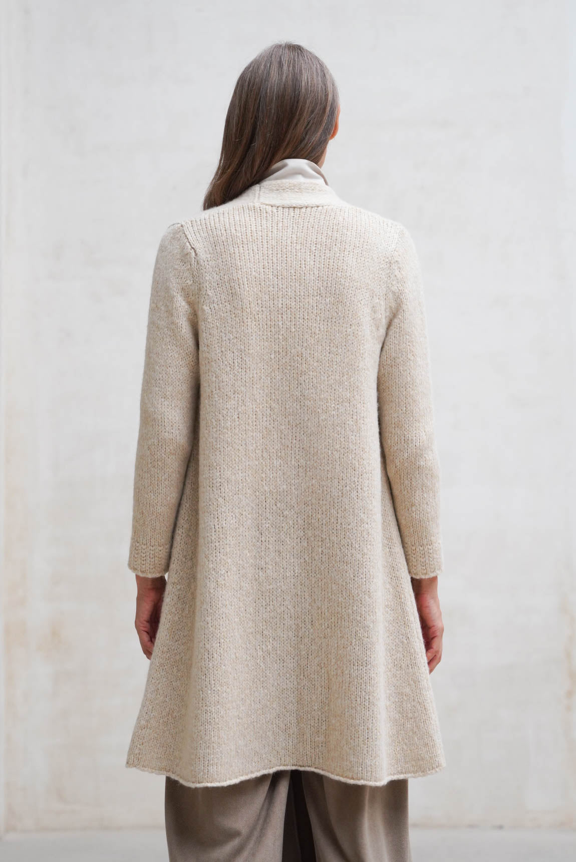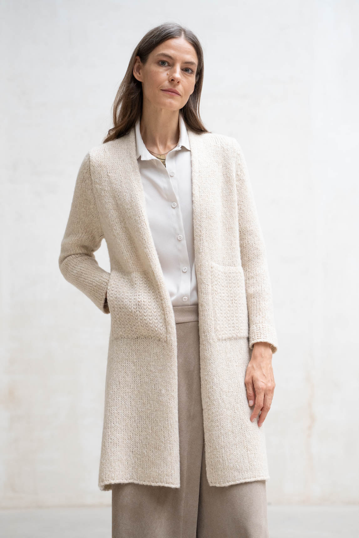 - Cárdigan largo de manga larga y diseño abierto.