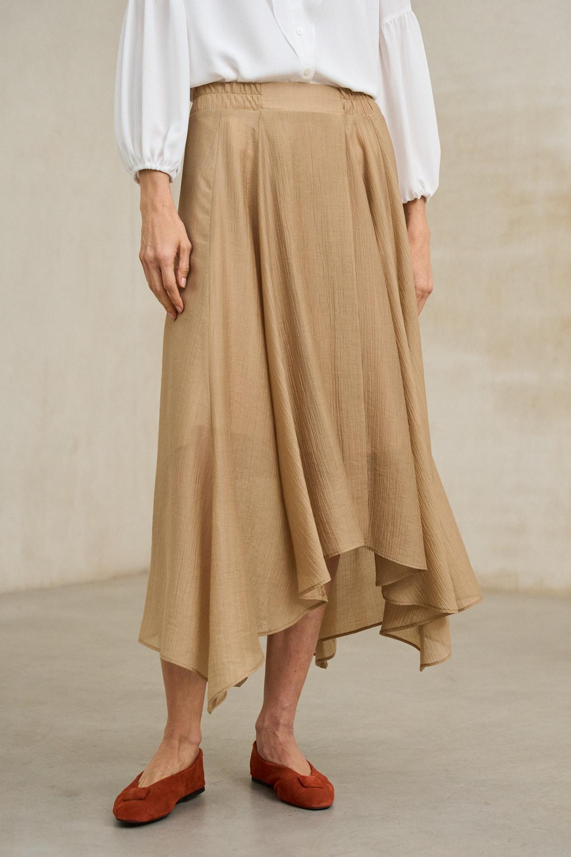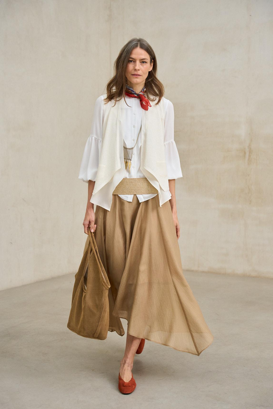 Falda midi confeccionada en tejido ligero y fluido que aporta movimiento natural al caminar. Presenta cintura limpia y silueta evasé con bajo ligeramente asimétrico, creando una caída elegante y dinámica que estiliza la figura sin marcar. La Falda Nadeya camel destaca por su versatilidad y su estética sofisticada. Su tono neutro cálido permite combinarla fácilmente con blusas ligeras, camisetas básicas o chaquetas estructuradas, adaptándose tanto a looks de oficina como a estilismos más relajados de primavera y verano. Su diseño atemporal la convierte en una pieza clave de fondo de armario, perfecta para crear conjuntos femeninos, equilibrados y con movimiento. Nos esforzamos por mostrar los colores de la forma más fiel posible, pero pueden variar ligeramente respecto a la realidad.