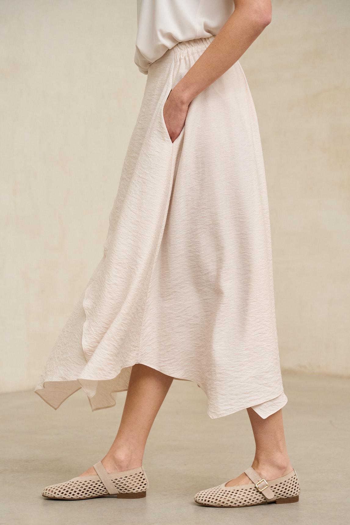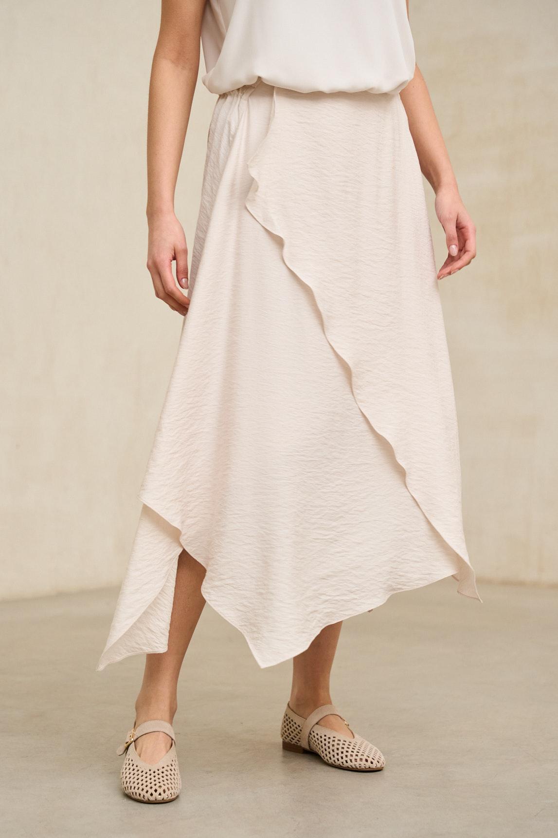 Falda midi confeccionada en tejido ligero con caída fluida y movimiento natural. Presenta diseño envolvente con superposición frontal y bajo asimétrico en diagonal que aporta dinamismo y estiliza visualmente la silueta. La estructura es limpia en la cintura, permitiendo un ajuste cómodo y favorecedor.