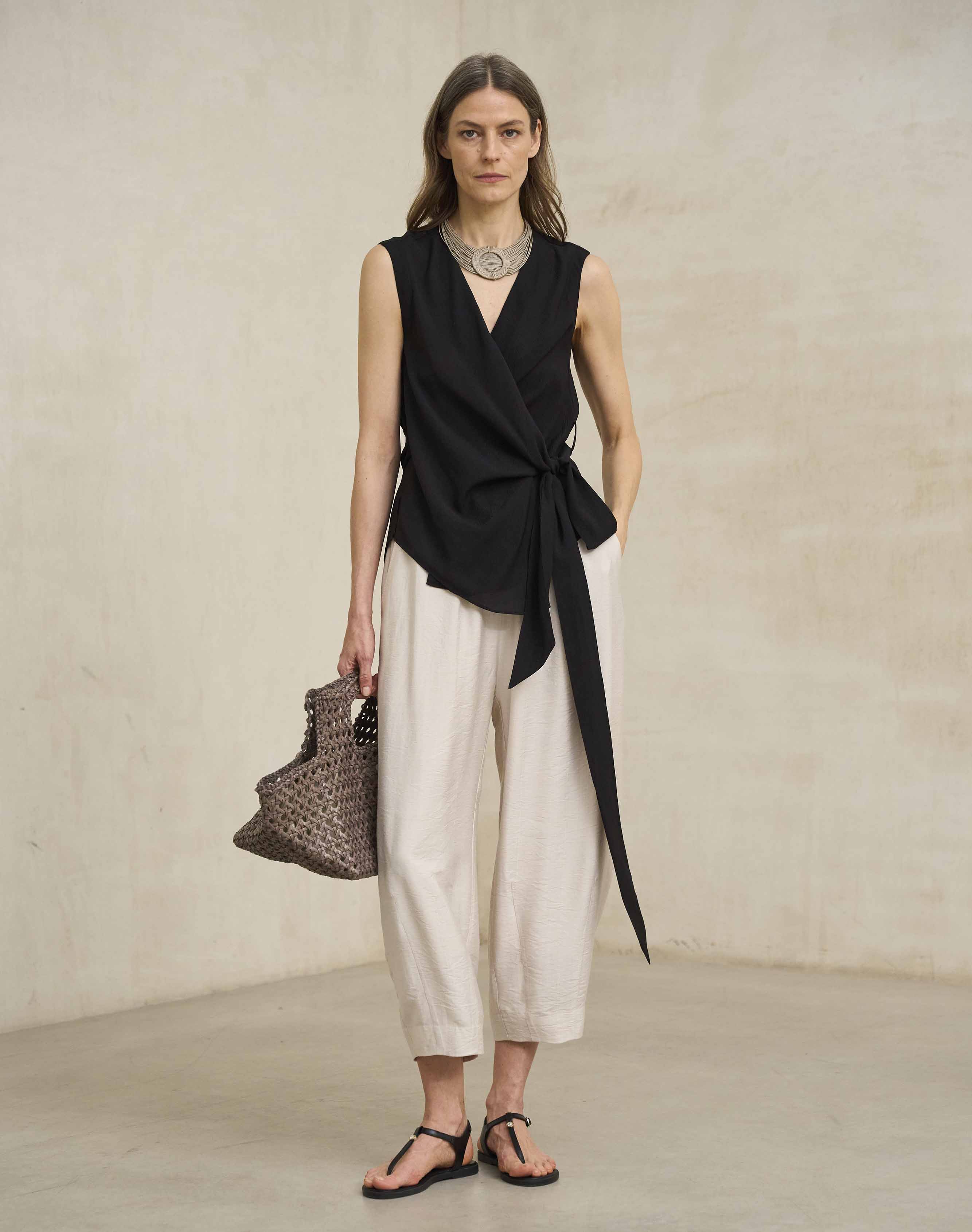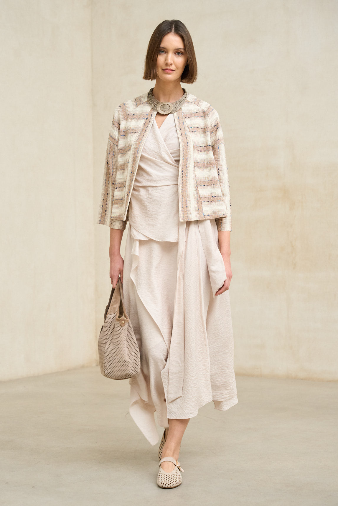 La silueta es moderna y sofisticada: ocupa el escote con presencia sin sentirse excesiva, y el medallón redondo actúa como punto focal sobre prendas lisas. Combina especialmente bien con escote barco, cuello redondo o camisa abierta, y funciona igual de bien con tonos neutros que con colores intensos, aportando contraste sereno y un toque artesanal.
