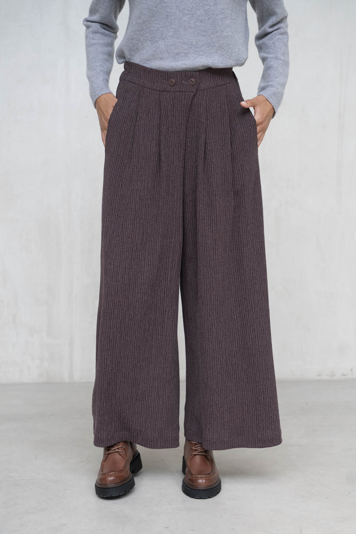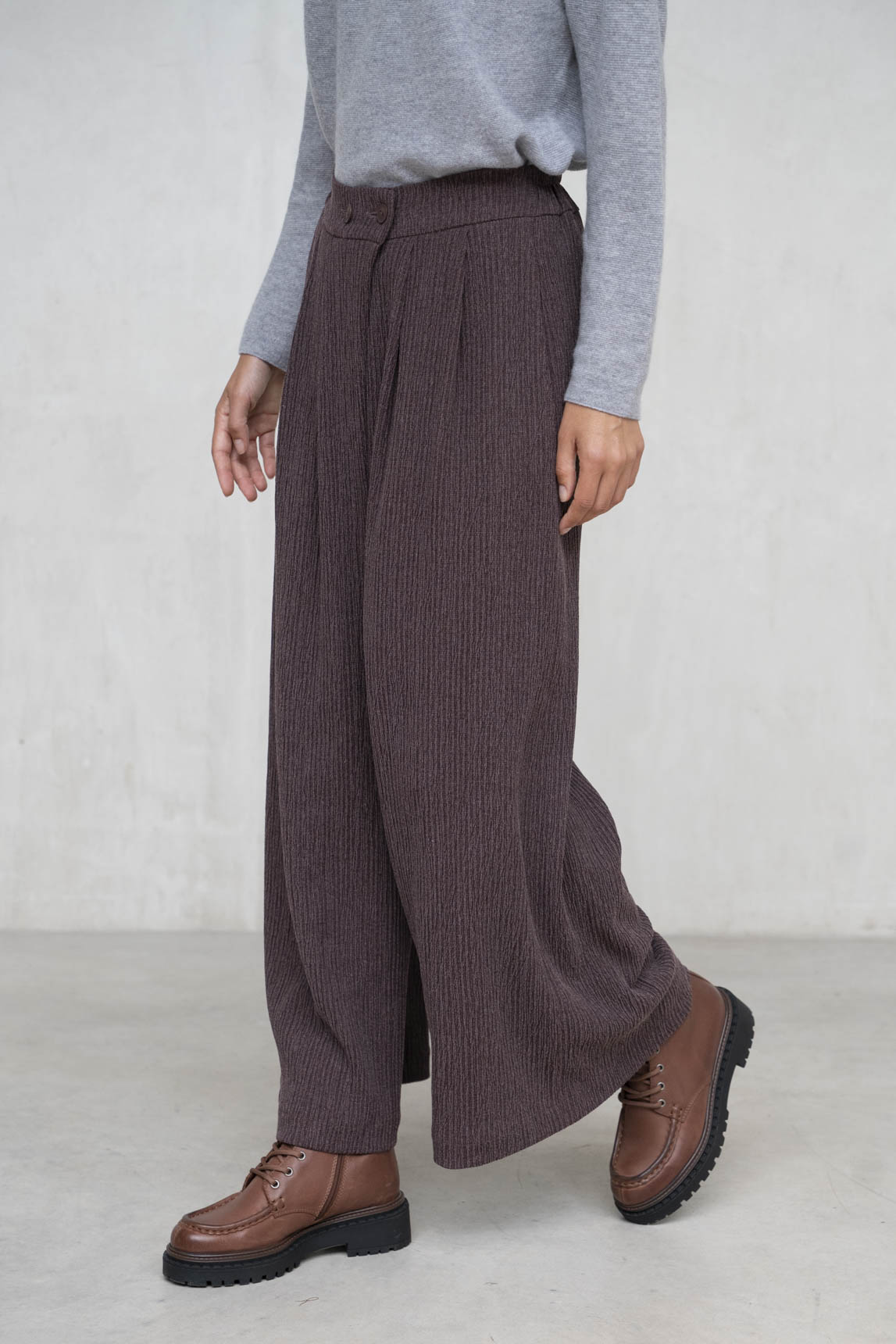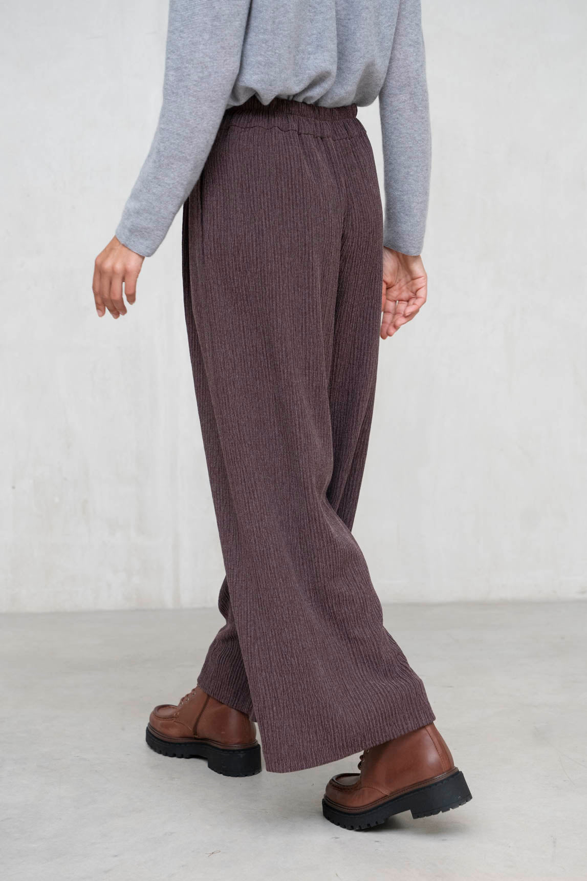 El pantalón Siena en tono berenjena combina comodidad, estructura y un punto de sofisticación cromática. Su tejido de canalé con caída aporta dinamismo y movimiento a cada paso, mientras que la cintura con pinzas realza la silueta con elegancia. Perfecto para estilismos de oficina, planes urbanos o días relajados con un extra de estilo.