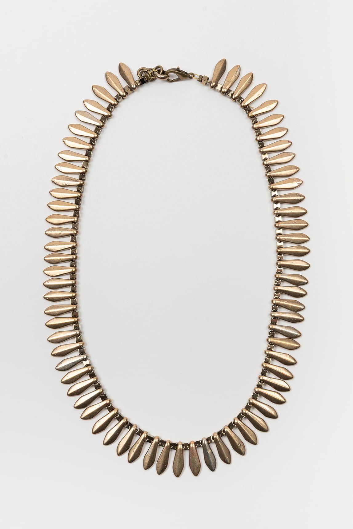 El collar Aurelis en latón mantiene la misma estructura envolvente de piezas alargadas que crean textura y movimiento continuo. Su composición equilibrada convierte el diseño en una pieza de fuerte presencia visual pero armoniosa.