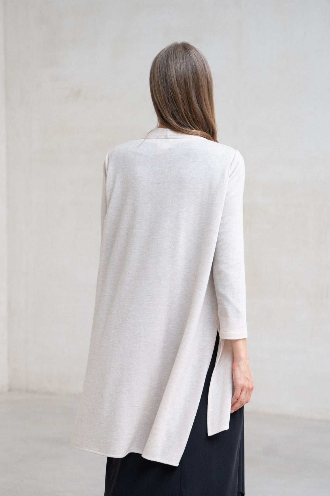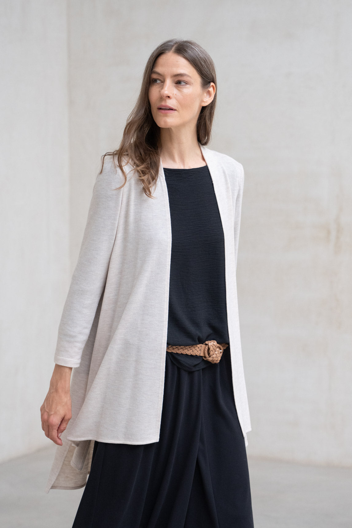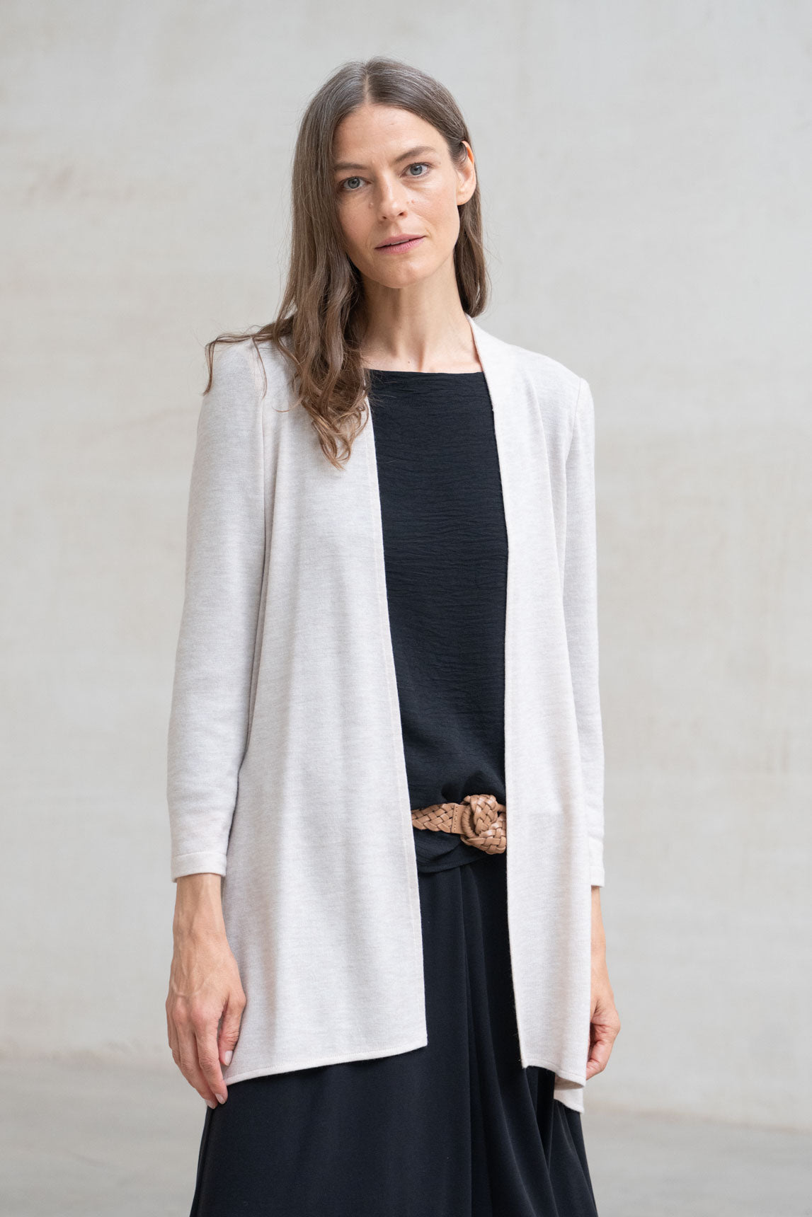 El cárdigan Orsara crudo es una prenda versátil y atemporal que eleva cualquier look. Su diseño abierto y su tejido ligero lo hacen ideal para llevar sobre vestidos, blusas o camisetas, tanto en estilismos de oficina como en outfits informales.