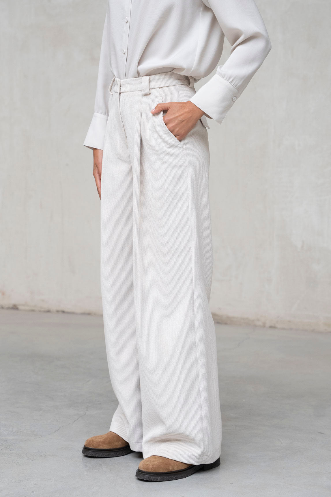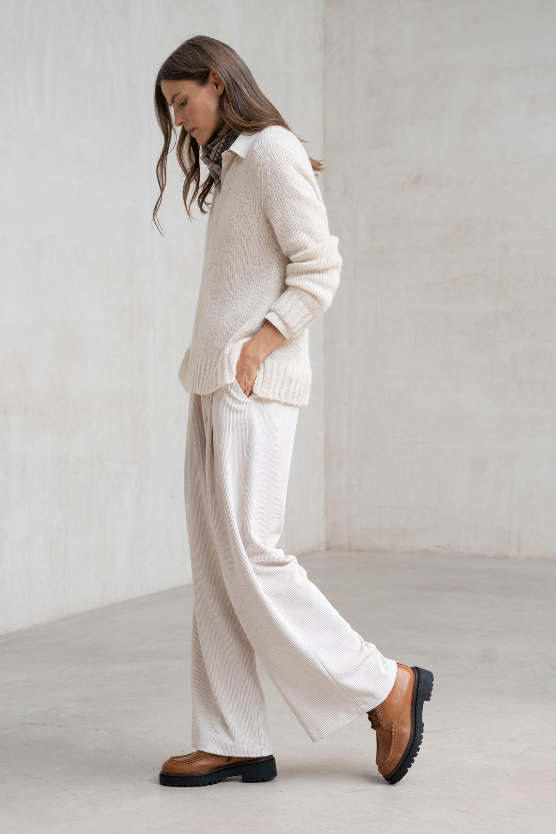 El pantalón Ragusa en color crudo es una apuesta atemporal y cálida para los días fríos. Su diseño de talle alto con pinzas favorece la silueta, mientras que la pana acanalada aporta textura y estructura. Ideal para looks elegantes o relajados, su versatilidad lo convierte en un imprescindible del armario otoño-invierno. Combínalo con camisas, jerséis o abrigos fluidos para un resultado equilibrado y sofisticado.