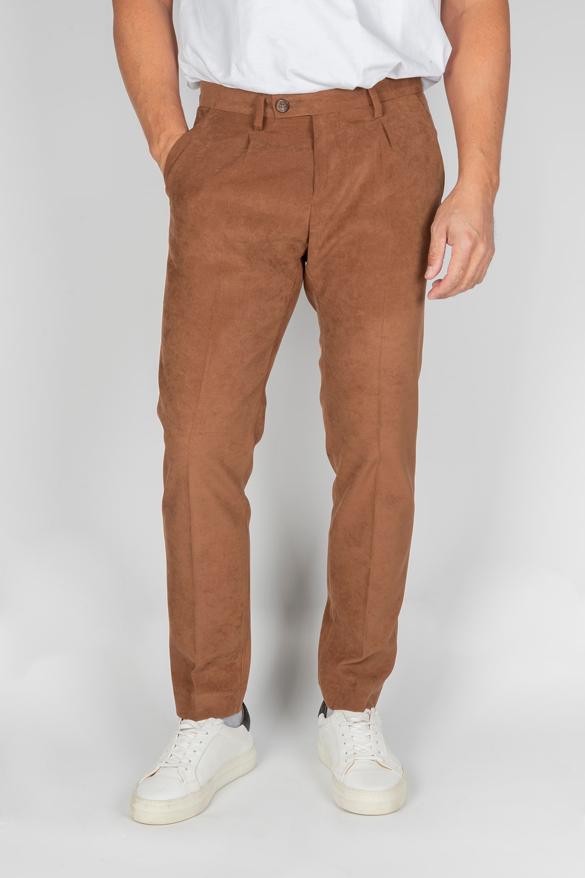 Este pantalón marrón camel liso destaca por su diseño elegante y minimalista. Su corte slim-fit estiliza la silueta y lo convierte en una prenda versátil para distintas ocasiones. Ideal para looks casuales con camiseta y zapatillas o para combinaciones más formales con americana y camisa, es un básico atemporal que no puede faltar en el armario.