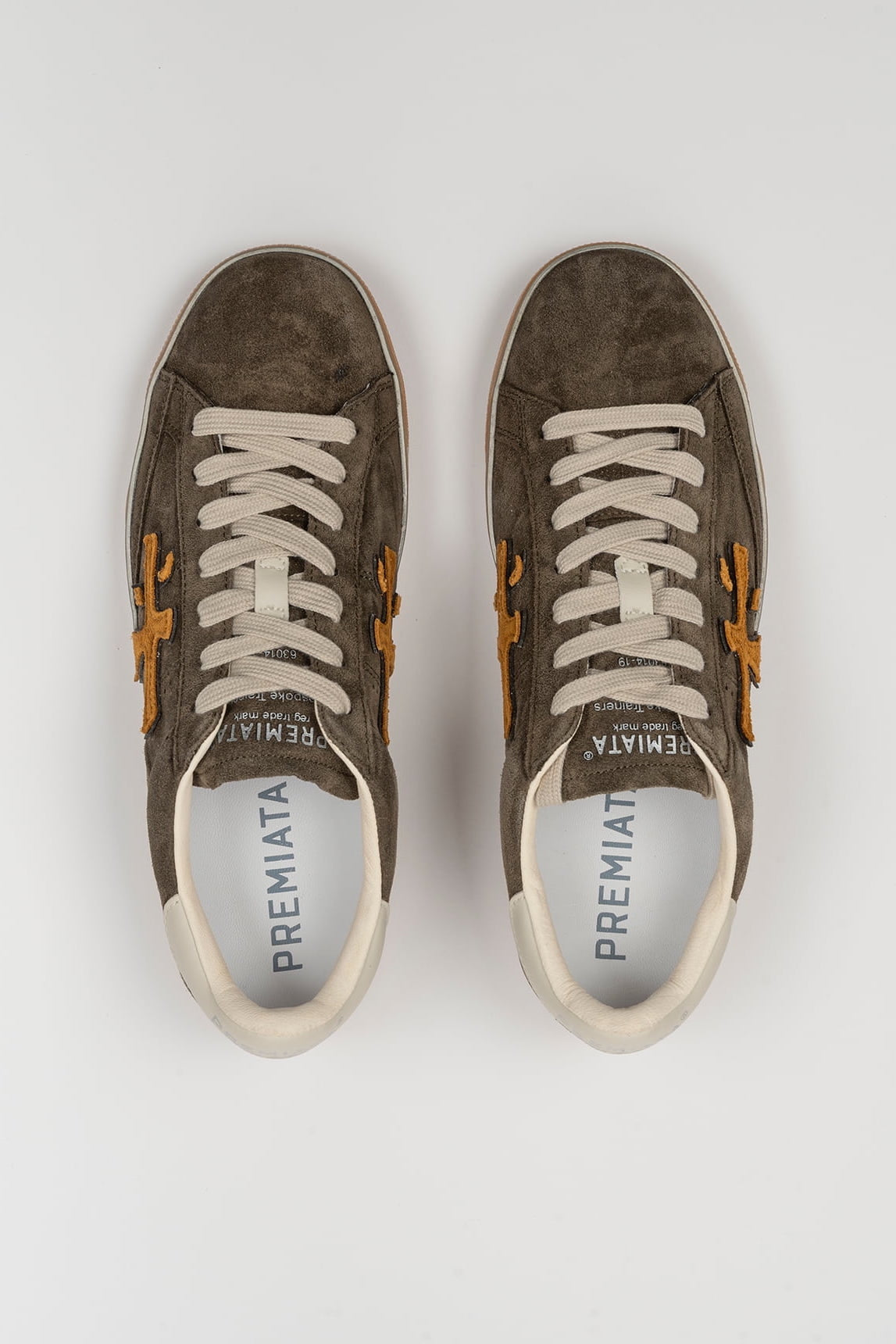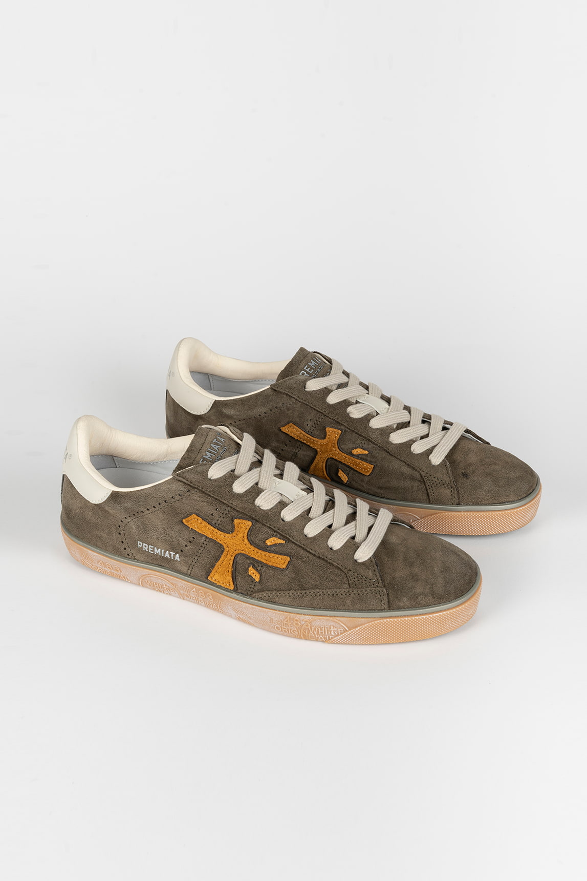 Las Steven 7627 de Premiata apuestan por la sencillez premium con un toque de color: ante suave en oliva y logo mostaza que combinan con todo. Perfectas para looks casual de diario con vaqueros, chinos o sastrería relajada.