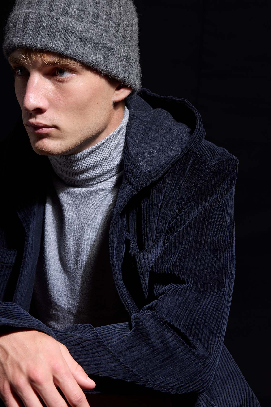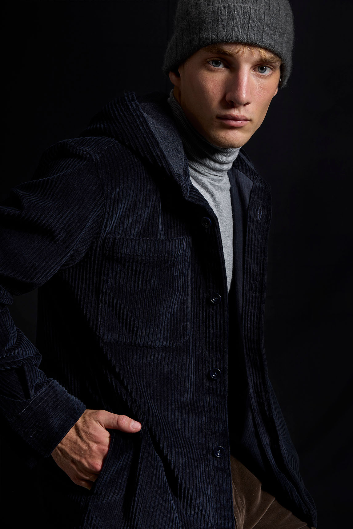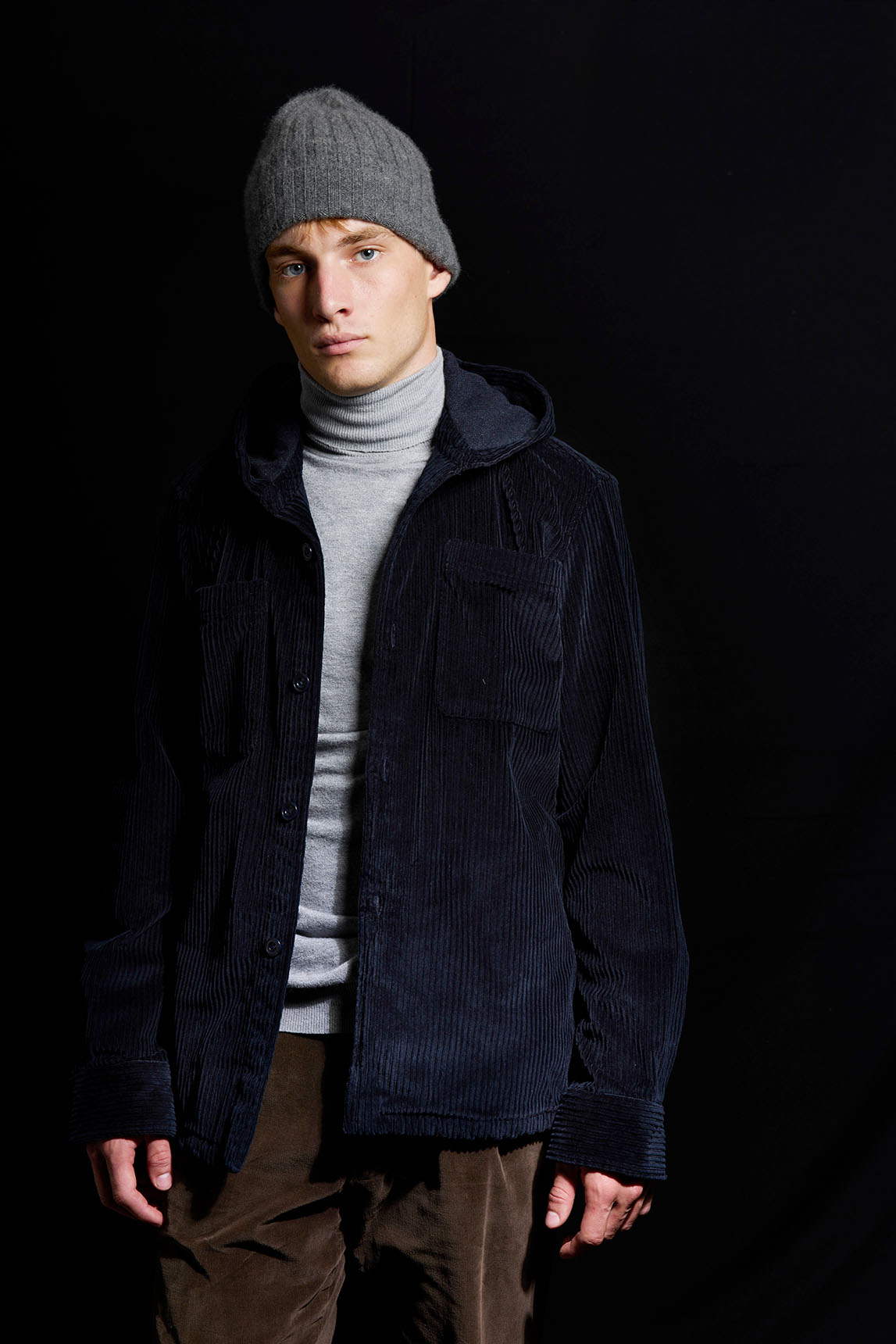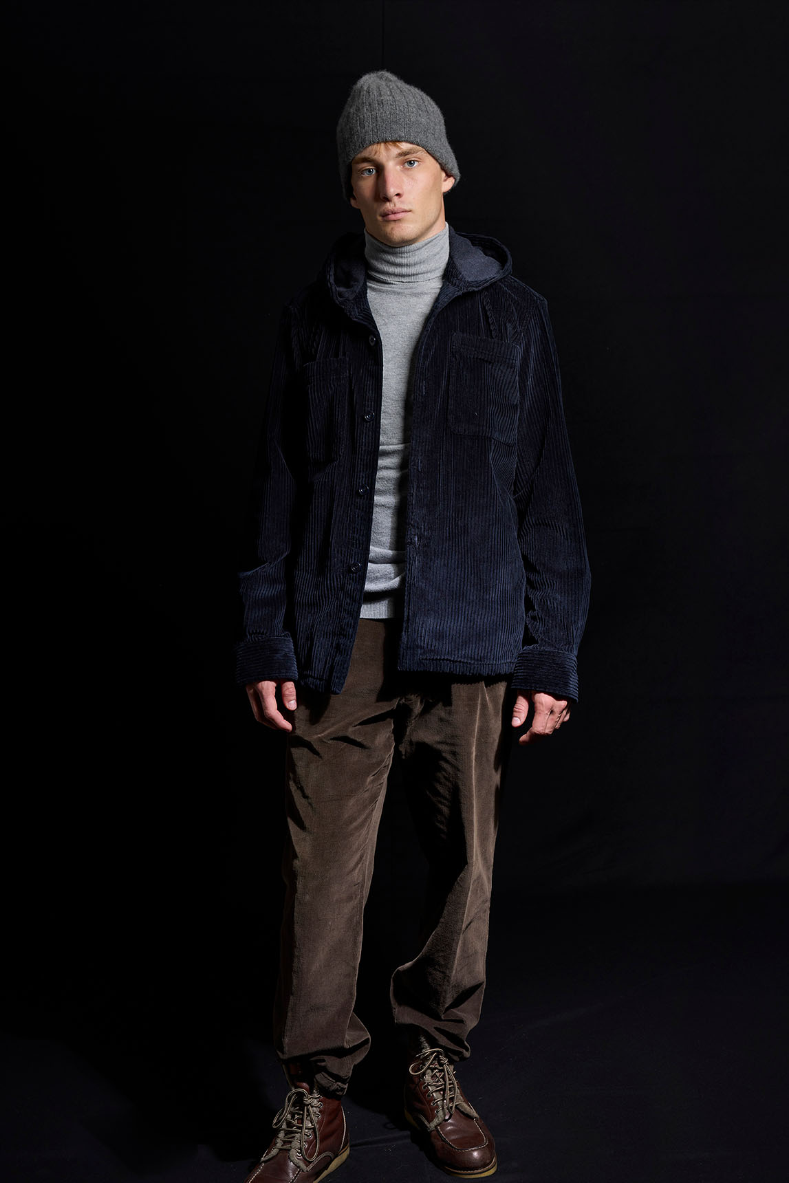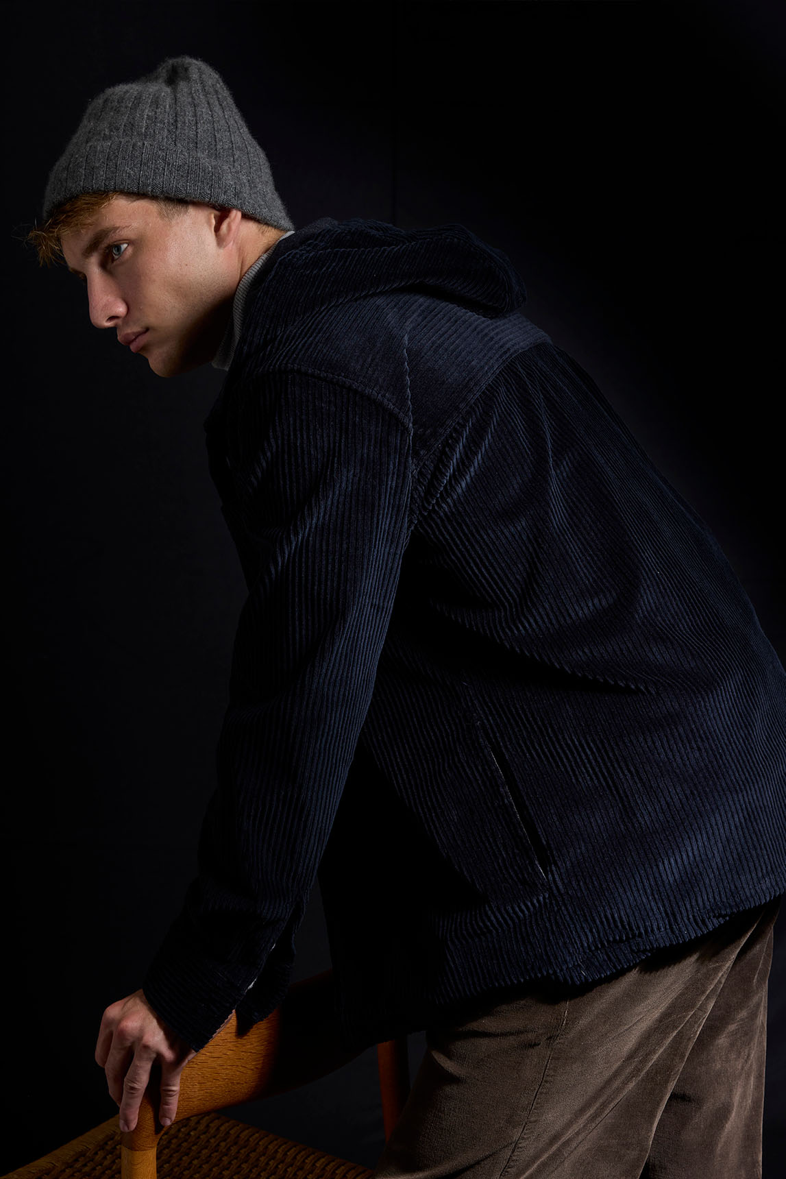 La propuesta de Koike funciona como camisa gruesa o como capa ligera: la pana de canalé y la capucha suman un punto utilitario muy actual que queda perfecta sobre camiseta, polo o cuello cisne en looks casual de entretiempo.
