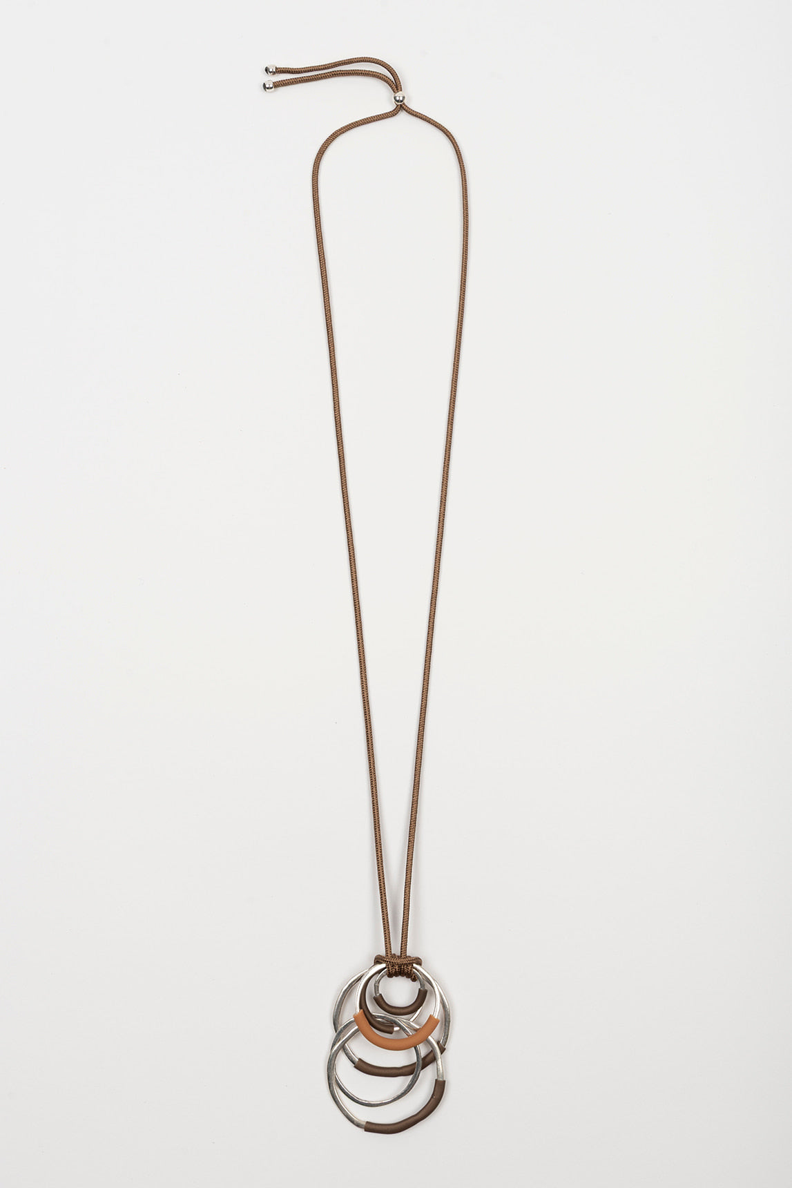 Este collar largo destaca por su colgante de aros metálicos de acabado plateado combinados con piezas curvas de goma en tonos marrón, teja y chocolate. El diseño aporta movimiento y contraste, ideal para looks casuales con personalidad. El cordón marrón ajustable lo hace versátil y cómodo, perfecto para realzar prendas lisas o monocromáticas.