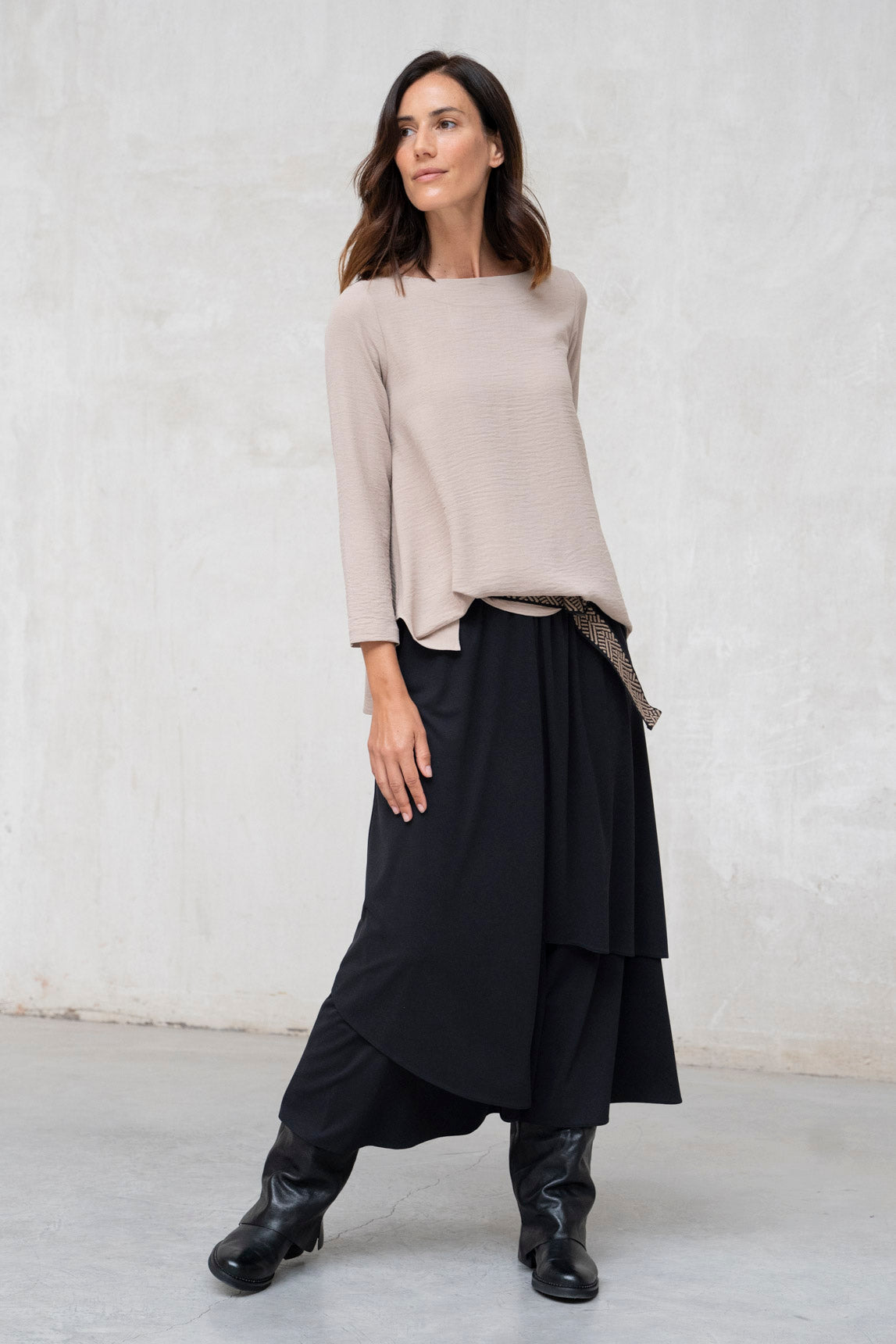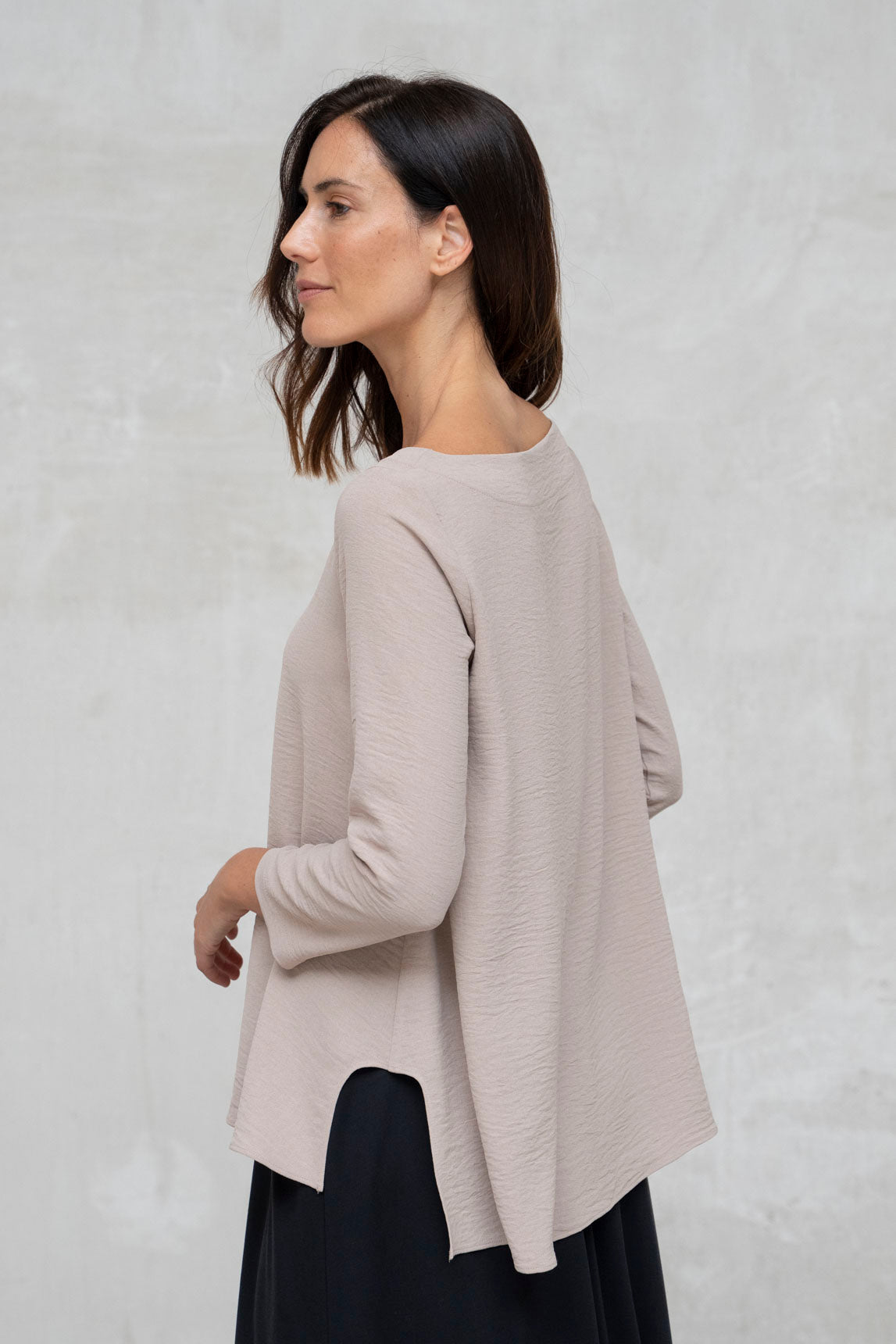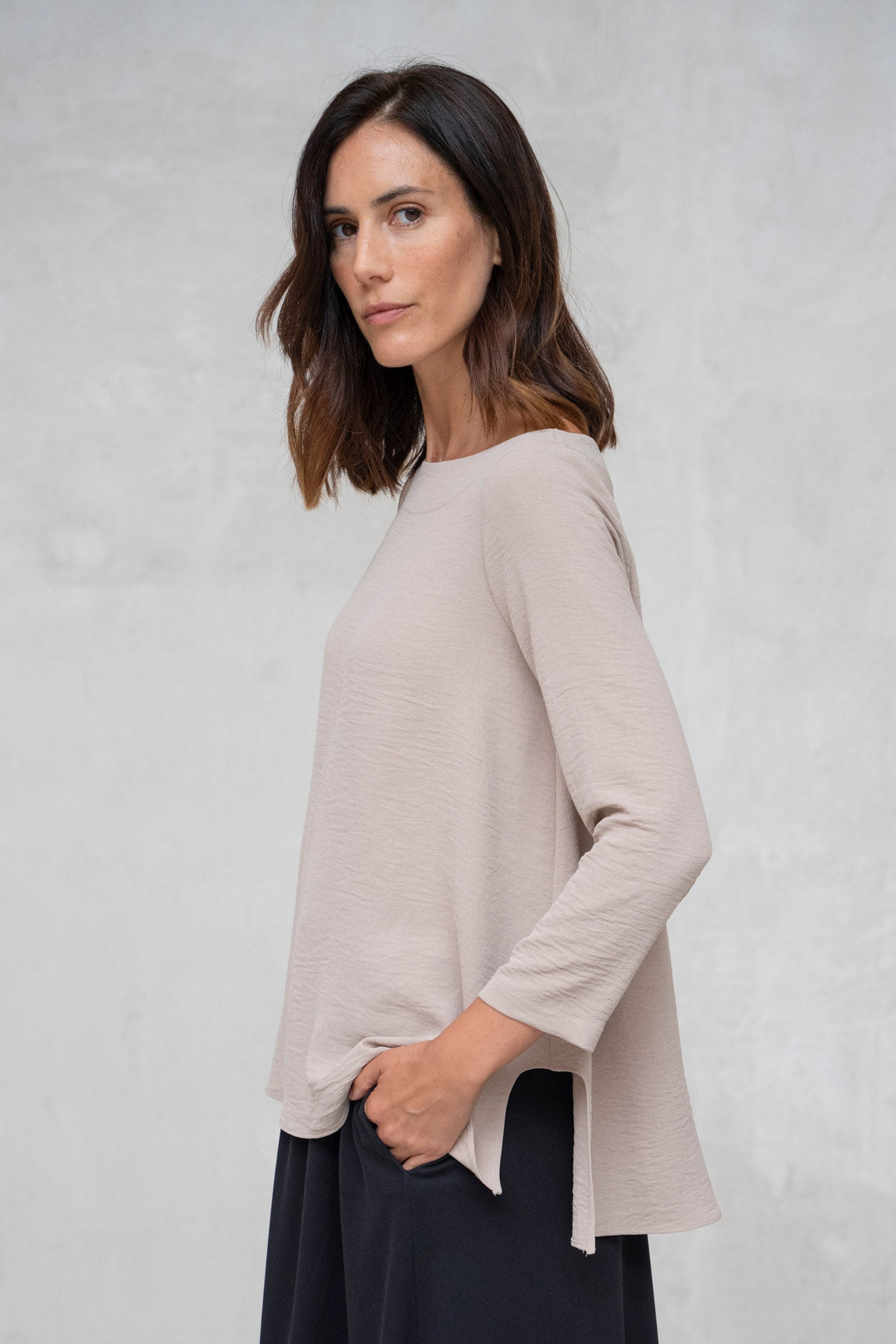 El top Trevi arena es una prenda atemporal que destaca por su sencillez y elegancia. Su corte evasé ofrece una silueta fluida y favorecedora, mientras que el escote barco aporta un toque femenino y sofisticado. Confeccionada en un tejido ligero de textura discreta, es perfecta para combinar con pantalones rectos, faldas midi o vaqueros, tanto en looks de oficina como en conjuntos más casuales.