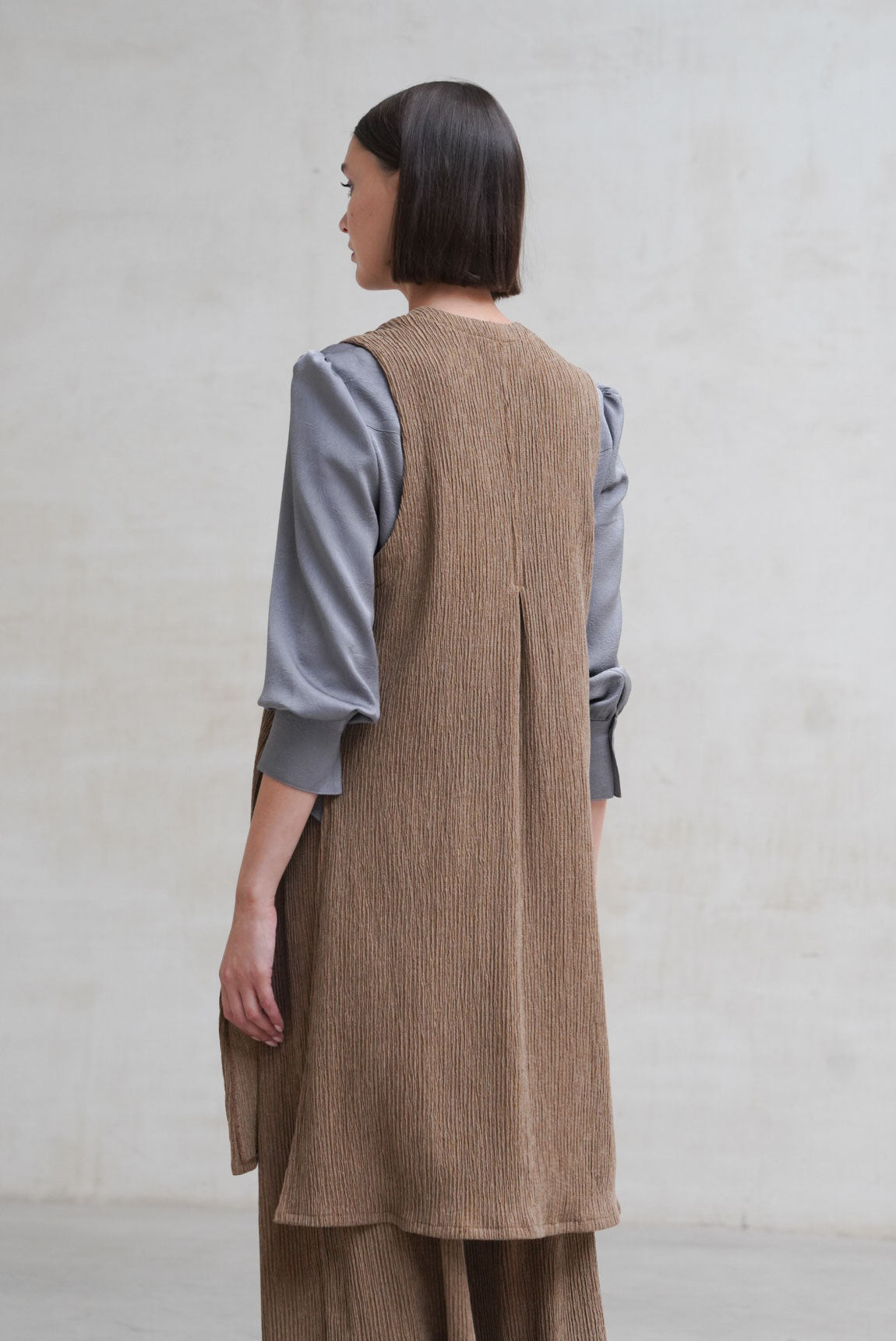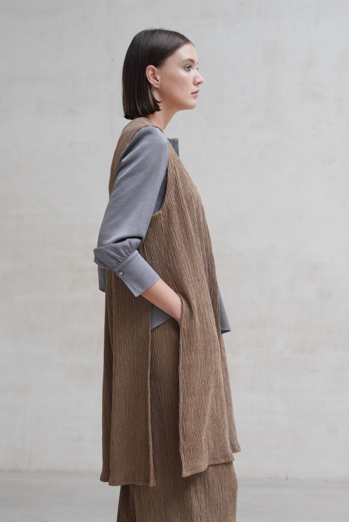- Confeccionado en un tejido acanalado fluido que aporta caída y movimiento.
