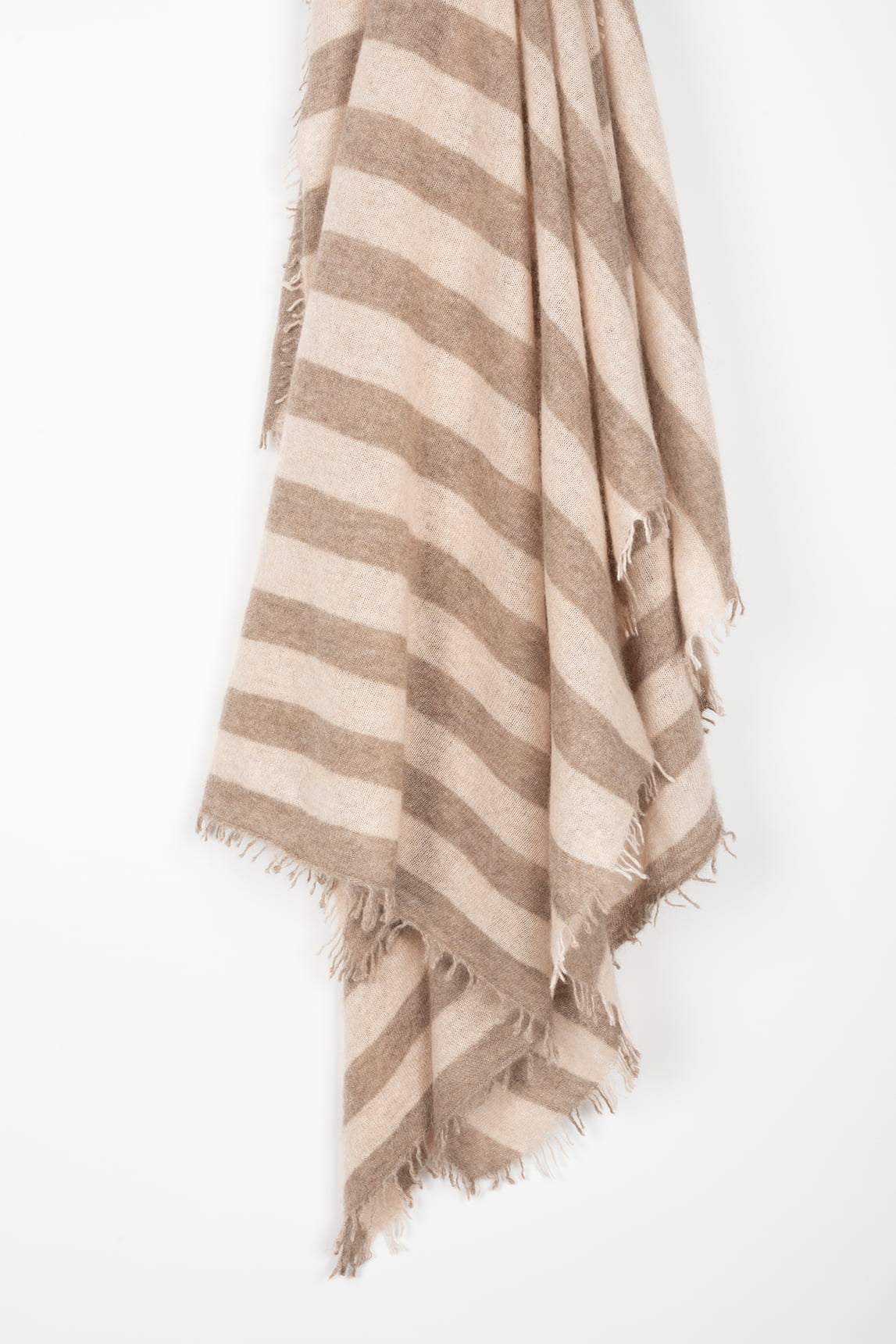 Descubre el fular rayas beige de Rivera, de inspiración invernal con diseño de rayas anchas en beige y topo. Confeccionado en cachemir ofrece una textura envolvente perfecta para aportar abrigo sin perder ligereza. Su patrón a rayas diagonales aporta dinamismo y combina fácilmente con prendas lisas o en la gama de los tonos tierra. Los bordes con flecos aportan un acabado relajado que refuerza su carácter casual y natural. Una opción versátil y funcional para el día a día, ideal como complemento en looks urbanos, neutros o de aire bohemio.
