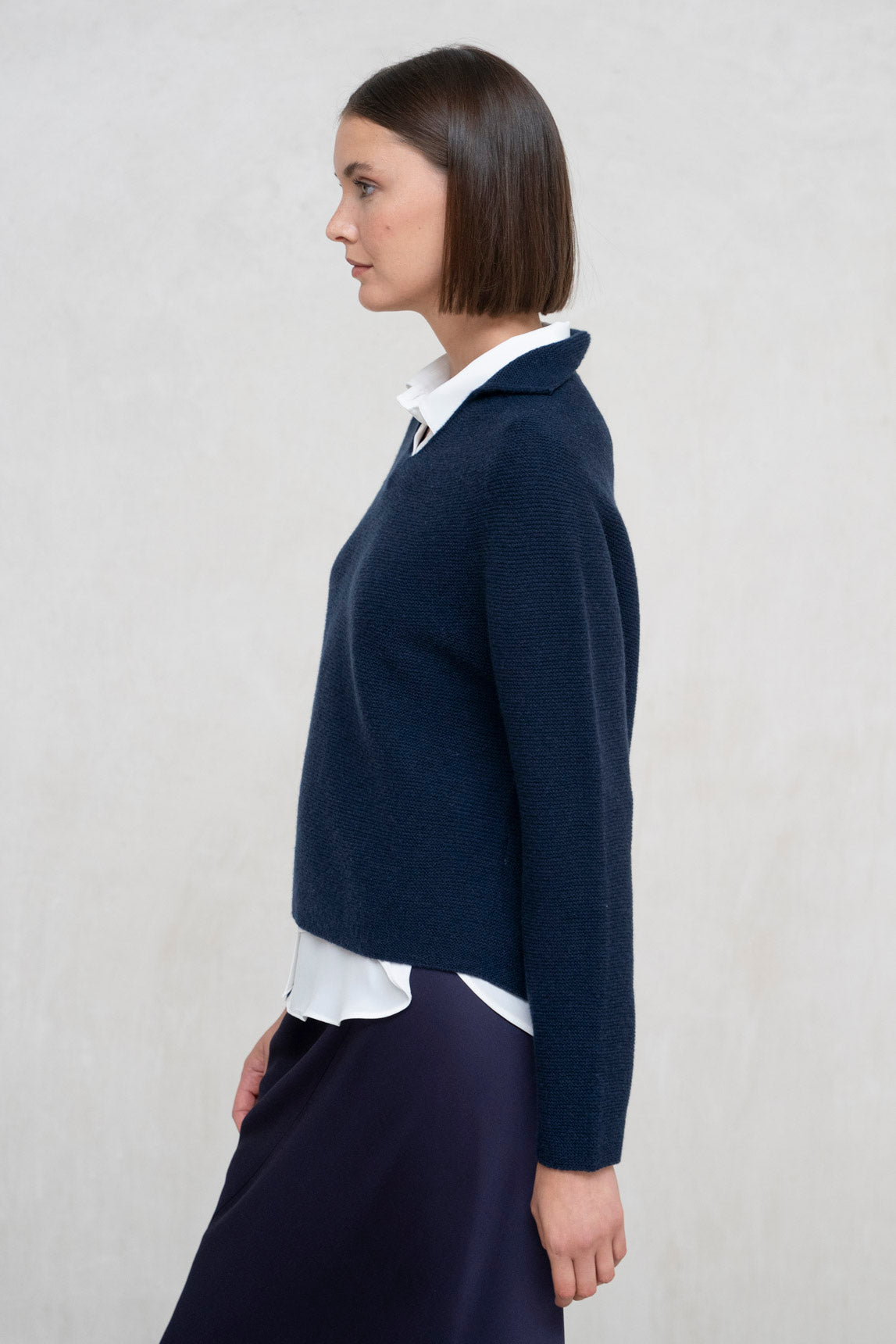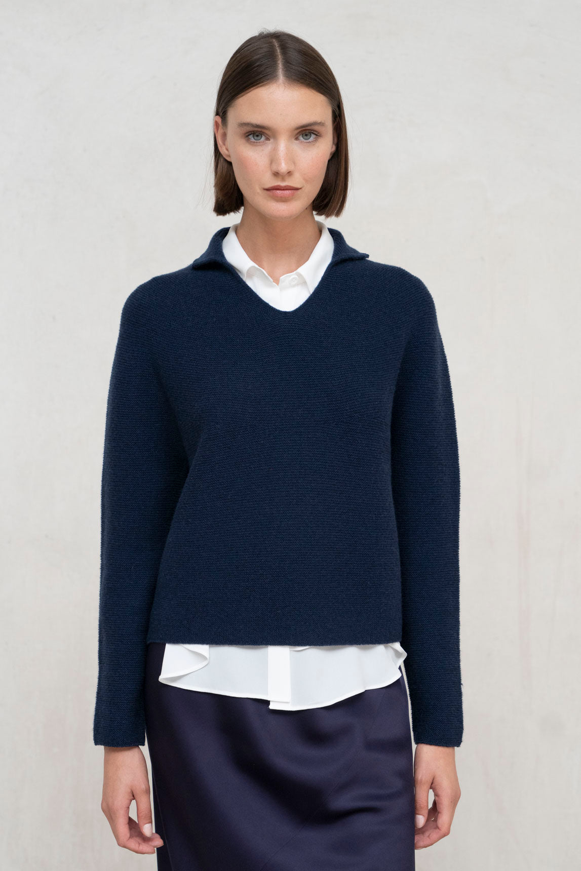 El jersey Trento azul marino combina un diseño atemporal con un toque distintivo gracias a su cuello pico con solapa sutil. Su tejido de tacto suave y agradable garantiza confort y calidez, mientras que su corte recto lo convierte en una pieza versátil que podrás llevar en looks casuales o más formales. El elegante tono azul marino aporta sobriedad y sofisticación, ideal para la temporada de otoño e invierno.