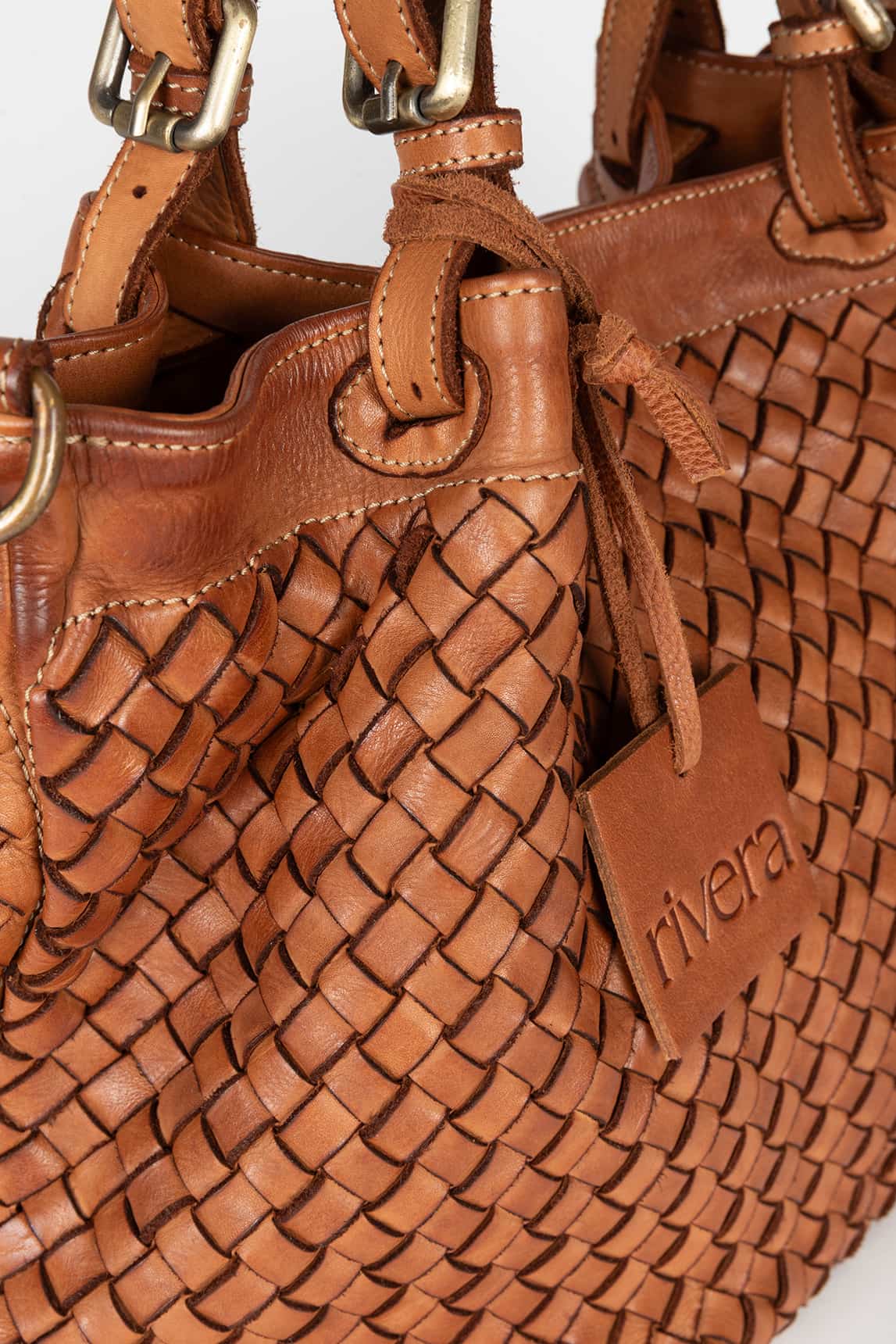 - Bolso de piel trenzada en color camel.