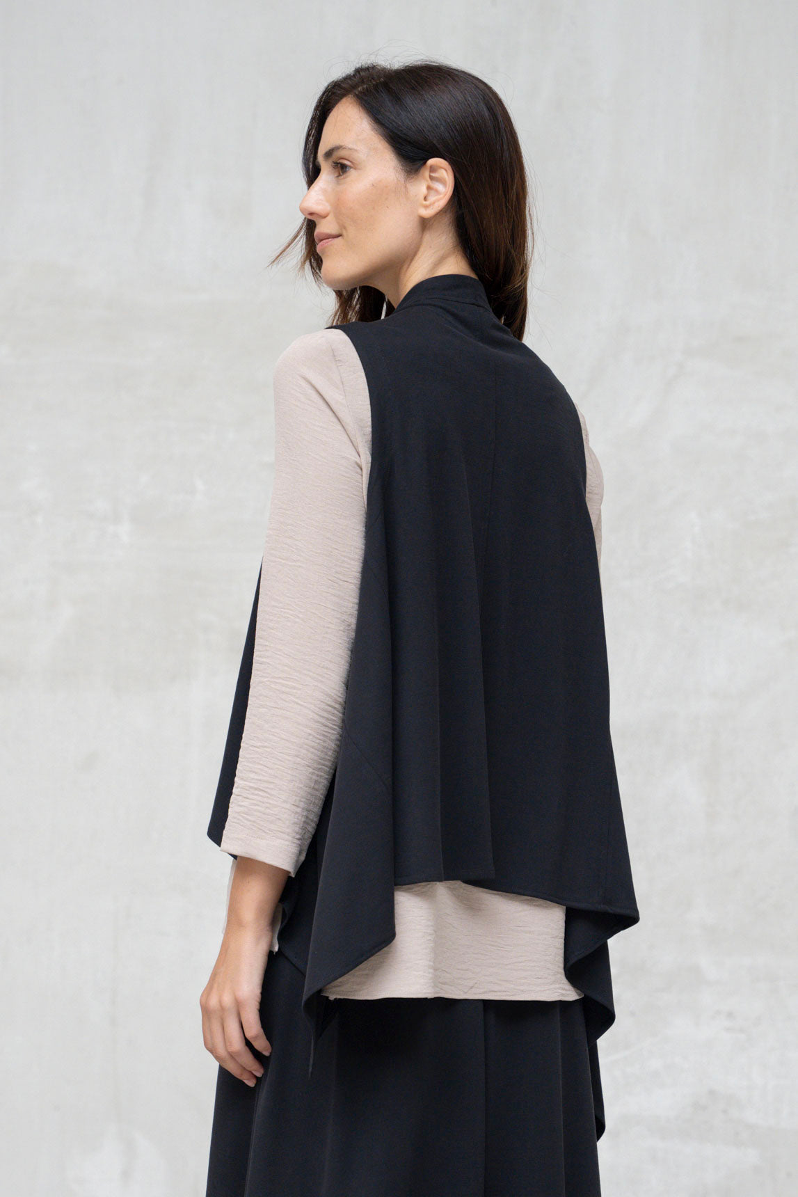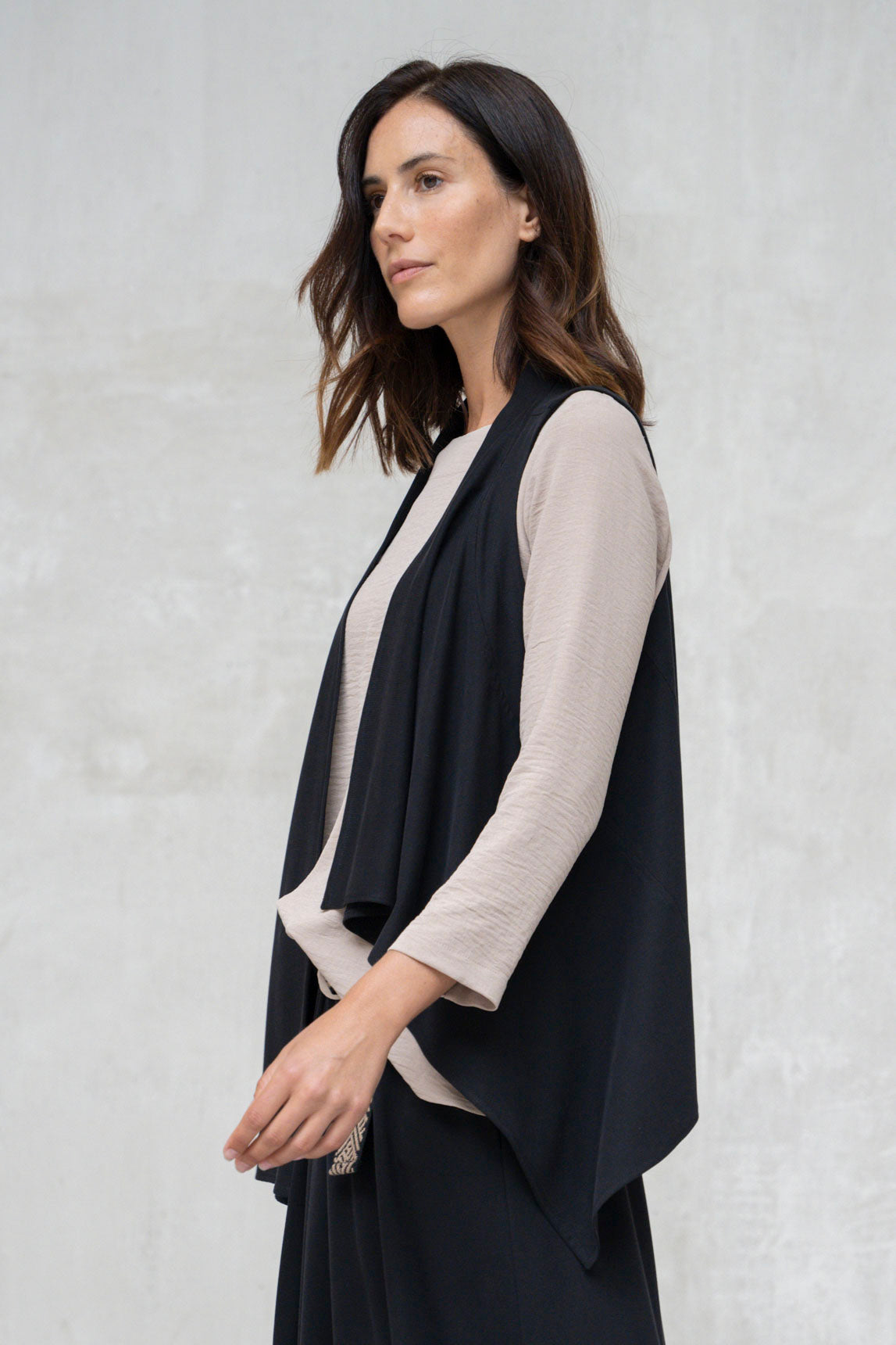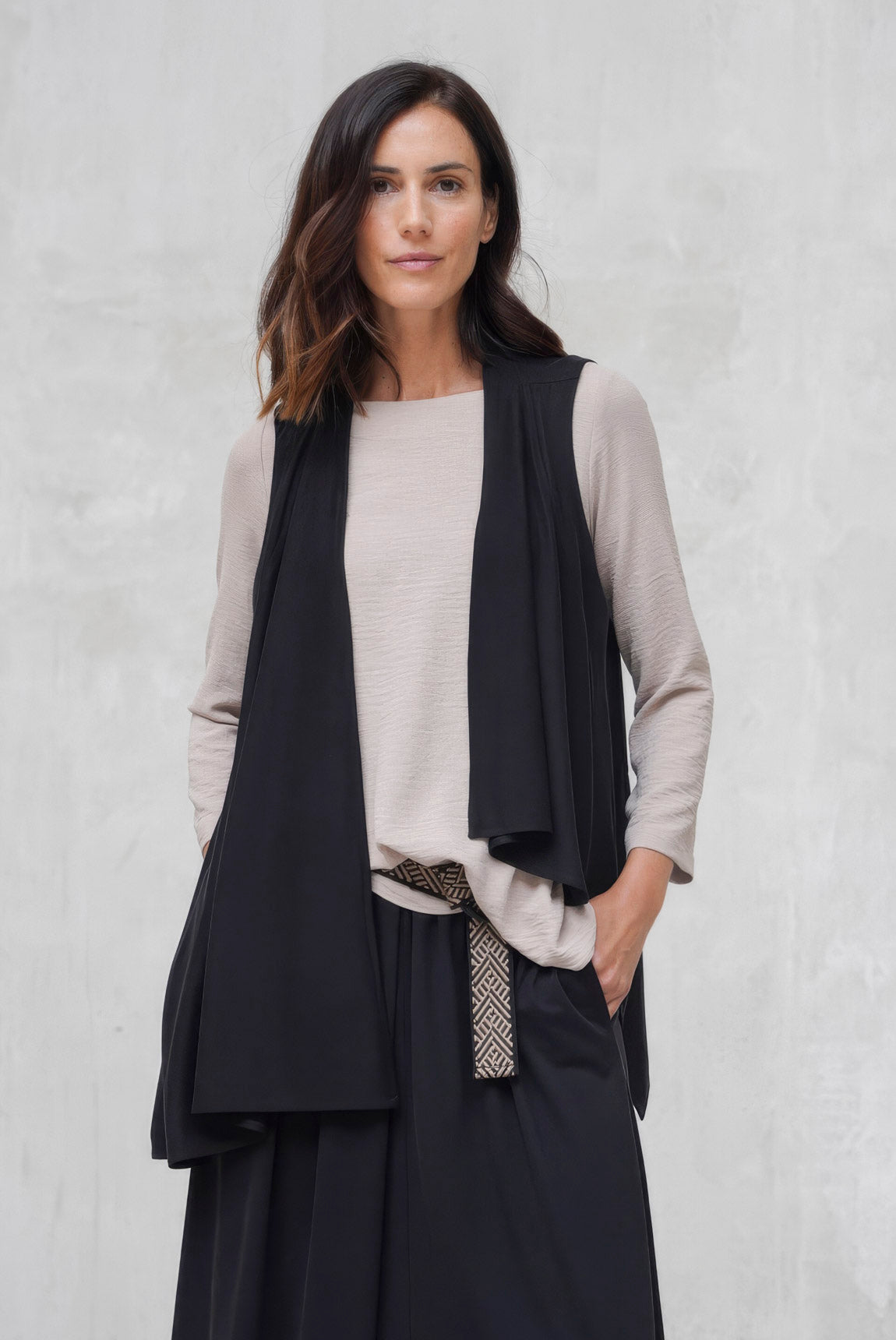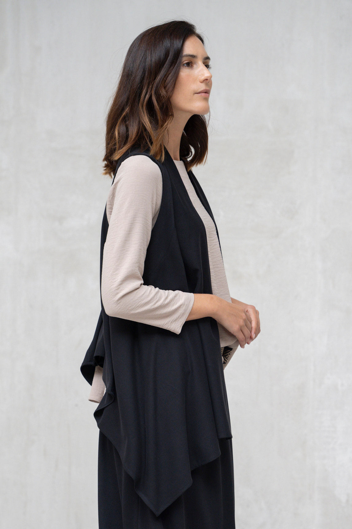 El chaleco Varenna negro es un básico atemporal que aporta sofisticación instantánea a cualquier conjunto. Su diseño abierto y la fluidez de su tejido lo convierten en una pieza versátil, perfecta para superponer y crear looks elegantes tanto de día como de noche.